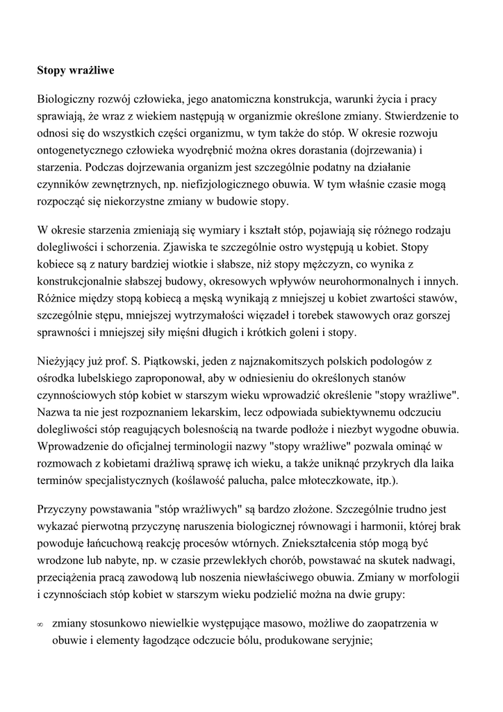 Stopy wrażliwe Biologiczny rozwój człowieka, jego anatomiczna konstrukcja, warunki życia i pracy sprawiają, że wraz z wiekiem następują w organizmie określone zmiany. Stwierdzenie to odnosi się do wszystkich części organizmu, w tym także do stóp. W okresie rozwoju ontogenetycznego człowieka wyodrębnić można okres dorastania (dojrzewania) i starzenia. Podczas dojrzewania organizm jest szczególnie podatny na działanie czynników zewnętrznych, np. niefizjologicznego obuwia. W tym właśnie czasie mogą rozpocząć się niekorzystne zmiany w budowie stopy. W okresie starzenia zmieniają się wymiary i kształt stóp, pojawiają się różnego rodzaju dolegliwości i schorzenia. Zjawiska te szczególnie ostro występują u kobiet. Stopy kobiece są z natury bardziej wiotkie i słabsze, niż stopy mężczyzn, co wynika z konstrukcjonalnie słabszej budowy, okresowych wpływów neurohormonalnych i innych. Różnice między stopą kobiecą a męską wynikają z mniejszej u kobiet zwartości stawów, szczególnie stępu, mniejszej wytrzymałości więzadeł i torebek stawowych oraz gorszej sprawności i mniejszej siły mięśni długich i krótkich goleni i stopy. Nieżyjący już prof. S. Piątkowski, jeden z najznakomitszych polskich podologów z ośrodka lubelskiego zaproponował, aby w odniesieniu do określonych stanów czynnościowych stóp kobiet w starszym wieku wprowadzić określenie "stopy wrażliwe". Nazwa ta nie jest rozpoznaniem lekarskim, lecz odpowiada subiektywnemu odczuciu dolegliwości stóp reagujących bolesnością na twarde podłoże i niezbyt wygodne obuwia. Wprowadzenie do oficjalnej terminologii nazwy "stopy wrażliwe" pozwala ominąć w rozmowach z kobietami drażliwą sprawę ich wieku, a także uniknąć przykrych dla laika terminów specjalistycznych (koślawość palucha, palce młoteczkowate, itp.). Przyczyny powstawania "stóp wrażliwych" są bardzo złożone. Szczególnie trudno jest wykazać pierwotną przyczynę naruszenia biologicznej równowagi i harmonii, której brak powoduje łańcuchową reakcję procesów wtórnych. Zniekształcenia stóp mogą być wrodzone lub nabyte, np. w czasie przewlekłych chorób, powstawać na skutek nadwagi, przeciążenia pracą zawodową lub noszenia niewłaściwego obuwia. Zmiany w morfologii i czynnościach stóp kobiet w starszym wieku podzielić można na dwie grupy: • zmiany stosunkowo niewielkie występujące masowo, możliwe do zaopatrzenia w obuwie i elementy łagodzące odczucie bólu, produkowane seryjnie; • zmiany pogłębione, wymagające indywidualnego zaopatrzenia ortopedycznego. Do najczęściej spotykanych zmian w stopach wrażliwych zaliczyć można: • • stopy o podwyższonej tęgości - na podstawie badań antropometrycznych przyjęto w Polsce średnią tęgość G, jednak część kobiet ma większy wymiar obwodu płaskostopie podłużne - obniżenie i spłaszczenie łuku podłużnego stopy; • płaskostopie poprzeczne - sklepienie poprzeczne stóp uległo spłaszczeniu, a czasem nawet uwypukleniu ku dołowi, obciążenie przejmują wówczas głowy II i III kości śródstopia, a kontakt stopy z twardym podłożem jest wtedy bolesny; • paluch koślawy - zniekształcenie polega na szpotawym ustawieniu I-ej kości śródstopia, wystawaniu ku stronie przyśrodkowej głowy tej kości oraz na odchyleniu palucha ku stronie bocznej (zewnętrznej); • palce młoteczkowate - zniekształcenie polega na kątowym zgięciu stawu międzypaliczkowego; • ostroga piętowa - to narośl kostna powstająca na obciążonej powierzchni guza kości piętowej, jej obecność wywołuje bóle, poważnie ograniczając zdolność stania i chodzenia; zmiany w tkankach miękkich stopy - prowadzą do takich schorzeń jak nagniotki (odciski), modzele, brodawki, zapalenie pochewek ścięgnistych, zapalenie kaletek maziowych, wrastające paznokcie, żylaki, itp.; • Procent osób o stopach wrażliwych wzrasta wraz z wiekiem i tak, w wieku 24 lat - 51% kobiet ma stopy zniekształcone, u 40-letnich - 63%, a u kobiet powyżej 50 lat aż u 80% zaobserwowano deformacje stóp. Skoncentrowanie się na problemach stóp kobiet nie oznacza, że stopy wrażliwe nie występują wśród mężczyzn, jest to jednak zjawisko o znacznie mniejszej skali. Bolesne zmiany zachodzące w stopach łączą się najczęściej z wiekiem. Znacząca część osób starszych, szczególnie kobiet, ma stopy wrażliwe. Osobom tym należy pomóc w złagodzeniu bólu i ułatwić poruszanie się.. Obuwie przeznaczone dla stóp wrażliwych powinno spełniać następujące wymagania: • • wymiary wnętrza obuwia dostosowane do wymiarów stóp wrażliwych, ze szczególnym uwzględnieniem obwodu przodostopia; szeroki i wysoki czubek pozwalający na swobodne ułożenie zniekształconych palców; • • • • • • • materiały na wierzchy, podszewki i wyściółki obuwia o bardzo dobrych właściwościach higienicznych (przepuszczalność pary wodnej, sorbcja, desorbcja pary wodnej) i reologicznych (łatwość dostosowania do kształtu i wymiarów stóp); uwzględnienie w konstrukcji obuwia szczególnie wrażliwych miejsc stopy - okolicy stawu palucha i V-go palca, podbicia, ścięgna Achillesa, kostki zewnętrznej i wewnętrznej i niestosowanie w tych miejscach łączeń materiałów, grubszych szyć, itp.; wykorzystywanie różnego rodzaju regulacji zapięć (gumy, sznurowania, rzepy, klamerki), co ułatwia wzuwalność obuwia i pozwala na dopasowanie buta do różnych wymiarów stóp; spody lekkie, elastyczne (łatwo zginające się na linii stawów śródstopnopaliczkowych); sprężyste, co umożliwia wytłumianie wstrząsów, jakie powstają w czasie chodzenia po twardym podłożu; na tyle grube, aby nie odczuwało się nierówności podłoża; o właściwościach przeciwpoślizgowych; w obuwiu damskim wysokość obcasa nie przekraczająca 3,5 cm, a jego kształt zapewniający poczucie stabilności (pewności) w czasie poruszania