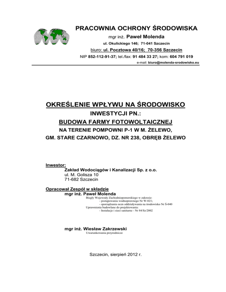 PRACOWNIA OCHRONY ŚRODOWISKA mgr inż. Paweł Molenda ul. Okulickiego 146; 71-041 Szczecin biuro: ul. Pocztowa 40/16; 70-356 Szczecin NIP 852-112-91-37; tel./fax: 91 484 33 27; kom: 604 791 019 e-mail: [email protected] OKREŚLENIE WPŁYWU NA ŚRODOWISKO INWESTYCJI PN.: BUDOWA FARMY FOTOWOLTAICZNEJ NA TERENIE POMPOWNI P-1 W M. ŻELEWO, GM. STARE CZARNOWO, DZ. NR 238, OBRĘB ŻELEWO Inwestor: Zakład Wodociągów i Kanalizacji Sp. z o.o. ul. M. Golisza 10 71-682 Szczecin Opracował Zespół w składzie mgr inż. Paweł Molenda Biegły Wojewody Zachodniopomorskiego w zakresie: - postępowania wodnoprawnego Nr W-021; - sporządzania ocen oddziaływania na środowisko Nr Ś-040 Uprawnienia budowlane do projektowania: - Instalacje i sieci sanitarne - Nr 84/Sz/2002 mgr inż. Wiesław Zakrzewski Uwarunkowania przyrodnicze Szczecin, sierpień 2012 r. SPIS TREŚCI 1. WSTĘP.................................................................................................................................................. 3 2. PODSTAWA PRAWNA WYKONANIA OPRACOWANIA. .............................................................. 3 3. CHARAKTERYSTYKA ŚRODOWISKA PRZYRODNICZEGO. ...................................................... 4 3.1. ŚRODOWISKO PRZYRODNICZE......................................................................................................................... 4 3.2. DYREKTYWY MIĘDZYNARODOWE.................................................................................................................... 4 3.3. PRAWNE FORMY OCHRONY PRZYRODY. ............................................................................................................ 5 4. WPŁYW NA ŚRODOWISKO PRZYRODNICZE. .............................................................................. 7 4.1. FAZA BUDOWY. ........................................................................................................................................... 7 4.2. FAZA EKSPLOATACJI. .................................................................................................................................... 9 5. WNIOSKI. ........................................................................................................................................... 10 6. SKŁAD ZESPOŁU. ............................................................................................................................ 10 Załączniki: 1. Wezwanie Wójta Gminy Stare Czarnowo z dnia 31 lipca 2012 r. dot. inwestycji w m. Żelewo, dz. nr 238. 2. Lokalizacja przedsięwzięcia w stosunku do obszarów NATURA 2000. 3. Lokalizacja terenów na tle Waloryzacji Przyrodniczej Gminy Stare Czarnowo. 2 1. WSTĘP. Niniejsze opracowanie zostało opracowane w związku z wezwaniem Wójta Gminy Stare Czarnowo z dnia 31 lipca 2012 r. dot. inwestycji - BUDOWA FARMY FOTOWOLTAICZNEJ w m. Żelewo, dz. nr 238, w związku z położeniem inwestycji w granicach i bezpośrednio przy granicy obszaru Natura 2000, o określenie potencjalnego oddziaływania na obszary NATURA 2000. 2. PODSTAWA PRAWNA WYKONANIA OPRACOWANIA. 1. Ustawa z dnia 03.10.2008 r. o udostępnianiu informacji o środowisku i jego ochronie, udziale społeczeństwa w ochronie środowiska oraz o ocenach oddziaływania na środowisko (Dz. U. nr 199, poz. 1227 ze zm.). 2. Ustawa z dnia 16.04.2004 r. o ochronie przyrody (tekst jednolity z 2009 r. Dz. U. nr 151, poz. 1220 ze zm.). 3. Rozporządzenie Ministra Środowiska z dnia 13.04.2010 r. w sprawie siedlisk przyrodniczych oraz gatunków będących przedmiotem zainteresowania Wspólnoty, a także kryteriów wyboru obszarów kwalifikujących się do uznania lub wyznaczenia jako obszary Natura 2000 (Dz. U. nr 77, poz. 510). 4. Rozporządzenie Ministra Środowiska z dnia 05.01.2012 r. w sprawie gatunków dziko występujących roślin objętych ochroną (Dz. U. z 2012, poz. 81). 5. Rozporządzenie Ministra Środowiska z dnia 09.07.2004 r. w sprawie gatunków dziko występujących grzybów objętych ochroną (Dz. U. nr 168, poz. 1765). 6. Rozporządzenie Ministra Środowiska z dnia 14.08.2001 r. w sprawie określenia rodzajów siedlisk przyrodniczych podlegających ochronie (Dz. U. nr 92, poz. 1029). 7. Rozporządzenie Ministra Środowiska z dnia 12.01.2011 r. w sprawie obszarów specjalnej ochrony ptaków (Dz. U. nr 25, poz. 133). 8. Rozporządzenie Ministra Środowiska z dnia 12.10.2011 r. w sprawie ochrony gatunkowej zwierząt (Dz. U. nr 237, poz. 1419). 9. Dyrektywa 92/43/EWG z dnia 21.05.1992 r. o ochronie siedlisk przyrodniczych oraz dzikiej fauny i flory (Dyrektywa Siedliskowa) (Dz. U. L 206 z 22.7.1992 r. ze zm.). 10. Dyrektywa 79/409/EWG z dnia 02.04.1979 r. o ochronie dzikiego ptactwa (Dyrektywa Ptasia) (Dz. U. L 103 z 25.4.1979 r. ze zm.). 11. Dyrektywa Parlamentu Europejskiego i Rady 2009/147/WE z dnia 30 listopada 2009 r. w sprawie ochrony dzikiego ptactwa. 12. Ustawa z dnia 13 kwietnia 2007 r. o zapobieganiu szkodom w środowisku i ich naprawie (Dz. U. z 2007 r. Nr 75, poz. 493). 3 3. CHARAKTERYSTYKA ŚRODOWISKA PRZYRODNICZEGO. 3.1. Środowisko przyrodnicze. Teren opracowania obejmuje teren pompowni P-1 w miejscowości Żelewo i w całości jest ogrodzony. Przeważającą powierzchnię ziemi zajmują pielęgnowane trawniki, natomiast drzewa rosną w formie pasów i grup przy ogrodzeniach i pełnią funkcje zieleni izolacyjnej. Na trawnikach oraz na obrzeżach terenu opracowania stwierdzono rozwój typowych gatunków roślin reprezentujących zbiorowiska synantropijne. Na podstawie przeprowadzonych wizji terenowych stwierdza się, że w terenie opracowania istniejące gatunki roślin nie tworzą chronionych siedlisk przyrodniczych na podstawie Rozporządzenia Ministra Środowiska z dnia 13 kwietnia 2010 r. w sprawie siedlisk przyrodniczych oraz gatunków będących przedmiotem zainteresowania Wspólnoty, a także kryteriów wyboru obszarów kwalifikujących się do uznania lub wyznaczenia jako obszary Natura 2000 (Dz.U. Nr 77, poz. 51