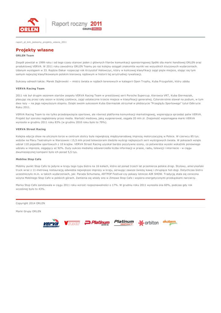 raport_pl_kim_jestesmy_projekty_wlasne_2011 Projekty własne ORLEN Team Zespół powstał w 1999 roku i od tego czasu stanowi jeden z głównych filarów komunikacji sponsoringowej Spółki dla marki handlowej ORLEN oraz produktowej VERVA. W 2011 roku zawodnicy ORLEN Teamu po raz kolejny osiągali znakomite wyniki we wszystkich kluczowych wydarzeniach. Udanym występem w 33. Rajdzie Dakar rozpoczął rok Krzysztof Hołowczyc, który w końcowej klasyfikacji zajął piąte miejsce, stając się tym samym najwyżej klasyfikowanym polskim kierowcą rajdowym w historii tej arcytrudnej rywalizacji. Sukcesy odnosili także: Marek Dąbrowski − mistrz świata w rajdach terenowych w kategorii Open Trophy, Kuba Przygoński, który zdoby VERVA Racing Team 2011 rok był drugim sezonem startów zespołu VERVA Racing Team w prestiżowej serii Porsche Supercup. Kierowca VRT, Kuba Giermaziak, plasując się przez cały sezon w ścisłej czołówce, zajął ostatecznie trzecie miejsce w klasyfikacji generalnej. Czterokrotnie stawał na podium, w tym dwa razy − na jego najwyższym stopniu. Dzięki swoim sukcesom Kuba Giermaziak otrzymał w plebiscycie "Przeglądu Sportowego" tytuł Odkrycie Roku 2011. VERVA Racing Team to nie tylko przedsięwzięcie sportowe, ale również platforma komunikacji marketingowej, wspierająca sprzedaż paliw VERVA. Projekt był szeroko nagłaśniany przez media. Wartość mediowa, jaką wygenerował, sięgała 20 mln zł. Znajomość wspomagana marki VERVA wynosiła w grudniu 2011 roku 83% (w grudniu 2010 roku było to 79%). VERVA Street Racing Kolejna edycja show na ulicznym torze w centrum stolicy była największą międzynarodową imprezą motoryzacyjną w Polsce. W czerwcu 85 tys. widzów na Placu Teatralnym w Warszawie i 15,5 mln przed telewizorami śledziło wyścigi najlepszych serii wyścigowych świata. W pokazach wzięło udział 110 pojazdów sportowych z 10 krajów. VERVA Street Racing uzyskał bardzo pozytywne oceny, co potwierdza wysoki wskaźnik ponownego udziału w imprezie, sięgający aż 92%. Duży sukces medialny odzwierciedla liczba informacji w prasie, radiu, telewizji i internecie - w ciągu dwumiesięcznej kampanii było ich ponad 5,5 tys. Mobilne Stop Cafe Mobilny punkt Stop Cafe to jedyne w kraju tego typu bistro na 16 kołach, które od ponad trzech lat przemierza polskie drogi. Stylowy, amerykański truck wraz z 11-metrową restauracją odwiedza największe imprezy w kraju, serwując zawsze świeżą kawę i chrupiące hot-dogi. Dotychczas bistro uczestniczyło m.in. w takich wydarzeniach, jak: Parada Schumana, ARTPOP Festival czy pokazy lotnicze AIR SHOW. Tradycją stała się coroczna wizyta Mobilnego Stop Cafe w polskich górach. Zamienia się wtedy ono w Zimowe Stop Cafe i wspiera energetycznymi przekąskami narciarzy. Marka Stop Cafe zanotowała w ciągu 2011 roku wzrost rozpoznawalności o 17%. W grudniu roku 2011 wynosiła ona 60%, podczas gdy rok wcześniej było to 43%. Copyright 2014 ORLEN Marki Grupy ORLEN