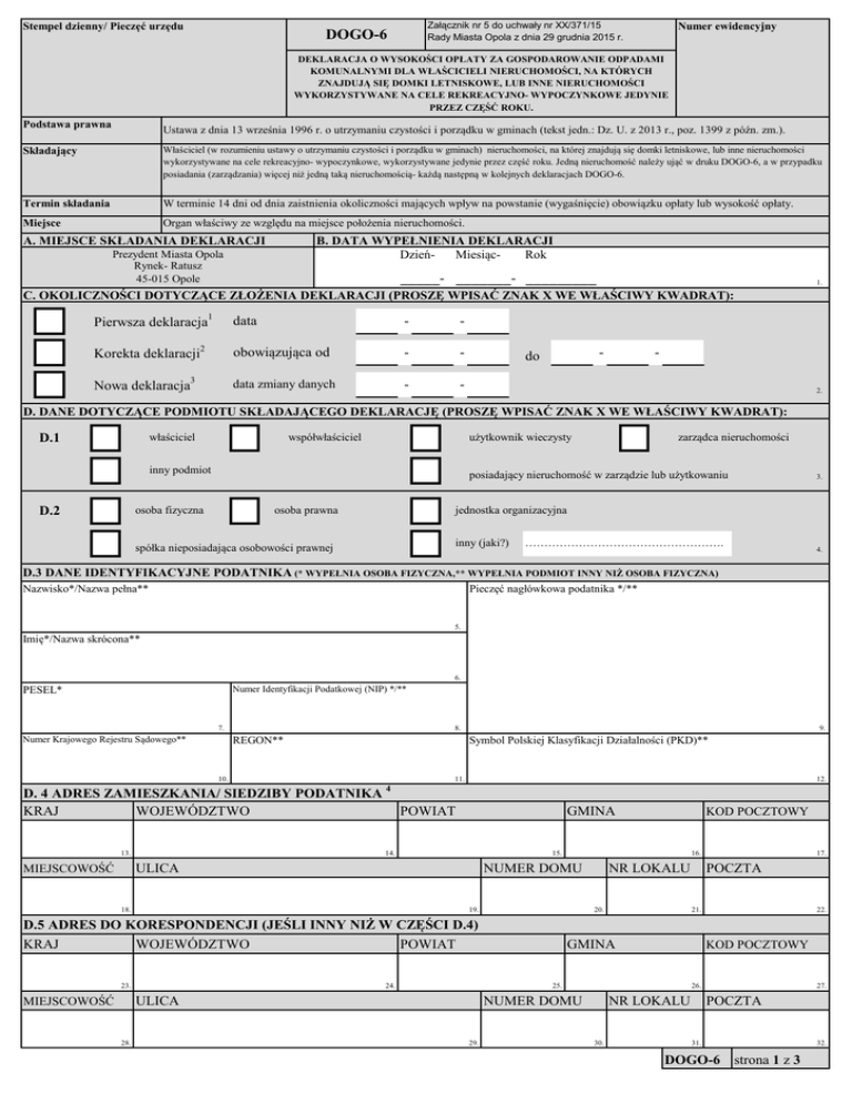 Stempel dzienny/ Pieczęć urzędu Załącznik nr 5 do uchwały nr XX/371/15 Rady Miasta Opola z dnia 29 grudnia 2015 r. DOGO-6 Numer ewidencyjny DEKLARACJA O WYSOKOŚCI OPŁATY ZA GOSPODAROWANIE ODPADAMI KOMUNALNYMI DLA WŁAŚCICIELI NIERUCHOMOŚCI, NA KTÓRYCH ZNAJDUJĄ SIĘ DOMKI LETNISKOWE, LUB INNE NIERUCHOMOŚCI WYKORZYSTYWANE NA CELE REKREACYJNO- WYPOCZYNKOWE JEDYNIE PRZEZ CZĘŚĆ ROKU. Podstawa prawna Ustawa z dnia 13 września 1996 r. o utrzymaniu czystości i porządku w gminach (tekst jedn.: Dz. U. z 2013 r., poz. 1399 z późn. zm.). Składający Właściciel (w rozumieniu ustawy o utrzymaniu czystości i porządku w gminach) nieruchomości, na której znajdują się domki letniskowe, lub inne nieruchomości wykorzystywane na cele rekreacyjno- wypoczynkowe, wykorzystywane jedynie przez część roku. Jedną nieruchomość należy ująć w druku DOGO-6, a w przypadku posiadania (zarządzania) więcej niż jedną taką nieruchomością- każdą następną w kolejnych deklaracjach DOGO-6. Termin składania W terminie 14 dni od dnia zaistnienia okoliczności mających wpływ na powstanie (wygaśnięcie) obowiązku opłaty lub wysokość opłaty. Miejsce Organ właściwy ze względu na miejsce położenia nieruchomości. A. MIEJSCE SKŁADANIA DEKLARACJI B. DATA WYPEŁNIENIA DEKLARACJI DzieńMiesiącRok Prezydent Miasta Opola Rynek- Ratusz 45-015 Opole _____- _______- _________ 1. C. OKOLICZNOŚCI DOTYCZĄCE ZŁOŻENIA DEKLARACJI (PROSZĘ WPISAĆ ZNAK X WE WŁAŚCIWY KWADRAT): Pierwsza deklaracja1 data - - Korekta deklaracji2 obowiązująca od - - Nowa deklaracja3 data zmiany danych - - - do 2. D. DANE DOTYCZĄCE PODMIOTU SKŁADAJĄCEGO DEKLARACJĘ (PROSZĘ WPISAĆ ZNAK X WE WŁAŚCIWY KWADRAT): D.1 właściciel współwłaściciel użytkownik wieczysty inny podmiot D.2 zarządca nieruchomości posiadający nieruchomość w zarządzie lub użytkowaniu osoba fizyczna osoba prawna 3. jednostka organizacyjna inny (jaki?) spółka nieposiadająca osobowości prawnej ……………………………………………. 4. D.3 DANE IDENTYFIKACYJNE PODATNIKA (* WYPEŁNIA OSOBA FIZYCZNA,** WYPEŁNIA PODMIOT INNY NIŻ OSOBA FIZYCZNA) Nazwisko*/Nazwa pełna** Pieczęć nagłówkowa podatnika */** 5. Imię*/Nazwa skrócona** 6. Numer Identyfikacji Podatkowej (NIP) */** PESEL* 7. Numer Krajowego Rejestru Sądowego** 8. REGON** 9. Symbol Polskiej Klasyfikacji Działalności (PKD)** 10. 11. 12. D. 4 ADRES ZAMIESZKANIA/ SIEDZIBY PODATNIKA 4 KRAJ WOJEWÓDZTWO POWIAT 13. GMINA 14. 15. ULICA MIEJSCOWOŚĆ 19. 23. 24. GMINA 22. KOD POCZTOWY 26. NUMER DOMU 29. 17. POCZTA 21. 25. ULICA 28. NR LOKALU 20. D.5 ADRES DO KORESPONDENCJI (JEŚLI INNY NIŻ W CZĘŚCI D.4) KRAJ WOJEWÓDZTWO POWIAT MIEJSCOWOŚĆ 16. NUMER DOMU 18. KOD POCZTOWY NR LOKALU 30. 27. POCZTA 31. DOGO-6 strona 1 z 3 32. E. ADRES NIERUCHOMOŚCI, NA KTÓREJ ZNAJDUJĄ SIĘ DOMKI LETNISKOWE LUB WYKORZYSTYWANEJ NA CELE REKREACYJNO- WYPOCZYNKOWE, WYKORZYSTYWANEJ JEDYNIE PRZEZ CZĘŚĆ ROKU (JEŚLI INNY NIŻ W CZĘŚCI D.4) NUMER DOMU LUB DZIAŁKI ULICA 33. NUMER LOKALU 34. 35. F. OŚWIADCZAM, ŻE NIERUCHOMOŚĆ, KTÓREJ DOTYCZY DRUK DOGO-6 STANOWI NIERUCHOMOŚĆ (PROSZĘ WPISAĆ ZNAK X WE WŁAŚCIWY KWADRAT I OKREŚLIĆ SPOSÓB GROMADZENIA ODPADÓW KOMUNALNYCH) na której znajdują się domki letniskowe. Odpady z terenu nieruchomości zbierane i odbierane będą w sposób: SELEKTYWNY NIESELEKTYWNY 36. wykorzystywaną na cele rekreacyjno- wypoczynkowe jedynie przez część roku, inną niż nieruchomość, na której znajdują się domki letniskowe. Odpady z terenu nieruchomości zbierane i odbierane będą w sposób: SELEKTYWNY NIESELEKTYWNY 37. G. OBLICZENIE WYSOKOŚCI OPŁATY6 G.1. WYLICZENIE WYSOKOŚCI OPŁATY DLA NIERUCHOMOŚCI, NA KTÓREJ ZNAJDUJĄ SIĘ DOMKI LETNISKOWE. Ryczałtowa stawka opłaty od jednego domku letniskowego5 38. Liczba domków letniskowych znajdujących się na terenie nieruchomości. 39. Ryczałtowa stawka opłaty za gospodarowanie odpadami komunalnymi za rok (należy wpisać iloczyn wartości z pól nr 38 i 39). 40. G.2 USTALENIE RYCZAŁTOWEJ STAWKI OPŁATY ZA ROK DLA INNEJ NIERUCHOMOŚCI NIŻ NIERUCHOMOŚĆ, NA KTÓREJ ZNAJDUJĄ SIĘ DOMKI LETNISKOWE, WYKORZYSTYWANEJ NA CELE REKREACYJNO- WYPOCZYNKOWE JEDYNIE PRZEZ CZĘŚĆ ROKU. Pojemność pojemnika 120 l 240 l 1100 l od 5 do 7 m3 włącznie Łączna liczba wywozów odpadów z pojemnika w odniesieniu do pojemności pojemników Stawka ryczałtu/rok 50 41. 100 42. 200 43. 25 44. 50 45. 100 46. 5 47. 11 48. 22 49. 1 50. 2 51. 4 52. ZŁ Podsumowanie wysokości opłaty (suma wartości z poz. od 40 do 52). H. PODPIS PODATNIKA WSKAZANEGO W CZĘŚCI D.3/OSÓB REPREZENTUJĄCYCH PODATNIKA Imię Podpis i pieczęć Imię 53. 7 Podpis i pieczęć 57. 54. Nazwisko Nazwisko 55. 56. 58. 59. Pouczenie W przypadku niewpłacenia w obowiązującym terminie kwoty z poz. 53 lub wpłacenia jej w niepełnej wysokości niniejsza deklaracja stanowi podstawę do wystawienia tytułu wykonawczego, zgodnie z przepisami ustawy z dnia 17 czerwca 1966 r. o postępowaniu egzekucyjnym w administracji (tekst jedn.: Dz.U. z 2014 r. poz. 1619 z późn. zm.). DOGO-6 strona 2 z 3 I. DANE IDENTYFIKACYJNE OSOBY SPORZĄDZAJĄCEJ DEKLARACJĘ IMIĘ NAZWISKO 60. NUMER TELEFONU 61. ADRES E-MAIL 62. 63. Data przyjęcia ADNOTACJE ORGANU 64. Podpis (pieczęć) przyjmującego 65. Czynności sprawdzające 67. 66. POLA JASNE WYPEŁNIA WŁAŚCICIEL NIERUCHOMOŚCI KOMPUTEROWO LUB RĘCZNIE, DUŻYMI, DRUKOWANYMI LITERAMI, CZARNYM LUB NIEBIESKIM KOLOREM 1 Pole „pierwsza deklaracja” należy zaznaczyć znakiem „X” w przypadku, gdy dany podmiot nie składał wcześniej deklaracji o wysokości opłaty za gospodarowanie odpadami komunalnymi za nieruchomość, której dotyczy druk DOGO-6. Pierwszą deklarację należy złożyć w terminie 14 dni od dnia zamieszkania na danej nieruchomości pierwszego mieszkańca lub powstania na danej nieruchomości odpadów komunalnych. Należy również podać datę zamieszkania na 