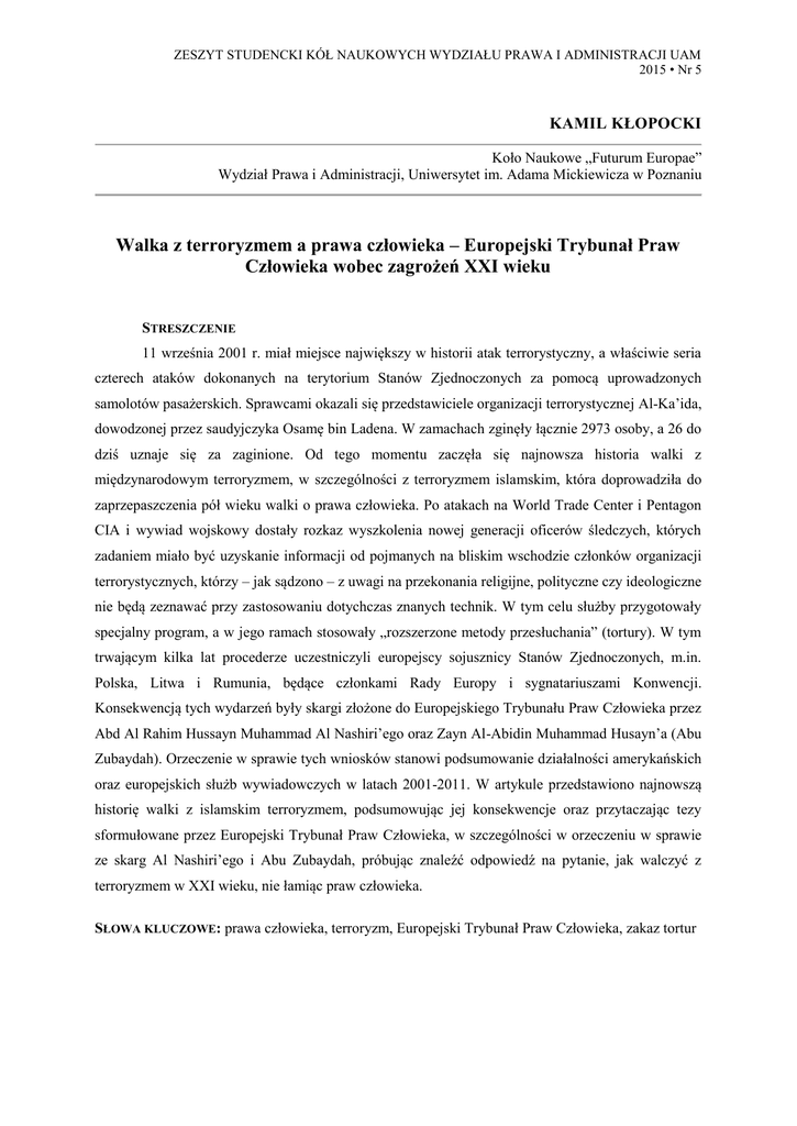 ZESZYT STUDENCKI KÓŁ NAUKOWYCH WYDZIAŁU PRAWA I ADMINISTRACJI UAM 2015 • Nr 5 KAMIL KŁOPOCKI Koło Naukowe „Futurum Europae” Wydział Prawa i Administracji, Uniwersytet im. Adama Mickiewicza w Poznaniu Walka z terroryzmem a prawa człowieka – Europejski Trybunał Praw Człowieka wobec zagrożeń XXI wieku STRESZCZENIE 11 września 2001 r. miał miejsce największy w historii atak terrorystyczny, a właściwie seria czterech ataków dokonanych na terytorium Stanów Zjednoczonych za pomocą uprowadzonych samolotów pasażerskich. Sprawcami okazali się przedstawiciele organizacji terrorystycznej Al-Ka’ida, dowodzonej przez saudyjczyka Osamę bin Ladena. W zamachach zginęły łącznie 2973 osoby, a 26 do dziś uznaje się za zaginione. Od tego momentu zaczęła się najnowsza historia walki z międzynarodowym terroryzmem, w szczególności z terroryzmem islamskim, która doprowadziła do zaprzepaszczenia pół wieku walki o prawa człowieka. Po atakach na World Trade Center i Pentagon CIA i wywiad wojskowy dostały rozkaz wyszkolenia nowej generacji oficerów śledczych, których zadaniem miało być uzyskanie informacji od pojmanych na bliskim wschodzie członków organizacji terrorystycznych, którzy – jak sądzono – z uwagi na przekonania religijne, polityczne czy ideologiczne nie będą zeznawać przy zastosowaniu dotychczas znanych technik. W tym celu służby przygotowały specjalny program, a w jego ramach stosowały „rozszerzone metody przesłuchania” (tortury). W tym trwającym kilka lat procederze uczestniczyli europejscy sojusznicy Stanów Zjednoczonych, m.in. Polska, Litwa i Rumunia, będące członkami Rady Europy i sygnatariuszami Konwencji. Konsekwencją tych wydarzeń były skargi złożone do Europejskiego Trybunału Praw Człowieka przez Abd Al Rahim Hussayn Muhammad Al Nashiri’ego oraz Zayn Al-Abidin Muhammad Husayn’a (Abu Zubaydah). Orzeczenie w sprawie tych wniosków stanowi podsumowanie działalności amerykańskich oraz europejskich służb wywiadowczych w latach 2001-2011. W artykule przedstawiono najnowszą historię walki z islamskim terroryzmem, podsumowując jej konsekwencje oraz przytaczając tezy sformułowane przez Europejski Trybunał Praw Człowieka, w szczególności w orzeczeniu w sprawie ze skarg Al Nashiri’ego i Abu Zubaydah, próbując znaleźć odpowiedź na pytanie, jak walczyć z terroryzmem w XXI wieku, nie łamiąc praw człowieka. SŁOWA KLUCZOWE: prawa człowieka, terroryzm, Europejski Trybunał Praw Człowieka, zakaz tortur