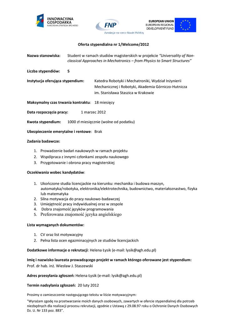 Oferta stypendialna nr 1/Welcome/2012 Nazwa stanowiska: Student w ramach studiów magisterskich w projekcie “Universality of Nonclassical Approaches in Mechatronics – from Physics to Smart Structures” Liczba stypendiów: 5 Instytucja oferująca stypendium: Katedra Robotyki i Mechatroniki, Wydział Inżynierii Mechanicznej i Robotyki, Akademia Górniczo-Hutnicza im. Stanisława Staszica w Krakowie Maksymalny czas trwania kontraktu: 18 miesięcy Data rozpoczęcia pracy: Kwota stypendium: 1 marzec 2012 1000 zł miesięcznie (wolne od podatku) Ubezpieczenie emerytalne i rentowe: Brak Zadania badawcze: 1. Prowadzenie badań naukowych w ramach projektu 2. Wspólpraca z innymi członkami zespołu naukowego 3. Przygotowanie i obrona pracy magisterskiej Oczekiwania wobec kandydatów: 1. Ukończone studia licencjackie na kierunku: mechanika i budowa maszyn, automatyka/robotyka, elektronika/elektrotechnika, budownictwo, materiałoznastwo, fizyka lub matematyka 2. Silna motywacja do pracy naukowo-badawczej 3. Umiejętność pracy indywidualnej oraz w zespole 4. Dobra znajomość języków programowania 5. Preferowana znajomość języka angielskiego Lista wymaganych dokumentów: 1. CV oraz list motywacyjny 2. Pełna lista ocen egazminacyjnych ze studiów licencjackich Dodatkowe informacje o rekrutacji: Helena Łysik (e-mail: [email protected]) Imię i nazwisko laureata prowadzącego projekt w ramach którego oferowane jest stypendium: Prof. dr hab. inż. Wiesław J. Staszewski Adres przesyłania zgłoszeń: Helena Łysik (e-mail: [email protected]) Termin nadsyłania zgłoszeń: 20 luty 2012 Prosimy o zamieszczenie następującego tekstu w liście motywacyjnym: "Wyrażam zgodę na przetwarzanie moich danych osobowych, zawartych w ofercie stypendialnej dla potrzeb niezbędnych dla realizacji procesu rekrutacji, zgodnie z Ustawą z 29.08.97 roku o Ochronie Danych Osobowych Dz. U. Nr 133 poz. 883”.