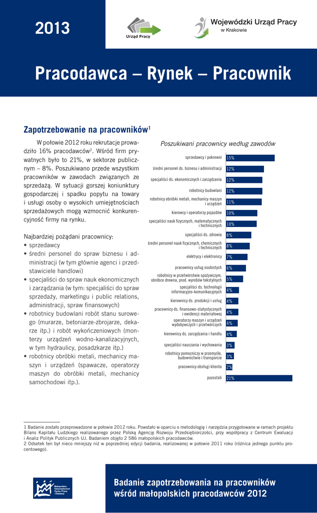 2013 Pracodawca – Rynek – Pracownik Zapotrzebowanie na pracowników1 W połowie 2012 roku rekrutacje prowadziło 16% pracodawców2. Wśród firm prywatnych było to 21%, w sektorze publicznym – 8%. Poszukiwano przede wszystkim pracowników w zawodach związanych ze sprzedażą. W sytuacji gorszej koniunktury gospodarczej i spadku popytu na towary i usługi osoby o wysokich umiejętnościach sprzedażowych mogą wzmocnić konkurencyjność firmy na rynku. Najbardziej pożądani pracownicy: • sprzedawcy • średni personel do spraw biznesu i administracji (w tym głównie agenci i przedstawiciele handlowi) • specjaliści do spraw nauk ekonomicznych i zarządzania (w tym: specjaliści do spraw sprzedaży, marketingu i public relations, administracji, spraw finansowych) • robotnicy budowlani robót stanu surowego (murarze, betoniarze-zbrojarze, dekarze itp.) i robót wykończeniowych (monterzy urządzeń wodno-kanalizacyjnych, w tym hydraulicy, posadzkarze itp.) • robotnicy obróbki metali, mechanicy maszyn i urządzeń (spawacze, operatorzy maszyn do obróbki metali, mechanicy samochodowi itp.). Poszukiwani pracownicy według zawodów sprzedawcy i pokrewni 15% średni personel ds. biznesu i administracji 12% specjaliści ds. ekonomicznych i zarządzania 12% robotnicy budowlani 12% robotnicy obróbki metali, mechanicy maszyn i urządzeń 11% kierowcy i operatorzy pojazdów 10% specjaliści nauk fizycznych, matematycznych i technicznych 10% specjaliści ds. zdrowia 8% średni personel nauk fizycznych, chemicznych i technicznych 8% elektrycy i elektronicy 7% pracownicy usług osobistych 6% robotnicy w przetwórstwie spożywczym, obróbce drewna, prod. wyrobów tekstylnych 5% specjaliści ds. technologii informacyjno-komunikacyjnych 4% kierownicy ds. produkcji i usług 4% pracownicy ds. finansowo-statystycznych i ewidencji materiałowej operatorzy maszyn i urządzeń wydobywczych i przetwórczych 4% 4% kierownicy ds. zarządzania i handlu 4% specjaliści nauczania i wychowania 3% robotnicy pomocniczy w przemyśle, budownictwie i transporcie 3% pracownicy obsługi klienta 2% pozostali 21% 1 Badanie zostało przeprowadzone w połowie 2012 roku. Powstało w oparciu o metodologię i narzędzia przygotowane w ramach projektu Bilans Kapitału Ludzkiego realizowanego przez Polską Agencję Rozwoju Przedsiębiorczości, przy współpracy z Centrum Ewaluacji i Analiz Polityk Publicznych UJ. Badaniem objęto 2 586 małopolskich pracodawców. 2 Odsetek ten był nieco mniejszy niż w poprzedniej edycji badania, realizowanej w połowie 2011 roku (różnica jednego punktu procentowego). Badanie zapotrzebowania na pracowników wśród małopolskich pracodawców 2012 Plany rekrutacyjne pracodawców Większość pracodawców nie planowała zwiększać liczby pracowników w kolejnym roku. Im mniejsze zatrudnienie, tym większa jego stabilność u danego pracodawcy. O braku zmian w poziomie zatrudnienia mówiono przede wszystkim w branżach: obsługa rynku nieruchomości i usługi administrowania, opieka zdrowotna oraz administracja publiczna. Najbardziej skore do zmniejszania liczby zatrudnionych były firmy największe. Wśród branż wyraźnie wyróżniała się edukacja. Największymi optymistami w kwestii prognoz zatrudnieniowych w momencie badania byli przedstawiciele branż: transport, zakwaterowanie i usługi gastronomiczne oraz budownictwo. Jak w następnym roku zmieni się zatrudnienie? 6% 18% 17% 59% zmniejszy się pozostanie na tym samym poziomie zwiększy się trudno powiedzieć Czynniki ważne przy rekrutacji Pracodawcy, którzy w momencie badania prowadzili rekrutację, kładli większy nacisk na doświadczenie zawodowe niż na poziom wykształcenia kandydatów, choć ten drugi czynnik również nie pozostawał bez znaczenia. Wykształcenie było bardzo ważnym kryterium w przypadku podmiotów publicznych. W sektorze prywatnym dużo istotniejsze było doświadczenie zawodowe. Oczekiwania względem kandydatów do pracy 5% 22% 37% 45% nieistotne ważne 95% sektor publiczny 55% 63% sektor prywatny sektor publiczny poziom wykształcenia 78% sektor prywatny doświadczenie Najważniejsze kompetencje przyszłych pracowników Kompetencje, których oczekiwano najczęściej od kandydatów do pracy: • indywidualne/psychologiczne: odpowiedzialność, dyscyplina pracy, uczciwość, wiarygodność; staranność, skrupulatność, dokładność; chęć do pracy, pracowitość; samodzielność; kultura osobista, uprzejmość, autoprezentacja; • interpersonalne: umiejętność kontaktu z klientami; komunikatywność – klarowne przekazywanie myśli; umiejętność współpracy w grupie; • typowe dla zawodu – umiejętności związane bezpośrednio z czynnościami zawodowymi, np. umiejętność wypieku pieczywa w przypadku piekarzy lub spawania w przypadku spawaczy. Najważniejsze kompetencje kandydatów do pracy indywidualne/psychologiczne 97% interpersonalne 40% typowe dla zawodu 29% techniczne 14% komputerowe 13% uprawnienia, licencje, prawo jazdy 13% znajomość języków obcych, zdolności werbalne 12% dyspozycyjne 10% kognitywne 10% związane z posiadaniem doświadczenia zawodowego 10% fizyczne 9% inne 19% Sposoby rekrutacji pracowników Najbardziej popularnymi formami rekrutacji pracowników okazały się usługi powiatowych urzędów pracy oraz polecenie rodziny i znajomych. Dość częste było również zamieszczanie ogłoszeń w internecie oraz w prasie. Zróżnicowanie popularności poszczególnych form rekrutacji pracowników w ramach sektorów przedstawiono na wykresie. Wiąże się ono m.in. ze specyfiką działalności pracodawców w ramach sektora publicznego i prywatnego. Najbardziej zróżnicowane metody rekrutacji stosowali pracodawcy najwięksi, zatrudniający powyżej 250 pracowników. Najbardziej skuteczne, zdaniem pracodawców, okazało się polecenie rodziny i znajomych oraz ogłoszenia w internecie. Usługi powiatowych urzędów pracy, choć najbardziej popularne, zost