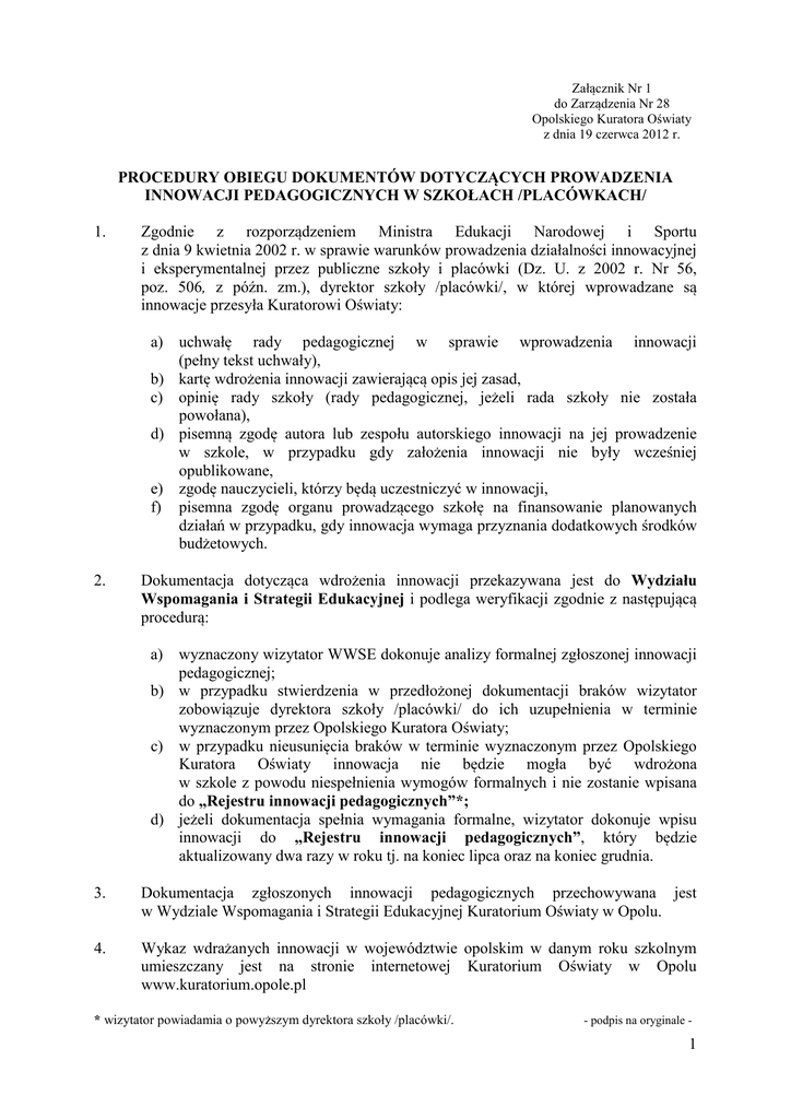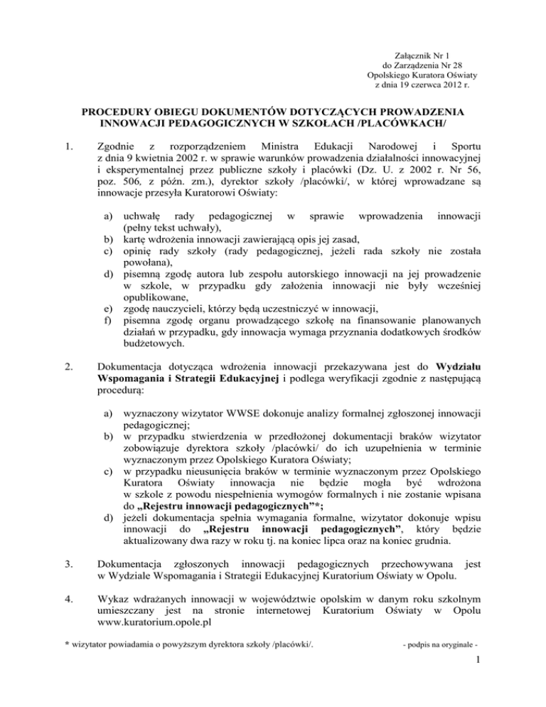 Załącznik Nr 1 do Zarządzenia Nr 28 Opolskiego Kuratora Oświaty z dnia 19 czerwca 2012 r. PROCEDURY OBIEGU DOKUMENTÓW DOTYCZĄCYCH PROWADZENIA INNOWACJI PEDAGOGICZNYCH W SZKOŁACH /PLACÓWKACH/ 1. Zgodnie z rozporządzeniem Ministra Edukacji Narodowej i Sportu z dnia 9 kwietnia 2002 r. w sprawie warunków prowadzenia działalności innowacyjnej i eksperymentalnej przez publiczne szkoły i placówki (Dz. U. z 2002 r. Nr 56, poz. 506, z późn. zm.), dyrektor szkoły /placówki/, w której wprowadzane są innowacje przesyła Kuratorowi Oświaty: a) uchwałę rady pedagogicznej w sprawie wprowadzenia innowacji (pełny tekst uchwały), b) kartę wdrożenia innowacji zawierającą opis jej zasad, c) opinię rady szkoły (rady pedagogicznej, jeżeli rada szkoły nie została powołana), d) pisemną zgodę autora lub zespołu autorskiego innowacji na jej prowadzenie w szkole, w przypadku gdy założenia innowacji nie były wcześniej opublikowane, e) zgodę nauczycieli, którzy będą uczestniczyć w innowacji, f) pisemna zgodę organu prowadzącego szkołę na finansowanie planowanych działań w przypadku, gdy innowacja wymaga przyznania dodatkowych środków budżetowych. 2. Dokumentacja dotycząca wdrożenia innowacji przekazywana jest do Wydziału Wspomagania i Strategii Edukacyjnej i podlega weryfikacji zgodnie z następującą procedurą: a) wyznaczony wizytator WWSE dokonuje analizy formalnej zgłoszonej innowacji pedagogicznej; b) w przypadku stwierdzenia w przedłożonej dokumentacji braków wizytator zobowiązuje dyrektora szkoły /placówki/ do ich uzupełnienia w terminie wyznaczonym przez Opolskiego Kuratora Oświaty; c) w przypadku nieusunięcia braków w terminie wyznaczonym przez Opolskiego Kuratora Oświaty innowacja nie będzie mogła być wdrożona w szkole z powodu niespełnienia wymogów formalnych i nie zostanie wpisana do „Rejestru innowacji pedagogicznych”*; d) jeżeli dokumentacja spełnia wymagania formalne, wizytator dokonuje wpisu innowacji do „Rejestru innowacji pedagogicznych”, który będzie aktualizowany dwa razy w roku tj. na koniec lipca oraz na koniec grudnia. 3. Dokumentacja zgłoszonych innowacji pedagogicznych przechowywana jest w Wydziale Wspomagania i Strategii Edukacyjnej Kuratorium Oświaty w Opolu. 4. Wykaz wdrażanych innowacji w województwie opolskim w danym roku szkolnym umieszczany jest na stronie internetowej Kuratorium Oświaty w Opolu www.kuratorium.opole.pl * wizytator powiadamia o powyższym dyrektora szkoły /placówki/. - podpis na oryginale - 1