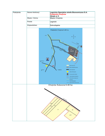Położenie Nazwa lokalizacji Miasto / Gmina Legnicka Specjalna strefa Ekonomiczna S.A. Podstrefa Chojnów Obręb nr 5 Miasto Chojnów Powiat Legnicki Województwo Dolnośląskie Powierzchnia nieruchomości Powierzchnia całkowita [ha] Powierzchnie poszczególnych działek ha Możliwości powiększenia terenu (krótki opis) Informacje dotyczące nieruchomości 3,1106 20 – 0,4325 19/1 – 0,3000 24/4 – 0,3769 19/2 – 0,2479 21 – 1,5121 23 – 0,2412 N Właściciel / właściciele Miasto Chojnów Aktualny plan zagospodarowania przestrzennego (T/N) Uchwała nr XXXII/132/97 Rady Miejskiej Chojnowa z dnia 07 lipca 1997 r. opublikowany w Dzienniku Urzędowym Woj. Legnickiego nr 21, poz. 178 w dniu 08.08.1997r. 7F18.6P,B,S(EE), 8F18.6P,B,S(EE) – działalność gospodarcza, komercyjna (przemysł, budownictwo, składy itp.) Przeznaczenie w miejscowym planie zagospodarowania przestrzennego Charakterystyka Klasa gruntów wraz z powierzchnią działki Różnica poziomów terenu [m] 20 – RIIIb(0,1334), RIVa(0,2991) 19/1 – RIIIb(0,1185), RIVa(0,1450), 24/4 – ŁIII 19/2 – RIIIb(0,0929), RIVa(0,0574), 21 – RIIIb(0,2767), RIVa(1,2354), 23 – ŁIII b.d Zanieczyszczenia wód powierzchniowych i gruntowych (T/N) N Odpady znajdujące się na terenie (T/N) N Badania geologiczne (T/N) T Poziom wód gruntowych m 0,8 – 1,8 m.p.p.t. Ryzyko wystąpienia zalań lub obsunięć terenu (T/N) N Przeszkody podziemne (T/N) N RV(0,0365) RV(0,0976) Przeszkody występujące na powierzchni terenu (T/N) Ograniczenia budowlane Połączenia transportowe N Istniejące ograniczenia ekologiczne (T/N) N Budynki i zabudowania na terenie (T/N) N Procent dopuszczalnej zabudowy b.d Ograniczenia wysokości budynków m b.d Strefa buforowa m 4 m od granicy działki 10 m od drogi dojazdowej Inne, jeśli występują b.d Droga dojazdowa do terenu (rodzaj drogi i jej szerokość) Droga asfaltowa o szerokości 5,5 m Autostrada / droga krajowa km Autostrada A4 – 10 km Kolej km 2 km Bocznica kolejowa km 2 km Najbliższe lotnisko międzynarodowe km Międzynarodowy Port Lotniczy we Wrocławiu w odległości ok. 90 km Najbliższe miasto wojewódzkie Wrocław – 90 km km Zielona Góra – 90 km Istniejąca infrastruktura Energia elektryczna na terenie T/N Napięcie N 20/0.4 kV Odległość przyłącza od granicy działki Dostępna moc Gaz na terenie (T/N) Odległość przyłącza od granicy działki Dostępna objętość Woda na terenie (T/N) 1 500 m Przy terenie przebiegają linie napowietrzne eSN dostępna moc ok 2 MW. Przy większym zapotrzebowaniu konieczna jest budowa nowych sieci 20 kV od GPZ Chojnów. N 300 m, w ulicy Okrzei istnieje sieć gazowa podłączona do zakładu Impel Perfecta, w ulicy Legnickiej w odległości ok 400 m znajduje się sieć g125. N Odległość przyłącza od granicy terenu 150m, wzdłuż ul. Łużuckiej istnieje sieć w160 Dostępna objętość 75 m3/h Kanalizacja na terenie (T/N) N Odległość przyłącza od granicy terenu Dostępna objętość 150m, wzdłuż ul. Łużuckiej istnieje sieć ks315 istnieje możliwość połączenia terenu z tą siecią poprzez rurociąg tłoczny (spadek terenu w stronę wschodnią), w odległości ok. 300 m na północ przy zakładzie Impel Perfecta znajduje się sieć ks160 75 m3/h Ograniczenie zrzutu ścieków Skład ścieków zgodne z standardami, tylko ścieki socjalne Odprowadzenie wód deszczowych na terenie (T/N) T – sieć kanalizacji deszczowej znajduje się w drodze ul. Łużycka Oczyszczalnia ścieków na terenie bądź w bezpośrednim sąsiedztwie T – oczyszczalnia ścieków w - odległości ok. 700m w stronę północno-wschodnią Telefony (T/N) N Odległość przyłącza od granicy terenu 200 m