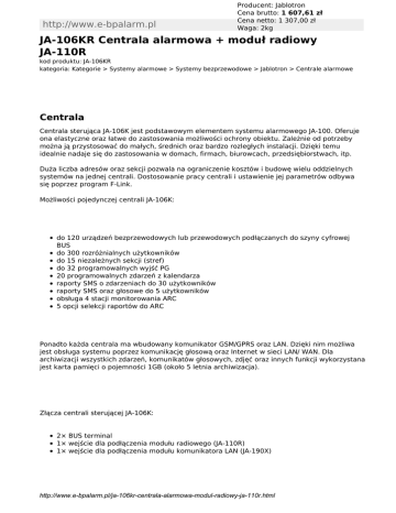 http://www.e-bpalarm.pl Producent: Jablotron Cena brutto: 1 607,61 zł Cena netto: 1 307,00 zł Waga: 2kg JA-106KR Centrala alarmowa + moduł radiowy JA-110R kod produktu: JA-106KR kategoria: Kategorie > Systemy alarmowe > Systemy bezprzewodowe > Jablotron > Centrale alarmowe Centrala Centrala sterująca JA-106K jest podstawowym elementem systemu alarmowego JA-100. Oferuje ona elastyczne oraz łatwe do zastosowania możliwości ochrony obiektu. Zależnie od potrzeby można ją przystosować do małych, średnich oraz bardzo rozległych instalacji. Dzięki temu idealnie nadaje się do zastosowania w domach, firmach, biurowcach, przedsiębiorstwach, itp. Duża liczba adresów oraz sekcji pozwala na ograniczenie kosztów i budowę wielu oddzielnych systemów na jednej centrali. Dostosowanie pracy centrali i ustawienie jej parametrów odbywa się poprzez program F-Link. Możliwości pojedynczej centrali JA-106K: do 120 urządzeń bezprzewodowych lub przewodowych podłączanych do szyny cyfrowej BUS do 300 rozróżnialnych użytkowników do 15 niezależnych sekcji (stref) do 32 programowalnych wyjść PG 20 programowalnych zdarzeń z kalendarza raporty SMS o zdarzeniach do 30 użytkowników raporty SMS oraz głosowe do 5 użytkowników obsługa 4 stacji monitorowania ARC 5 opcji selekcji raportów do ARC Ponadto każda centrala ma wbudowany komunikator GSM/GPRS oraz LAN. Dzięki nim możliwa jest obsługa systemu poprzez komunikację głosową oraz Internet w sieci LAN/ WAN. Dla archiwizacji wszystkich zdarzeń, komunikatów głosowych, zdjęć oraz innych funkcji wykorzystana jest karta pamięci o pojemności 1GB (około 5 letnia archiwizacja). Złącza centrali sterującej JA-106K: 2× BUS terminal 1× wejście dla podłączenia modułu radiowego (JA-110R) 1× wejście dla podłączenia modułu komunikatora LAN (JA-190X) http://www.e-bpalarm.pl/ja-106kr-centrala-alarmowa-modul-radiowy-ja-110r.html Moduł radiowy JA-110R JA-110R jest modułem podłączanym do magistrali cyfrowej BUS. Może być zainstalowany w obudowie centrali lub wpięty w szynę BUS na zewnątrz. Dla każdego systemu można podłączyć do 3 takich modułów, umożliwia to przypisywanie do systemu urządzeń radiowych, np. czujników. Urządzenie jest adresowalne i zajmuje jeden adres w systemie. Centrala alarmowa JA-106K Wejście zasilania sieciowego 230 V/50 Hz Zasilanie typ A (EN 50131-6) Obciążenie prądowe: czuwanie AC 140 mA, podczas alarmu 200 mA Podtrzymanie z akumulatora 12 V, 7-18 Ah Maksymalny czas ładowania akumulatora do 72 godzin Maksymalne ciągłe obciążenie terminala BUS do 1,2 A Maksymalne chwilowe obciążenie wyjścia (5 min.) to 2A Podtrzymanie zasilania BUS z akumulatora 18 Ah przez 12 godzin, przy obciążeniu 1,2 A Moduł radiowy JA-110R, pracujący w 2 kierunkach i wykorzystujący częstotliwość 868,1 MHz (nie jest zawarty w centrali) Ilość adresów dla urządzeń radiowych i BUS do 120 Pamięć zdarzeń: 700 MB, około 1 milion zdarzeń z dokładną datą i czasem Funkcja weryfikacji alarmu poprzez 2 czujnik lub reakcję opóźnioną Funkcja licznika czasu ustawiana od 10S do 2 minut, przy potwierdzeniu z tego samego czujnika Stopień ochrony 2 zgodny z EN 50131-1, EN 50131-6 oraz EN 50131-5-3 i EN 50131-3; klasa środowiskowa zgodna z EN 50131-1: II, zastosowanie wewnątrz Moduł radiowy JA-110R Zasilanie: szyna BUS, 12 V DC Pobór prądu w czuwaniu: 25 mA Częstotliwość radiowa: 868,1 MHz Wymiary: 40 × 150 × 23 mm Klasa środowiskowa zgodna z EN 50131-1, EN 50131-3: II, wewnątrz Temperatura pracy: –10 do 40 °C http://www.e-bpalarm.pl/ja-106kr-centrala-alarmowa-modul-radiowy-ja-110r.html