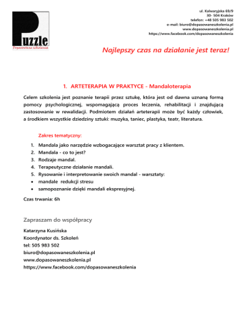 ul. Kalwaryjska 69/9 30- 504 Kraków telefon: +48 505 983 502 e-mail: [email protected] www.dopasowaneszkolenia.pl https://www.facebook.com/dopasowaneszkolenia Najlepszy czas na działanie jest teraz! 1. ARTETERAPIA W PRAKTYCE - Mandaloterapia Celem szkolenia jest poznanie terapii przez sztukę, która jest od dawna uznaną formą pomocy psychologicznej, wspomagającą proces leczenia, rehabilitacji i znajdującą zastosowanie w rewalidacji. Podmiotem działań arteterapii może być każdy człowiek, a środkiem wszystkie dziedziny sztuki: muzyka, taniec, plastyka, teatr, literatura. Zakres tematyczny: 1. Mandala jako narzędzie wzbogacające warsztat pracy z klientem. 2. Mandala - co to jest? 3. Rodzaje mandal. 4. Terapeutyczne działanie mandali. 5. Rysowanie i interpretowanie swoich mandal - warsztaty: mandale redukcji stresu samopoznanie dzięki mandali ekspresyjnej. Czas trwania: 6h Zapraszam do współpracy Katarzyna Kusińska Koordynator ds. Szkoleń tel: 505 983 502 [email protected] www.dopasowaneszkolenia.pl https://www.facebook.com/dopasowaneszkolenia