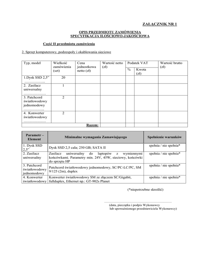 ZAŁĄCZNIK NR 1 OPIS PRZEDMIOTU ZAMÓWIENIA SPECYFIKACJA ILOŚCIOWO-JAKOŚCIOWA Część II przedmiotu zamówienia 2. Sprzęt komputerowy, podzespoły i okablowania sieciowe Wielkość zamówienia (szt) Typ, model 1.Dysk SSD 2,5” …………….. 2. Zasilacz uniwersalny ……………… 3. Patchcord światłowodowy jednomodowy …………….. 4. Konwerter światłowodowy ……………… Cena jednostkowa netto (zł) Wartość netto (zł) Podatek VAT % Kwota (zł) Wartość brutto (zł) 20 1 2 2 Razem: Parametr – Element 1. Dysk SSD 2,5” 2. Zasilacz uniwersalny 3. Patchcord światłowodowy jednomodowy 4. Konwerter światłowodowy Spełnienie warunków Minimalne wymagania Zamawiającego spełnia / nie spełnia* Dysk SSD 2,5 cala; 250 GB; SATA II Zasilacz uniwersalny do laptopów z wymiennymi końcówkami. Parametry min. 24V, 45W, sieciowy, końcówki do sprzętu HP Patchcord światłowodowy jednomodowy, SC/PC-LC/PC, SM 9/125 (2m), duplex Konwerter światłowodowy SM ze złączem SC/Gigabit, fullduplex, Ethernet np.: GT-902s Planet spełnia / nie spełnia* spełnia / nie spełnia* spełnia / nie spełnia* (*niepotrzebne skreślić) …………………………………………………… (data, pieczątka i podpis Wykonawcy lub upoważnionego przedstawiciela Wykonawcy)