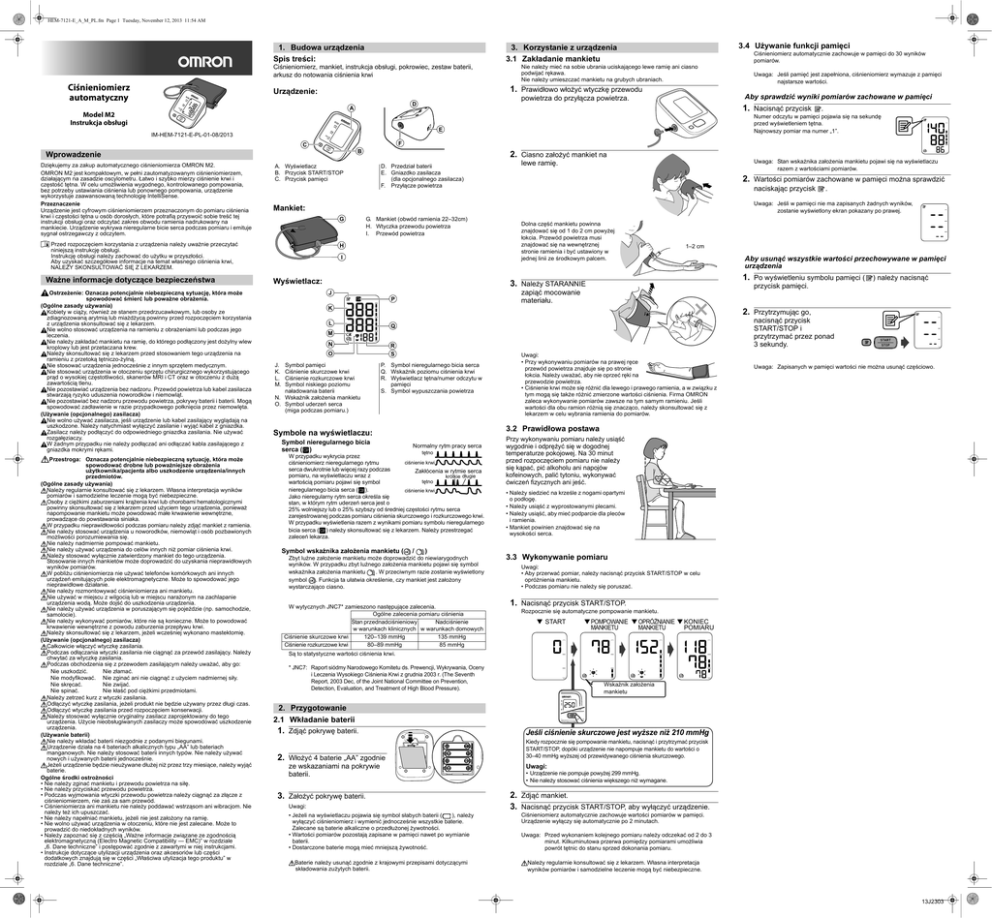 HEM-7121-E_A_M_PL.fm Page 1 Tuesday, November 12, 2013 11:54 AM 1. Budowa urządzenia Spis treści: Ciśnieniomierz, mankiet, instrukcja obsługi, pokrowiec, zestaw baterii, arkusz do notowania ciśnienia krwi Ciśnieniomierz automatyczny . Numer odczytu w pamięci pojawia się na sekundę przed wyświetleniem tętna. Najnowszy pomiar ma numer „1”. E F C B Wprowadzenie 2. Ciasno założyć mankiet na D. Przedział baterii E. Gniazdko zasilacza (dla opcjonalnego zasilacza) F. Przyłącze powietrza A. Wyświetlacz B. Przycisk START/STOP C. Przycisk pamięci Uwaga: Stan wskaźnika założenia mankietu pojawi się na wyświetlaczu razem z wartościami pomiarów. lewe ramię. 2. Wartości pomiarów zachowane w pamięci można sprawdzić naciskając przycisk . Uwaga: Jeśli w pamięci nie ma zapisanych żadnych wyników, zostanie wyświetlony ekran pokazany po prawej. Mankiet: G Przed rozpoczęciem korzystania z urządzenia należy uważnie przeczytać niniejszą instrukcję obsługi. Instrukcję obsługi należy zachować do użytku w przyszłości. Aby uzyskać szczegółowe informacje na temat własnego ciśnienia krwi, NALEŻY SKONSULTOWAĆ SIĘ Z LEKARZEM. Przestroga: Oznacza potencjalnie niebezpieczną sytuację, która może spowodować drobne lub poważniejsze obrażenia użytkownika/pacjenta albo uszkodzenie urządzenia/innych przedmiotów. (Ogólne zasady używania) Należy regularnie konsultować się z lekarzem. Własna interpretacja wyników pomiarów i samodzielne leczenie mogą być niebezpieczne. Osoby z ciężkimi zaburzeniami krążenia krwi lub chorobami hematologicznymi powinny skonsultować się z lekarzem przed użyciem tego urządzenia, ponieważ napompowanie mankietu może powodować małe krwawienie wewnętrzne, prowadzące do powstawania siniaka. W przypadku nieprawidłowości podczas pomiaru należy zdjąć mankiet z ramienia. Nie należy stosować urządzenia u noworodków, niemowląt i osób pozbawionych możliwości porozumiewania się. Nie należy nadmiernie pompować mankietu. Nie należy używać urządzenia do celów innych niż pomiar ciśnienia krwi. Należy stosować wyłącznie zatwierdzony mankiet do tego urządzenia. Stosowanie innych mankietów może doprowadzić do uzyskania nieprawidłowych wyników pomiarów. W pobliżu ciśnieniomierza nie używać telefonów komórkowych ani innych urządzeń emitujących pole elektromagnetyczne. Może to spowodować jego nieprawidłowe działanie. Nie należy rozmontowywać ciśnieniomierza ani mankietu. Nie używać w miejscu z wilgocią lub w miejscu narażonym na zachlapanie urządzenia wodą. Może dojść do uszkodzenia urządzenia. Nie należy używać urządzenia w poruszającym się pojeździe (np. samochodzie, samolocie). Nie należy wykonywać pomiarów, które nie są konieczne. Może to powodować krwawienie wewnętrzne z powodu zaburzenia przepływu krwi. Należy skonsultować się z lekarzem, jeżeli wcześniej wykonano mastektomię. (Używanie (opcjonalnego) zasilacza) Całkowicie włączyć wtyczkę zasilania. Podczas odłączania wtyczki zasilania nie ciągnąć za przewód zasilający. Należy chwytać za wtyczkę zasilania. Podczas obchodzenia się z przewodem zasilającym należy uważać, aby go: Nie uszkodzić. Nie złamać. Nie modyfikować. Nie zginać ani nie ciągnąć z użyciem nadmiernej siły. Nie skręcać. Nie zwijać. Nie spinać. Nie kłaść pod ciężkimi przedmiotami. Należy zetrzeć kurz z wtyczki zasilania. Odłączyć wtyczkę zasilania, jeżeli produkt nie będzie używany przez długi czas. Odłączyć wtyczkę zasilania przed rozpoczęciem konserwacji. Należy stosować wyłącznie oryginalny zasilacz zaprojektowany do tego urządzenia. Użycie nieobsługiwanych zasilaczy może spowodować uszkodzenie urządzenia. (Używanie baterii) Nie należy wkładać baterii niezgodnie z podanymi biegunami. Urządzenie działa na 4 bateriach alkalicznych typu „AA” lub bateriach manganowych. Nie należy stosować baterii innych typów. Nie należy używać nowych i używanych baterii jednocześnie. Jeżeli urządzenie będzie nieużywane dłużej niż przez trzy miesiące, należy wyjąć baterie. Ogólne środki ostrożności • Nie należy zginać mankietu i przewodu powietrza na siłę. • Nie należy przyciskać przewodu powietrza. • Podczas wyjmowania wtyczki przewodu powietrza należy ciągnąć za złącze z ciśnieniomierzem, nie zaś za sam przewód. • Ciśnieniomierza ani mankietu nie należy poddawać wstrząsom ani wibracjom. Nie należy też ich upuszczać. • Nie należy napełniać mankietu, jeżeli nie jest założony na ramię. • Nie wolno używać urządzenia w otoczeniu, które nie jest zalecane. Może to prowadzić do niedokładnych wyników. • Należy zapoznać się z częścią „Ważne informacje związane ze zgodnością elektromagnetyczną (Electro Magnetic Compatibility — EMC)” w rozdziale „6. Dane techniczne” i postępować zgodnie z zawartymi w niej instrukcjami. • Instrukcje dotyczące utylizacji urządzenia oraz akcesoriów lub części dodatkowych znajdują się w części „Właściwa utylizacja tego produktu” w rozdziale „6. Dane techniczne”. Uwaga: Jeśli pamięć jest zapełniona, ciśnieniomierz wymazuje z pamięci najstarsze wartości. 1. Nacisnąć przycisk IM-HEM-7121-E-PL-01-08/2013 Ostrzeżenie: Oznacza potencjalnie niebezpieczną sytuację, która może spowodować śmierć lub poważne obrażenia. (Ogólne zasady używania) Kobiety w ciąży, również ze stanem przedrzucawkowym, lub osoby ze zdiagnozowaną arytmią lub miażdżycą powinny przed rozpoczęciem korzystania z urządzenia skonsultować się z lekarzem. Nie wolno stosować urządzenia na ramieniu z obrażeniami lub podczas jego leczenia. Nie należy zakładać mankietu na ramię, do którego podłączony jest dożylny wlew kroplowy lub jest przetaczana krew. Należy skonsultować się z lekarzem przed stosowaniem tego urządzenia na ramieniu 