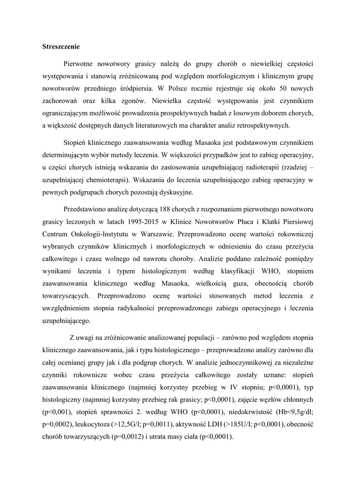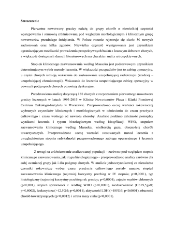 Streszczenie Pierwotne nowotwory grasicy należą do grupy chorób o niewielkiej częstości występowania i stanowią zróżnicowaną pod względem morfologicznym i klinicznym grupę nowotworów przedniego śródpiersia. W Polsce rocznie rejestruje się około 50 nowych zachorowań oraz kilka zgonów. Niewielka częstość występowania jest czynnikiem ograniczającym możliwość prowadzenia prospektywnych badań z losowym doborem chorych, a większość dostępnych danych literaturowych ma charakter analiz retrospektywnych. Stopień klinicznego zaawansowania według Masaoka jest podstawowym czynnikiem determinującym wybór metody leczenia. W większości przypadków jest to zabieg operacyjny, u części chorych istnieją wskazania do zastosowania uzupełniającej radioterapii (rzadziej – uzupełniającej chemioterapii). Wskazania do leczenia uzupełniającego zabieg operacyjny w pewnych podgrupach chorych pozostają dyskusyjne. Przedstawiono analizę dotyczącą 188 chorych z rozpoznaniem pierwotnego nowotworu grasicy leczonych w latach 1995-2015 w Klinice Nowotworów Płuca i Klatki Piersiowej Centrum Onkologii-Instytutu w Warszawie. Przeprowadzono ocenę wartości rokowniczej wybranych czynników klinicznych i morfologicznych w odniesieniu do czasu przeżycia całkowitego i czasu wolnego od nawrotu choroby. Analizie poddano zależność pomiędzy wynikami leczenia i typem histologicznym według klasyfikacji WHO, stopniem zaawansowania klinicznego według Masaoka, wielkością guza, obecnością chorób towarzyszących. Przeprowadzono ocenę wartości stosowanych metod leczenia z uwzględnieniem stopnia radykalności przeprowadzonego zabiegu operacyjnego i leczenia uzupełniającego. Z uwagi na zróżnicowanie analizowanej populacji – zarówno pod względem stopnia klinicznego zaawansowania, jak i typu histologicznego – przeprowadzono analizy zarówno dla całej ocenianej grupy jak i dla podgrup chorych. W analizie jednoczynnikowej za niezależne czynniki rokownicze wobec czasu przeżycia całkowitego zostały uznane: stopień zaawansowania klinicznego (najmniej korzystny przebieg w IV stopniu; p<0,0001), typ histologiczny (najmniej korzystny przebieg rak grasicy; p<0,0001), zajęcie węzłów chłonnych (p<0,001), stopień sprawności 2. według WHO (p<0,0001), niedokrwistość (Hb<9,5g/dl; p=0,0002), leukocytoza (>12,5G/l; p=0,0011), aktywność LDH (>185U/I; p<0,0001), obecność chorób towarzyszących (p=0,0012) i utrata masy ciała (p<0,0001). W grupie chorych poddanych leczeniu chirurgicznemu stopień doszczętności resekcji istotnie wpływał na rokowanie (resekcja R0 wobec R2 oraz wobec biopsji diagnostycznej, odpowiednio: p<0,0001 i p=0,0003). Wielkość guza >10 cm wpływała na mniej korzystny przebieg choroby (p=0,05). Wykazano poprawę wyników leczenia w grupie chorych poddanych ponownemu zabiegowi chirurgicznemu po wystąpieniu nawrotu choroby (p=0,00038). W grupie chorych w II stopniu zaawansowania klinicznego oraz u chorych z rozpoznaniem raka grasicy zastosowanie pooperacyjnej radioterapii wiązało się z istotną korzyścią kliniczną (odpowiednio: p=0,03 i p=0,0005). W okresie obserwacji w całej analizowanej populacji do nawrotu choroby doszło u 50 chorych. W analizie wieloczynnikowej wykazano, że najistotniejszym niezależnym czynnikiem ryzyka dla nawrotu choroby był IV stopień zaawansowania klinicznego (p=0,0036). Ryzyko nawrotu istotnie wzrastało w przypadku rozpoznania raka grasicy (p=0,0036), współwystępowania innych chorób i utraty masy ciała (odpowiednio: p=0,0012 i 0,0348). W analizowanej grupie zgon odnotowano u 63 chorych (33,5%). W większości przypadków przyczyną zgonu była progresja choroby zasadniczej (43 chorych – 68%). Najsilniejszym niezależnym czynnikiem ryzyka zgonu była IV stopień zaawansowania klinicznego (p<0,001). Ponadto ryzyko zgonu istotnie wzrastało u chorych, u których obserwowano utratę masy ciała (p<0,001), obecność chorób współwystępujących (p=0,001) oraz podwyższoną aktywność LDH (p=0,002). Uzyskane wyniki własne potwierdziły dane literaturowe wskazujące, że pierwotne nowotwory grasicy stanowią grupę nowotworów o dość dobrym rokowaniu (mediana czasu przeżycia całkowitego w całej grupie wyniosła 9,7 lat). Przebieg kliniczny jest zróżnicowany, a czynnikiem najsilniej determinującym wyniki prowadzonego leczenia jest stopień klinicznego zaawansowania. Optymalną metodą leczenia jest doszczętny zabieg operacyjny. Zastosowanie pooperacyjnej radioterapii u chorych w II stopniu zaawansowania oraz chorych z rozpoznaniem raka grasicy poprawia rokowanie. Podczas kwalifikowania do leczenia należy uwzględnić obecność chorób współistniejących, które obok podwyższonej aktywności LDH oraz utraty masy ciała w okresie poprzedzającym rozpoznanie choroby, stanowią negatywny czynnik rokowniczy. Leczenie powinno być prowadzone w zespole wielodyscyplinarnym, ze szczególnym uwzględnieniem oceny wskazań do leczenia chirurgicznego, zarówno w momencie rozpoznania jak i nawrotu choroby.
