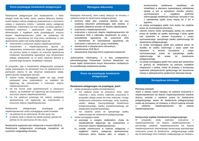 Komu przysługuje świadczenie pielęgnacyjne Świadczenie pielęgnacyjne jest świadczeniem, o które ubiegać może się matka, ojciec, opiekun faktyczny dziecka, osoba będąca rodziną zastępczą spokrewnioną w rozumieniu ustawy o wspieraniu rodziny i systemie pieczy zastępczej (dziadkowie, rodzeństwo) lub inna osoba, na której zgodnie z kodeksem rodzinnym i opiekuńczym ciąży obowiązek alimentacyjny z wyjątkiem osób posiadających znaczny stopień niepełnosprawności, jeżeli nie podejmują lub rezygnują z zatrudnienia lub innej pracy zarobkowej w celu sprawowania opieki nad osobą legitymującą się: orzeczeniem o znacznym stopniu niepełnosprawności; orzeczeniem o niepełnosprawności łącznie ze wskazaniami: konieczności stałej lub długotrwałej opieki lub pomocy osoby w związku ze znacznie ograniczoną możliwości samodzielnej egzystencji oraz konieczności stałego współudziału na co dzień opiekuna dziecka w procesie jego leczenia, rehabilitacji i edukacji. W przypadku, gdy o świadczenie pielęgnacyjne występuje osoba zobowiązana do alimentacji inna niż spokrewniona w pierwszym stopniu to aby otrzymać świadczenie należy spełnić łącznie następujące warunki: rodzice osoby wymagającej opieki nie żyją, zostali pozbawieni praw rodzicielskich, są małoletni lub legitymują się orzeczeniem o znacznym stopniu niepełnosprawności; nie ma innych osób spokrewnionych w pierwszym stopniu, są małoletnie lub legitymują się orzeczeniem o znacznym stopniu niepełnosprawności; nie ma opiekuna prawnego lub rodziny zastępczej spokrewnionej lub legitymują się orzeczeniem o znacznym stopniu niepełnosprawności. Świadczenie pielęgnacyjne przysługuje jeżeli niepełnosprawność osoby wymagającej opieki powstała: nie później niż do ukończenia 18 roku życia, lub w trakcie nauki w szkole lub szkole wyższej, jednak nie później niż do ukończenia 25 roku życia. Świadczenie wypłacane jest miesięcznie w kwocie 620,00 zł. Świadczenie pielęgnacyjne przysługuje niezależnie od wysokości osiągniętego dochodu. Wymagane dokumenty Niezbędne dokumenty, które należy dołączyć do wniosku o ustalenie prawa do świadczenia pielęgnacyjnego: skrócony odpis aktu urodzenia dziecka lub inny urzędowy dokument potwierdzający wiek dziecka, w przypadku składania wniosku na dziecko niepełnoletnie; orzeczenie o niepełnosprawności; orzeczenie o znacznym stopniu niepełnosprawności lub orzeczenie ZUS o całkowitej niezdolności do pracy i samodzielnej egzystencji lub orzeczenie ZUS o niezdolności do samodzielnej egzystencji lub orzeczenie o zaliczeniu do I grupy inwalidzkiej; oświadczenie o ubezpieczeniu zdrowotnym; kwestionariusz ZUS Rp-6; oświadczenie dotyczące formy wypłacania świadczeń. Jednocześnie informujemy, iż w toku postępowania administracyjnego Poznańskie Centrum Świadczeń ma prawo żądać dostarczenia innych dokumentów niezbędnych do prawidłowego rozpatrzenia sprawy. Komu nie przysługuje świadczenie pielęgnacyjne koniecznością kształcenia, rewalidacji lub rehabilitacji w placówce zapewniającej całodobową opiekę, w tym w specjalnym ośrodku szkolnowychowawczym z wyjątkiem podmiotu wykonującego działalność leczniczą i korzysta w niej z całodobowej opieki przez więcej niż 5 dni w tygodniu; na osobę wymagającą opieki inna osoba ma ustalone prawo do wcześniejszej emerytury; członek rodziny osoby sprawującej opiekę ma ustalone prawo do dodatku do zasiłku rodzinnego z tytułu opieki nad dzieckiem w okresie korzystania z urlopu wychowawczego, specjalnego zasiłku opiekuńczego lub świadczenia pielęgnacyjnego; na osobę wymagającą opieki jest ustalone prawo do dodatku do zasiłku rodzinnego z tytułu opieki nad dzieckiem w okresie korzystania z urlopu wychowawczego, prawo do specjalnego zasiłku opiekuńczego lub prawo do świadczenia pielęgnacyjnego; na osobę wymagającą opieki inna osoba jest uprawniona za granicą do świadczenia na pokrycie wydatków związanych z opieką, chyba że przepisy o koordynacji systemów zabezpieczenia społecznego lub dwustronne umowy o zabezpieczeniu społecznym stanowią inaczej. Szczegółowe informacje Świadczenie pielęgnacyjne nie przysługuje, jeżeli: osoba sprawująca opiekę (wnioskodawca): a) ma ustalone prawo do emerytury, renty, renty rodzinnej z tytułu śmierci małżonka przyznanej w przypadku zbiegu prawa do renty rodzinnej i innego świadczenia emerytalno-rentowego, renty socjalnej, zasiłku stałego, nauczycielskiego świadczenia kompensacyjnego, zasiłku przedemerytalnego lub świadczenia przedemerytalnego, b) ma ustalone prawo do specjalnego zasiłku opiekuńczego lub świadczenia pielęgnacyjnego; osoba wymagająca opieki: a) pozostaje w związku małżeńskim, chyba że współmałżonek legitymuje się orzeczeniem o znacznym stopniu niepełnosprawności, b) została umieszczona w rodzinie zastępczej, z wyjątkiem rodziny zastępczej spokrewnionej, rodzinnym domu dziecka albo, w związku z Pierwszy wniosek: Jeżeli w okresie trzech miesięcy od wydania orzeczenia o niepełnosprawności lub stopniu niepełnosprawności zostanie złożony wniosek o ustalenie prawa do świadczenia pielęgnacyjnego, prawo do świadczenia pielęgnacyjnego ustala się począwszy od miesiąca, w którym wpłynął wniosek o ustalenie niepełnosprawności lub stopnia niepełnosprawności. Kontynuacja wypłaty świadczenia pielęgnacyjnego: W przypadku utraty ważności orzeczenia o niepełnosprawności lub stopniu niepełnosprawności i ponownego ustalenia niepełnosprawności lub stopnia niepełnosprawności stanowiącego kontynuację poprzedniego orzeczenia, prawo do świadczenia pielęgnacyjnego ustala się od pierwszego dnia miesiąca następującego po miesiącu, w którym upłynął termin ważności poprzedniego orzeczenia, jeżeli wniosek o ustalenie prawa do świadczenia pielęgnacyjnego zostanie złożony w terminie trzech miesięcy od dnia wyd