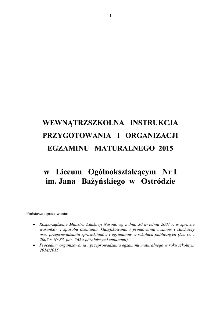 1 WEWNĄTRZSZKOLNA INSTRUKCJA PRZYGOTOWANIA I ORGANIZACJI EGZAMINU MATURALNEGO 2015 w Liceum Ogólnokształcącym Nr I im. Jana Bażyńskiego w Ostródzie Podstawa opracowania: Rozporządzenie Ministra Edukacji Narodowej z dnia 30 kwietnia 2007 r. w sprawie warunków i sposobu oceniania, klasyfikowania i promowania uczniów i słuchaczy oraz przeprowadzania sprawdzianów i egzaminów w szkołach publicznych (Dz. U. z 2007 r. Nr 83, poz. 562 z późniejszymi zmianami) Procedury organizowania i przeprowadzania egzaminu maturalnego w roku szkolnym 2014/2015 2 Spis treści I. Postępowanie z niejawnymi materiałami egzaminacyjnymi ............ str. 3 II. Zasady obiegu informacji ................................................................. str. 5 III. Przygotowanie i organizacja egzaminu w części ustnej ................... str. 8 Informacje ogólne ……………………………………….………… str. 8 Część ustna egzaminu maturalnego z języka polskiego ……..…… str. 9 Część ustna egzaminu maturalnego z języka obcego nowożytnego ..str. 11 IV. Przygotowanie i organizacja egzaminu w części pisemnej ............. str. 13 V. Komunikowanie wyników ................................................................ str. 20 VI. Harmonogram zadań ......................................................................... str. 21 VII. Procedury awaryjne ………………………………………………... str. 23 W instrukcji zastosowano następujące skróty : SZE - Szkolny Zespół Egzaminacyjny PZE - Przedmiotowy Zespół Egzaminacyjny ZN - Zespół Nadzorujący OKE - Okręgowa Komisja Egzaminacyjna CKE - Centralna Komisja Egzaminacyjna 3 I. Postępowanie z niejawnymi materiałami egzaminacyjnymi 1. Niejawnymi materiałami egzaminacyjnymi są zbiory zestawów zadań do części ustnej egzaminu maturalnego oraz przesyłki zawierające pakiety z arkuszami egzaminacyjnymi i innymi materiałami egzaminacyjnymi do części pisemnej egzaminu maturalnego oraz bibliografie do części ustnej egzaminu z języka polskiego (w przypadku absolwentów z roku szkolnego 2013/2014). 2. Przewodniczący SZE lub jego zastępca w kwietniu szkoli i przygotowuje do przeprowadzenia egzaminu nauczycieli swojej szkoły, w tym nauczycieli oddelegowanych do innych szkół. Zakres szkolenia obejmuje w szczególności postępowanie z niejawnymi materiałami egzaminacyjnymi. Zapoznaje nauczycieli spoza szkoły z Wewnątrzszkolną instrukcją przygotowania i organizacji egzaminu maturalnego i obejmuje pełnym przeszkoleniem osoby z innych placówek niż szkoły przeprowadzające egzamin maturalny w danym roku szkolnym. 3. Przewodniczący SZE odbiera od członków SZE oświadczenia o przestrzeganiu ustaleń w sprawie zabezpieczenia materiałów egzaminacyjnych przed nieuprawnionym ujawnieniem. 4. Bibliografie na ustny egzamin z języka polskiego są udostępniane członkom właściwego PZE w sposób określony w rozdziale III, punkt 6. 5. Zestawy zadań i kryteria oceniania na część ustną egzaminu z języka polskiego są udostępniane członkom właściwych PZE w sposób określony w rozdziale III, punkt 8. 6. Zestawy zadań i kryteria oceniania na część ustną egzaminu z języka obcego nowożytnego są udostępniane członkom właściwych PZE w sposób określony w rozdziale III, punkt 11. 7. Przewodniczący SZE lub uprawniony przez niego członek SZE odbiera i w obecności innego członka SZE sprawdza nienaruszenie przesyłek zawierających pakiety z materiałami egzaminacyjnymi. Niejawne materiały egzaminacyjne przechowywane są do dnia przeprowadzenia odpowiedniej części egzaminu w sejfie szkolnym. 8. Klucze do sejfu, w których przechowywane są niejawne materiały egzaminacyjne posiada w okresie ich przechowywania, z zastrzeżeniem pkt. 18, przewodniczący SZE. 9. Przewodniczący SZE sprawdza w każdym dniu egzaminu, przed jego rozpoczęciem, czy pakiety zawierające arkusze i materiały egzaminacyjne są nienaruszone, a w przypadku ich naruszenia niezwłocznie zawiadamia dyrektora OKE. 10. W dniu egzaminu przewodniczący PZE na 15 minut przed egzaminem ustnym zgłasza się do przewodniczącego SZE po odbiór materiałów egzaminacyjnych. Przewodniczący PZE niezwłocznie przenosi te materiały do sali egzaminacyjnej. 11. W dniu egzaminu przewodniczący ZN w obecności przedstawiciela zdających w danej sali na 10 minut przed egzaminem pisemnym zgłasza się do przewodniczącego SZE po odbiór materiałów egzaminacyjnych. Przewodniczący SZE poleca 4 przewodniczącym ZN i przedstawicielom zdających sprawdzenie oznaczeń arkuszy i stron tytułowych widocznych na każdym pakiecie i stwierdzenie, czy przygotowane materiały są właściwe dla danego egzaminu. Przewodniczący SZE w przypadku stwierdzenia, że pakiety są nienaruszone przekazuje przewodniczącemu ZN odpowiednią liczbę arkuszy, który niezwłocznie przenosi te materiały do sali egzaminacyjnej. Arkusze rezerwowe zabezpieczone są w szafie metalowej. 12. Do czasu rozdania arkuszy zdającym nikt nie może mieć wglądu do ich treści. 13. W przypadku stwierdzenia braku stron lub innych usterek w arkuszu przewodniczący zespołu egzaminacyjnego odnotowuje ten fakt w protokole przebiegu egzaminu i podejmuje decyzję o wykorzystaniu arkuszy rezerwowych, a jeśli ich liczba jest niewystarczająca, to powiadamia dyrektora OKE. Zdający czekają na decyzję dyrektora OKE, nie opuszczając sali egzaminacyjnej. Nie wykonuje się kserokopii arkuszy egzaminacyjnych. 14. Po zakończeniu egzaminu lub części egzaminu przewodniczący ZN lub członkowie w obecności dwóch przedstawicieli zdających zbierają arkusze egzaminacyjne. Przewodniczący ZN porządkuje arkusze, pakuje i zabezpiecza, opisuje koperty. Zapakowane arkusze egzaminacyjne, materiały egzaminacyjne, listy zdających, protokoły odbioru prac, nagrane płyty CD-ROM oznaczone numerem PESEL zdającego w przypadku egzaminu z informatyki, niezwłocznie dostarcza prz