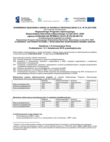 WARMIŃSKO-MAZURSKA AGENCJA ROZWOJU REGIONALNEGO S.A. W OLSZTYNIE jako Instytucja Pośrednicząca Regionalnego Programu Operacyjnego Województwa Warmińsko-Mazurskiego na lata 2014- 2020 ogłasza KONKURS NR RPWM.01.02.01-IP.03-28-001/16 na dofinansowanie projektów ze środków Regionalnego Programu Operacyjnego Województwa Warmińsko- Mazurskiego na lata 2014- 2020 Z ZAKRESU: OSI PRIORYTETOWEJ 1 INTELIGENTNA GOSPODARKA WARMII I MAZUR Działanie 1.2 Innowacyjne firmy Poddziałanie 1.2.1 Działalność B+R przedsiębiorstw Nabór będzie przeprowadzony w trybie zamkniętym. Wartość kwoty przeznaczonej na dofinansowanie projektów 1 w konkursie wynosi 8 000 000,00 EUR co daje kwotę 35 408 800,00 PLN. Kody dotyczące wymiaru zakresu interwencji: 002 - Procesy badawcze i innowacyjne w dużych przedsiębiorstwach; 056 - Inwestycje w infrastrukturę, zdolności i wyposażenie w MŚP, związane bezpośrednio z działaniami badawczymi i innowacyjnymi, 057 - Inwestycje w infrastrukturę, zdolności i wyposażenie w dużych przedsiębiorstwach, związane bezpośrednio z działaniami badawczymi i innowacyjnymi, 063 - Wsparcie dla klastrów i sieci przedsiębiorstw, z korzyścią dla MŚP 064 - procesy badawcze i innowacyjne w MŚP ( w tym systemy bonów) 101 - Finansowanie krzyżowe w ramach EFRR (wsparcie dla przedsięwzięć typowych dla EFS, koniecznych do zadowalającego wdrożenia części przedsięwzięć związanej bezpośrednio z EFRR Maksymalny poziom dofinansowania projektu ze środków Regionalnego Programu Operacyjnego Województwa Warmińsko-Mazurskiego na lata 2014-2020 wynosi: Badania Eksperymentalne Studium Infrastruktura przemysłowe prace rozwojowe Wykonalności B+R Małe przedsiębiorstwo 70% 45% 70% 70% Średnie przedsiębiorstw 60% 35% 60% 60% Duże przedsiębiorstwo 50% 25% 50% 50% Minimalny wkład własny beneficjenta jako % wydatków kwalifikowalnych Badania Eksperymentalne Studium przemysłowe prace rozwojowe Wykonalności Małe przedsiębiorstwo 30% 55% 30% Średnie przedsiębiorstw 40% 65% 40% Duże przedsiębiorstwo 50% 75% 50% Infrastruktura B+R 30% 40% 50% O dofinansowanie mogą ubiegać się: Przedsiębiorstwa (MŚP i duże), Grupy przedsiębiorstw (w tym m.in. porozumienia, sieci, konsorcja) – MŚP i duże; 1 Wartość w PLN została określona według kursu Europejskiego Banku Centralnego z przedostatniego dnia kwotowania środków w miesiącu poprzedzającym miesiąc, w którym ogłoszono konkurs, tj. 29.06.2016, gdzie 1 EUR = 4,4261 PLN. Z uwagi na konieczność ogłoszenia naborów w PLN, wybór projektów do dofinansowania oraz podpisanie umów będzie uzależnione od dostępności środków Konsorcja: przedsiębiorstw, IOB, podmiotów sektora naukowo-badawczego, uczelni, przy czym liderem konsorcjum musi być przedsiębiorstwo. W niniejszym Poddziałaniu dopuszczalne jest aplikowanie o środki przez duże przedsiębiorstwa, pod warunkiem wykazania przez Beneficjenta mechanizmu zapewnienia dyfuzji wyników prowadzonej działalności badawczorozwojowej do gospodarki regionu oraz zapewnienia, że wkład finansowy z funduszy nie spowoduje znacznego ubytku liczby miejsc pracy w istniejących lokalizacjach na terytorium UE Minimalna wartość projektu: 200 000,00 PLN Maksymalna wartość projektu: nie dotyczy Minimalna wartość wydatków kwalifikowalnych projektu (w zależności od wielkości podmiotu): mikro, małe – 200 000,00 PLN, średnie – 400 000,00 PLN, duże – 800 000,00 PLN Maksymalna wartość wydatków kwalifikowalnych projektu (w zależności od wielkości podmiotu): mikro, małe – 1 000 000,00 PLN, średnie – 3 000 000,00 PLN, duże – 5 000 000,00 PLN Przewidziane do wsparcia typy projektów: 1) 2) Wsparcie infrastruktury B+R tj. stworzenia lub rozwoju istniejącego zaplecza badawczo-rozwojowego w postaci: działów B+R w przedsiębiorstwach (w tym laboratoriów) oraz tworzenie centrów badawczorozwojowych. Prowadzenie badań w przedsiębiorstwach, (badań przemysłowych i/lub prac rozwojowych), w tym inwestycje w rzeczowe aktywa trwałe oraz wartości niematerialne i prawne, służące wytworzeniu lub unowocześnieniu infrastruktury badawczej wykorzystywanej do prowadzenia rynkowo zorientowanej działalności badawczo-rozwojowej (np. inwestycje w linie pilotażowe, urządzenia i sprzęt niezbędny do fazy demonstracji, walidacji, testowania jako element większego projektu B+R). W ramach typu 1 i 2 możliwe będzie dofinansowanie kompleksowych działań zmierzających do uzyskania praw wyłącznych do wytworzonych/uzyskanych w ramach projektu własnych rozwiązań technologicznych, zakończone uzyskaniem tych praw. Wsparcie uzyskają przedsięwzięcia do etapu pierwszej produkcji włącznie, która oznacza pierwsze wdrożenie przemysłowe polegające na zwiększeniu skali linii pilotażowych lub zakupie/ wytworzeniu pierwszych w swoim rodzaju urządzeń i obiektów, obejmujące etapy następujące po uruchomieniu linii pilotażowej użytej do fazy testowania. Pierwsza produkcja nie obejmuje produkcji masowej ani działalności handlowej. Zakłada się, że dofinansowanie uzyskać będą mogły przedsięwzięcia obejmujące pierwszą produkcję 2 poprzedzoną wcześniejszymi etapami (prace rozwojowe, faza demonstracji, walidacji) . Projekty dotyczące wyłącznie pierwszej produkcji nie będą kwalifikowane. W przypadku projektów realizowanych przez duże firmy preferencją objęte będą projekty podejmowane wspólnie z MŚP lub przewidujące współpracę z MŚP, NGO i instytucjami badawczymi. W przypadku wsparcia stanowiącego pomoc publiczną, udzielaną w ramach realizacji programu, znajdą zastosowanie właściwe przepisy prawa wspólnotowego i krajowego a wsparcie udzielone zostanie na podstawie Rozporządzenia Komisji (UE) nr 651/2014 z dnia 17 czerwca 2014 r. uznające niektóre rodzaje pomocy za zgodne z rynkiem wewnętrznym w zastosowaniu art. 107 i 108 Traktatu [GBER]; Rozporządzenia Komisji (UE) nr 1407/2013 z dnia 18 g