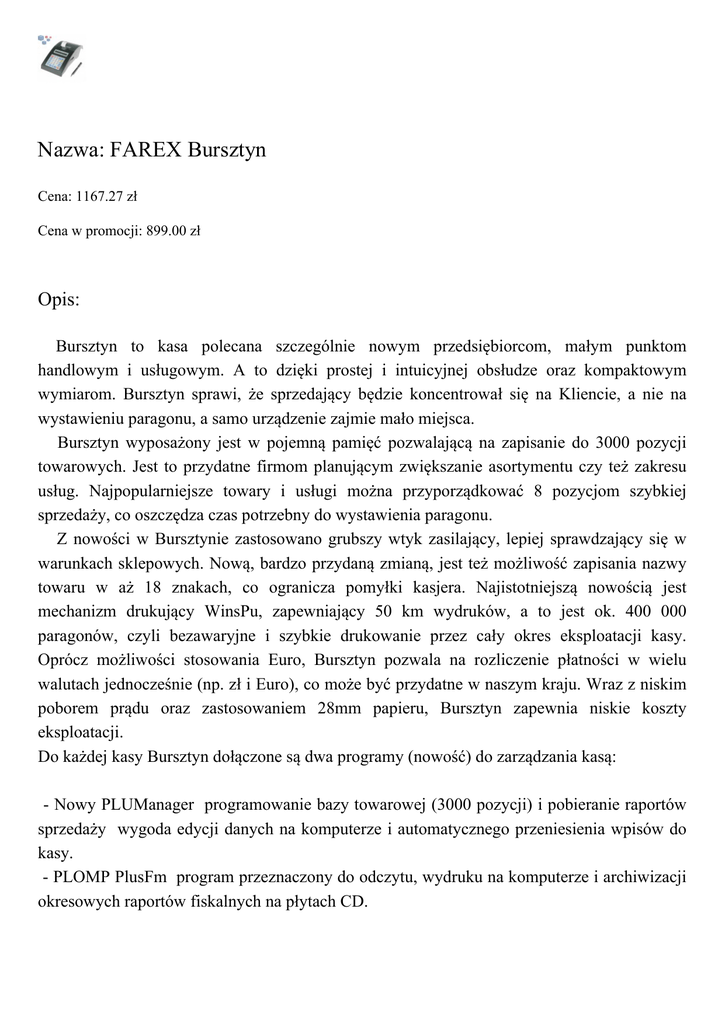 Nazwa: FAREX Bursztyn Cena: 1167.27 zł Cena w promocji: 899.00 zł Opis: Bursztyn to kasa polecana szczególnie nowym przedsiębiorcom, małym punktom handlowym i usługowym. A to dzięki prostej i intuicyjnej obsłudze oraz kompaktowym wymiarom. Bursztyn sprawi, że sprzedający będzie koncentrował się na Kliencie, a nie na wystawieniu paragonu, a samo urządzenie zajmie mało miejsca. Bursztyn wyposażony jest w pojemną pamięć pozwalającą na zapisanie do 3000 pozycji towarowych. Jest to przydatne firmom planującym zwiększanie asortymentu czy też zakresu usług. Najpopularniejsze towary i usługi można przyporządkować 8 pozycjom szybkiej sprzedaży, co oszczędza czas potrzebny do wystawienia paragonu. Z nowości w Bursztynie zastosowano grubszy wtyk zasilający, lepiej sprawdzający się w warunkach sklepowych. Nową, bardzo przydaną zmianą, jest też możliwość zapisania nazwy towaru w aż 18 znakach, co ogranicza pomyłki kasjera. Najistotniejszą nowością jest mechanizm drukujący WinsPu, zapewniający 50 km wydruków, a to jest ok. 400 000 paragonów, czyli bezawaryjne i szybkie drukowanie przez cały okres eksploatacji kasy. Oprócz możliwości stosowania Euro, Bursztyn pozwala na rozliczenie płatności w wielu walutach jednocześnie (np. zł i Euro), co może być przydatne w naszym kraju. Wraz z niskim poborem prądu oraz zastosowaniem 28mm papieru, Bursztyn zapewnia niskie koszty eksploatacji. Do każdej kasy Bursztyn dołączone są dwa programy (nowość) do zarządzania kasą: - Nowy PLUManager programowanie bazy towarowej (3000 pozycji) i pobieranie raportów sprzedaży wygoda edycji danych na komputerze i automatycznego przeniesienia wpisów do kasy. - PLOMP PlusFm program przeznaczony do odczytu, wydruku na komputerze i archiwizacji okresowych raportów fiskalnych na płytach CD. Specyfikacja techniczna: KASA FISKALNA FAREX "BURSZTYN" (KF-03) CECHY GŁÓWNE Typ stacjonarna, przenośna Baza Towarowa (PLU) 3000 Grupy Towarowe 8 Liczba Kasjerów 4 Liczba Stawek VAT 9 MECHANIZM DRUKUJĄCY Rodzaj Termiczny (regulacja kontrastu wydruku) Typ (TP2); 8 linii/s Szerokość Papieru 2 x 28 mm Czujnik Końca Papieru TAK KLAWIATURA Rodzaj Membranowa Liczba Klawiszy 30 ZŁĄCZA Liczba złącz komunikacyjnych 2 Współpraca PC/Skaner/Waga TAK / TAK / TAK Współpraca z Szufladą TAK WYŚWIETLACZE Klient LCD, alfanumeryczny, 14 znaków w wierszu Kasjer LCD, alfanumeryczny, 14 znaków w wierszu ZASILANIE Zasilacz Zewnętrzny INPUT: 100V-240V; 50Hz-60Hz; 0,8A. OUTPUT: DC 7V; 2,8A Akumulator 6V; 3,2 Ah OPROGRAMOWANIE Raporty fiskalne Dobowy - Miesięczny - Okresowy ( wg. dat i wg. numerów raportów dobowych) - PLU Opakowań Zbiorczych - Rozliczeniowy Raporty niefiskalne Poglądowy - PLU - Sprzedaży - Kasowy - Kasjerów - Przyporządkowania Towarów do Grup Towarowych - Opakowań Zwrotnych - Opisów Stałych - Zestaw Raportów Użytkownika Funkcja Przeliczania Waluty TAK - obsługa EURO Funkcja Szybkiej Sprzedaży 8 klawiszy Przypomnienie o Rocznym Przeglądzie TAK Ograniczenie Ceny ograniczenie górnej granicy ceny - grupy towarowe Kontrola Stanów Magazynowych TAK DODATKOWE FUNKCJE Możliwość wporwadzania ceny (z groszami) z przecinkiej - lub bez Zabezpieczenie Poprawności Daty AKCESORIA Szuflada TAK (opcja) Pokrowiec Ochronny TAK (opcja) Zasilacz Samochodowy TAK (opcja) Przewód Komuni. Kasa-PC TAK DANE OGÓLNE Wymiary 140 szer. x 100 wys. x 275 dł. Masa 1,45kg Okres Gwarancji 1 rok Temperatura Pracy od -10°C do +40°C Wszystkie podane ceny, są cenami netto do których należy doliczyć podatek VAT. Cennik nie stanowi oferty handlowej w rozumieniu art. 66 par.1 Kodeksu Cywilnego