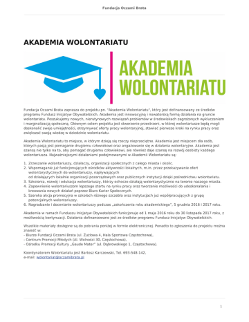 Fundacja Oczami Brata AKADEMIA WOLONTARIATU Fundacja Oczami Brata zaprasza do projektu pn. "Akademia Wolontariatu", który jest dofinansowany ze środków programu Fundusz Inicjatyw Obywatelskich. Akademia jest innowacyjną i nowatorską formą działania na gruncie wolontariatu. Poszukujemy nowych, nierutynowych rozwiązań problemów w środowiskach zagrożonych wykluczeniem i marginalizacją społeczną. Głównym celem projektu jest stworzenie przestrzeni, w której wolontariusze będą mogli doskonalić swoje umiejętności, otrzymywać oferty pracy wolontaryjnej, stawiać pierwsze kroki na rynku pracy oraz zwiększać swoją wiedzę w dziedzinie wolontariatu. Akademia Wolontariatu to miejsce, w którym dzieją się rzeczy nieprzeciętne. Akademia jest miejscem dla osób, których pasją jest pomaganie drugiemu człowiekowi oraz angażowanie się w działania wolontaryjne. Akademia jest szansą nie tylko na to, aby pomagać drugiemu człowiekowi, ale również daje szansę na rozwój osobisty każdego wolontariusza. Najważniejszymi działaniami podejmowanymi w Akademii Wolontariatu są: 1. Zrzeszanie wolontariuszy, działaczy, organizacji społecznych z całego miasta i okolic. 2. Wspomaganie już funkcjonujących ośrodków aktywności lokalnych, m.in. przez przekazywanie ofert wolontarystycznych do wolontariuszy, napływających od działających lokalnie organizacji pozarządowych oraz publicznych instytucji dzięki pośrednictwu wolontariatu. 3. Szkolenia, rozwój i edukacja wolontariuszy, którzy ochoczo działają wolontarystycznie na terenie naszego miasta. 4. Zapewnienie wolontariuszom lepszego startu na rynku pracy oraz tworzenie możliwości do udoskonalania i kreowania nowych działań poprzez Biuro Karier Społecznych. 5. Szeroka akcja promocyjna w szkołach różnego szczebla oraz instytucjach już współpracujących z grupą potencjalnych wolontariuszy. 6. Nagradzanie i docenianie wolontariuszy podczas „zakończenia roku akademickiego”, 5 grudnia 2016 i 2017 roku. Akademia w ramach Funduszu Inicjatyw Obywatelskich funkcjonuje od 1 maja 2016 roku do 30 listopada 2017 roku, z możliwością kontynuacji. Działania dofinansowane jest ze środków programu Fundusz Inicjatyw Obywatelskich. Wszelkie materiały dostępne są do pobrania poniżej w formie elektronicznej. Ponadto to zgłoszenia do projektu można znaleźć w: - Biurze Fundacji Oczami Brata (ul. Żużlowa 4, Hala Sportowa Częstochowa), - Centrum Promocji Młodych (Al. Wolności 30, Częstochowa), - Ośrodku Promocji Kultury „Gaude Mater” (ul. Dąbrowskiego 1, Częstochowa). Koordynatorem Wolontariatu jest Bartosz Karczewski, Tel. 693-548-142, e-mail: [email protected] 1 Fundacja Oczami Brata 2