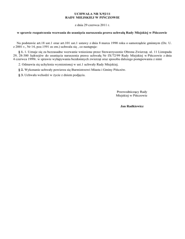 UCHWAŁA NR X/92/11 RADY MIEJSKIEJ W PIŃCZOWIE z dnia 29 czerwca 2011 r. w sprawie rozpatrzenia wezwania do usunięcia naruszenia prawa uchwałą Rady Miejskiej w Pińczowie Na podstawie art.18 ust.1 oraz art.101 ust.1 ustawy z dnia 8 marca 1990 roku o samorządzie gminnym (Dz. U. z 2001 r., Nr 14, poz.1591 ze zm.) uchwala się , co następuje: § 1. 1. Uznaje się za bezzasadne wezwanie wniesione przez Stowarzyszenie Obrona Zwierząt, ul. 11 Listopada 29, 28-300 Jędrzejów do usunięcia naruszenia prawa uchwałą Nr IX/72/99 Rady Miejskiej w Pińczowie z dnia 4 czerwca 1999r. w sprawie wyłapywania bezdomnych zwierząt oraz sposobu dalszego postępowania z nimi 2. Odmawia się uchylenia wymienionej w ust.1 uchwały Rady Miejskiej. § 2. Wykonanie uchwały powierza się Burmistrzowi Miasta i Gminy Pińczów. § 3. Uchwała wchodzi w życie z dniem podjęcia. Przewodniczący Rady Miejskiej w Pińczowie Jan Radkiewicz Uzasadnienie Stowarzyszenie Obrona Zwierząt ul. 11 Listopada 29, 28-300 Jędrzejów pismem z dnia 27 maja 2011r. wezwało Radę Miejską w Pińczowie do wycofania z obrotu prawnego uchwały Rady Miejskiej w Pińczowie podjętej na sesji w dniu 04 czerwca 1999 roku Nr IX/72/99 w sprawie wyłapywania bezdomnych zwierząt oraz sposobu dalszego postępowania z nimi. Na poparcie swojego wniosku Stowarzyszenie podniosło, że powyższa uchwała została podjęta z naruszeniem prawa. Nie zawarto w niej bowiem wymaganego rozstrzygnięcia o dalszym postępowaniu z wyłapanymi zwierzętami. Wymieniona w wezwaniu do uchylenia uchwała Rady Miejskiej w Pińczowie z dnia 04 czerwca 1999 roku Nr IX/72/99 w sprawie wyłapywania bezdomnych zwierząt oraz sposobu dalszego postępowania z nimi została podjęta na podstawie przepisu art.11 ust.1 i 3 ustawy o ochronie zwierząt , który stanowi, że zapewnienie opieki bezdomnym zwierzętom oraz ich wyłapywanie należy do zadań własnych gminy oraz, że wyłapywanie bezdomnych zwierząt oraz rozstrzyganie o dalszym postępowaniu z tymi zwierzętami odbywa się wyłącznie na mocy uchwały rady gminy podjętej po uzgodnieniu z powiatowym lekarzem weterynarii oraz po zasięgnięciu opinii upoważnionego przedstawiciela organizacji społecznej, której statutowym celem działania jest ochrona zwierząt. Powyższy przepis określa dla organu stanowiącego gminy, z jednej strony, kompetencję do wydania aktu prawnego regulującego kwestię wyłapywania bezdomnych zwierząt oraz dalszego z nimi postępowania, a z drugiej strony , zakreśla obszar regulacji poza, który rada gminy nie może wykroczyć. Zgodnie z przepisami ustawy z dnia 8 marca 1990 roku o samorządzie gminnym (Dz. U. z 2001 roku, Nr 142, poz.1591 ze zm.) każda uchwała rady gminy podlega ocenie wojewody na podstawie kryterium zgodności z prawem. Przedmiotowa uchwała stosownie do art.91 ust.1 w/cytowanej ustawy była przedłożona do organu nadzorczego, który nie stwierdził jej niezgodności z prawem. Ponadto w świetle art.94 ust.1 ustawy o samorządzie gminnym nie stwierdza się nieważności uchwały po upływie jednego roku od dnia jej podjęcia, chyba że uchybiono obowiązkowi przedłożenia uchwały wojewodzie celem sprawdzenia jej pod kątem zgodności z prawem, albo jeżeli jest ona aktem prawa miejscowego.
