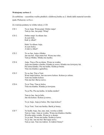 Wuknjemy serbsce 2 Za serbšćinu – cuzorěčnu wučbu předleži z dźěłowej knihu za 2. lětnik dalši material noweho rjadu Wuknjemy serbsce. Za wučerja podamy tu wšitke teksty z CD. CD 1 Tu je Anja. Wona praji: Dobre ranje! Tam je Jan. Jan praji: Witaj! CD 2 Dobre ranje! Ja rěkam Jan. Ja sym hólc. Kak ty rěkaš? Halo! Ja rěkam Anja. Ja sym holca. A kak ty rěkaš? CD 3 To su Jan, Anja a Minka. Jan ma bul. Anja nima bul. Wona ma roler. Tam je Minka. Minka ma myšku. CD 4 Anja, Tina a Pia su doma. Wone su wonka. Anja ma klanku a barika. Klanka je nowa. Klanka ma čerwjeny šat. Pia nima klanku. Pia ma knihu. Kniha je bruna. Tina ma klanku a gameboy. CD 5 To su Jan, Tim a Toni. Woni maja kolesa. Jan ma nowe koleso. Koleso je zelene. Toni ma módre koleso. Tim ma bul. Bul je nowy. CD 6 To je Tina. Tina je holca. Tina ma klanku. Klanka je čerwjena. Tu je Pia. Pia ma knihu. Je kniha módra? Tam je Jan. Jan je hólc. Jan ma koleso. Koleso je nowe. To je Anja. Anja je holca. Ma Anja koleso? Tu je Toni. Toni ma barika. Barik je bruny. CD 7 Tu bydla Anja, Jan, nan, mać, wowka a dźěd. Tam je Anja. Anja je wonka. Wona ma klanku a barika. Wowka njeje wonka. Wona je w domje. To je mać. Wona ma knihu. Kniha je nowa. Tu je Jan. Jan ma bul. Bul njeje nowy. Tam je nan. Nan ma traktor. Je traktor bruny? 1 CD 8 To je moja rjadownja. Wona je rjana. W rjadowni steja blida. Tu je tafla. Tafla je wulka. Wona wisa w rjadowni. Tafla je zelena. Tam steji kamor. Kamor je wulki. W kamorje su knihi. W rjadowni steji papjernik. Papjernik je bruny. Što steji a što wisa w rjadowni? CD 9 To je moja rjadownja. W rjadowni steji blido. Tam je tafla. Tafla je wulka. Wona wisa w rjadowni. Tam steji kamor. Kamor je bruny. W kamorje su knihi. CD 10 To je Anja. Anja ma rjanu tobołu. Toboła je módra. W njej su knihi a zešiwki. Na blidźe je pjerowka. Pjerowka je módra. Tam su tež barbjenčki, knihi, zešiwki, wołojnik a drapak. Anja ma žołty lineal a čerwjeny pjelnjak. Wona ma tež lěpk a nožicy. CD 11 To je Jana. Jana moluje. Wona moluje awto. Awto je módre. Što Jana moluje? To je Tom. Tom pasli. Tom pasli masku. Tom ma nožicy a lěpk. Što Tom pasli? To je Toni. Toni pisa. Toni pisa na taflu. Tafla je zelena. Toni ma krydu. Što pisa Toni na taflu? CD 12 jedyn, dwaj, tři, štyri, pjeć, šěsć, sydom, wosom, dźewjeć, dźesać CD 13 jědnaće, dwanaće, třinaće, štyrnaće, pjatnaće, šěsnaće, sydomnaće, wosomnaće, dźewjatnaće, dwaceći CD 14 Tu je Anja. Wona ma rjanu drastu. Anja ma nowu bluzu. Wona je pisana. Suknja je módra. Anja ma tež nowe cholowy. Cholowy su čorne. CD 15 To je Jan. Wón ma rjanu drasta. Jan ma nowe cholowy. Cholowy su brune. Jan ma rjany čerwjeny pulower. Pulower je tež nowy. Tam je běły pulower. Wón njeje nowy. Na kamorje wisa košla. Wona je zelena. W kamorje wisa tež rjany anorak. CD 16 Moje ćěło To je hłowa. 2 To je nós. To je huba. To je wóčko. To je wucho. To su włosy. To je šija. To je brjuch. To je ruka. To je porst. To je noha. To je koleno. To su palcy. To je chribjet. CD 17 Ja rěkam Beata. Mam rjane brune włosy. Moje cholowy su módre. Ja rěkam Fabian. Ja mam wulki nós. Moja košla je žołta. Ja rěkam Toni. Mam zelenej woči. Moja huba je wulka. Ja rěkam Katja. Ja mam čorne włosy. Moje cholowy su čerwjene. CD 18 Na burskim statoku Tu bydli naša swójba. My mamy wulki dwór. Na dworje je wjele zwěrjatow. Tam su kokoše, ćipki a honač. Honač je pisany. Ćipki su žołte. Tež swinje, nukle, kruwy a konje su na dworje. Tam je kóčka. Wona je čorna. Mamy tež bruneho psyka. Wón rěka Belo. CD 19 Ja sym Tina. To je pola nas doma. Mamy swinje, nukle, kruwy, konje a dwaj psykaj. Tam su kruwy. Kruwy su wonka. Kelko kruwow to je? CD 20 Anja, Jan a mać su w zwěrjencu. Tam su 3 elefanty. Elefanty su wulke. Wone maja wodu. Tu su nopawy. Wone njejsu wulke. Nopawy su na trawje. W zwěrjencu su tež wopicy. Wopicy su brune. Kelko wopicow to je? CD 21 Je nalěćo. Słónco rjenje swěći. Na łuce su rjane kwětki. To su tulpy, krokusy, narcisy a sněhowki. Jan je wonka. Wón kolesuje. Anja je tež wonka. Wona ma bul. Je Minka tež na łuce? CD 22 Je lěćo. Słónco rjenje swěći. Łuka je zelena. Na łuce su rjane pisane kwětki. Anja, Jan a psyk su wonka. Jan ma bul. A što čini Anja? Wona so čumpa. W lěću so dźěći tež rady kupaja. To je wulke wjeselo. Tam je Tina. Wona liza lód. Hmmm, lód je dobry! 3 CD 23 Je nazyma. Wětřik sylnje duje. Lisćo pada ze štoma. Kajke je lisćo? Lisćo je pisane. Anja ma zmija. Zmij ma rjanej woči a čerwjenu hubu. Tu je Jan. Wón pyta hriby. Hriby su brune. Znaješ hriby? CD 24 Je zyma. W zymje so sněži. Sněh je běły. Jan twari sněhoweho muža. Sněhowy muž ma wulki čerwjeny nós a čornej woči. Tam je Anja. Wona ma sanje. Anja sankuje. W zymje dźěći tež rady sněhakuja. To je wulke wjeselo! CD 25 Ptači kwas W januarje maja ptački kwas. Sroka a hawron kwasujetaj. Stajamy taler na wokno. Ptački darja nam pječene sroki a hněžka. To so dźěći wjesela. CD 26 Dźěći swjeća póstnicy. To je wulke wjeselo. Anja je princesna. Wona ma rjany šat. Jan je cowboy a Tim je pirat. Tom je pčołka. Dana je law a Tina je kuzłarka. Feliks je clown a Pia je kóčka. Dźěći maja pisane balonki. Tam steja tež pampuchi. Hmmm, pampuchi jara słodźa. CD 27 W nalěću su jutry. Jan pyta jutrowne jejka. Jejka su pisane. W hněžku su 4 jejka. Tež zajac z šokolady je w hněžku. Na łuce su rjane kwětki. To su tulpy, krokusy a narcisy. Tam je jehnjatko. Wone je běłe. Widźiće bruneho zajaca? CD 28 Anja ma narodniny. Wona so wjeseli. Jan dari knihu. Wowka dari klanku. Tina gratuluje tež k narodninam. Wona ma dar. Tina praji: „Wjele zboža k narodninam!“ A štó dari kwěćel? CD 29 Swjećimy hody. Mamy rjany hodowny štom. Na štomje su kule a swěčki. Kule su pisane. Na kamorje steji rjana pyramida. Tu je rumpodich. Wón ma za Anju a Jana dary. Za Anju ma nowu k