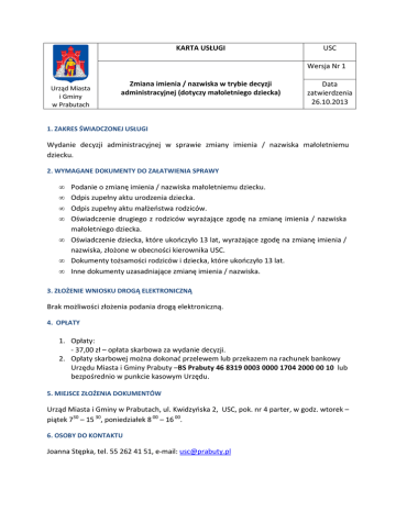 KARTA USŁUGI USC Wersja Nr 1 Urząd Miasta i Gminy w Prabutach Zmiana imienia / nazwiska w trybie decyzji administracyjnej (dotyczy małoletniego dziecka) Data zatwierdzenia 26.10.2013 1. ZAKRES ŚWIADCZONEJ USŁUGI Wydanie decyzji administracyjnej w sprawie zmiany imienia / nazwiska małoletniemu dziecku. 2. WYMAGANE DOKUMENTY DO ZAŁATWIENIA SPRAWY • • • • • • • Podanie o zmianę imienia / nazwiska małoletniemu dziecku. Odpis zupełny aktu urodzenia dziecka. Odpis zupełny aktu małżeństwa rodziców. Oświadczenie drugiego z rodziców wyrażające zgodę na zmianę imienia / nazwiska małoletniego dziecka. Oświadczenie dziecka, które ukończyło 13 lat, wyrażające zgodę na zmianę imienia / nazwiska, złożone w obecności kierownika USC. Dokumenty tożsamości ości rodziców i dziecka, które ukończyło 13 lat. Inne dokumenty uzasadniające zmianę imienia / nazwiska. 3. ZŁOŻENIE WNIOSKU DROGĄ ELEKTRONICZNĄ Brak możliwości złożenia podania drogą elektroniczną. 4. OPŁATY 1. Opłaty: - 37,00 zł – opłata skarbowa za wydanie decyzji. 2. Opłaty skarbowej można dokonać przelewem lub przekazem na rachunek bankowy Urzędu Miasta i Gminy Prabuty –BS BS Prabuty 46 8319 0003 0000 1704 2000 00 10 lub bezpośrednio w punkcie kasowym Urzędu. 5. MIEJSCE ZŁOŻENIA DOKUMENTÓW Urząd Miasta i Gminy w Prabutach, ul. Kwidzyńska 2, USC, pok. nr 4 parter, w godz. wtorek – piątek 730 – 15 30, poniedziałek 8 00 – 16 00. 6. OSOBY DO KONTAKTU Joanna Stępka, tel. 55 262 41 51, e-mail: e [email protected] 7. SPOSÓB I TERMIN ZAŁATWIENIA Nie później niż w ciągu miesiąca, a sprawa szczególnie skomplikowana – nie później niż w ciągu dwóch miesięcy od dnia wszczęcia postępowania. • • • Złożenie podania o zmianę imienia / nazwiska małoletniego dziecka, złożenie aktów stanu cywilnego, wydanie decyzji administracyjnej. 8. TRYB ODWOŁAWCZY W przypadku wydania decyzji odmownej w sprawie zmiany imienia / nazwiska małoletniemu dziecku przysługuje odwołanie do Wojewody Pomorskiego w Gdańsku za pośrednictwem kierownika Urzędu Stanu Cywilnego w terminie 14 dni od dnia otrzymania decyzji. 9. PODSTAWA PRAWNA ustawa z dnia 17.10.2008 roku o zmianie imienia i nazwiska (Dz. U. z 2008 r. Nr 220, poz. 1414), - ustawa z dnia 14.06.1960 roku – Kodeks postępowania administracyjnego (Dz. U. z 2013 r. poz. 267), - ustawa z dnia 16.11.2006 roku o opłacie skarbowej (Dz. U. z 2012 r. poz. 1282 z późn. zm.) - rozporządzenie Ministra Finansów z dnia 28.09.2007 roku w sprawie zapłaty opłaty skarbowej (Dz. U. z 2007 r. Nr 187, poz. 1330). - 10. UWAGI Odpisów aktów stanu cywilnego nie dołącza się, jeżeli zostały one sporządzone w USC w Prabutach. Podanie o zmianę imienia / nazwiska małoletniemu dziecku składa się do kierownika USC w Prabutach - jeżeli wnioskodawca posiada zameldowanie na pobyt stały w Prabutach (lub posiadał ostatnie miejsca pobytu stałego w Prabutach). Jeżeli nie można ustalić właściwości miejscowej w sprawach zmiany imienia / nazwiska rozstrzyga kierownik USC m. st. Warszawy. Osoby zamieszkałe za granicą przedmiotowe podanie mogą złożyć za pośrednictwem polskiego. O zmianę imienia / nazwiska małoletniego dziecka występują oboje rodzice, chyba że jedno z nich nie ma pełnej zdolności do czynności prawnych, nie żyje (należy przedstawić akt zgonu rodzica) lub nie jest znany bądź jest pozbawiony władzy rodzicielskiej (należy przedstawić prawomocne postanowienie sądu). W razie braku porozumienia między rodzicami każde z nich może zwrócić się o rozstrzygnięcie do sądu. Decyzja co do zmiany imienia / nazwiska małoletniego dziecka zapada po uprawomocnieniu się postanowienia sądu. Zmiany imienia / nazwiska można dokonać wyłącznie z ważnych powodów, w szczególności gdy dotyczą zmiany: - imienia / nazwiska ośmieszającego, - na imię / nazwisko używane, - na imię / nazwisko, które zostało bezprawnie zmienione, - na imię / nazwisko noszone zgodnie z przepisami prawa państwa, którego obywatelstwo również się posiada. Imię i Nazwisko, stanowisko Opracował: Joanna Stępka Data i podpis 24.10.2013 Z-ca Kierownika USC w Prabutach Sprawdził: Jędrzej Krasiński 26.10.2013 Sekretarz Miasta i Gminy Prabuty Zatwierdził: Jędrzej Krasiński Sekretarz Miasta i Gminy Prabuty 26.10.2013