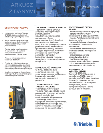 ARKUSZ Z DANYMI CECHY PODSTAWOWE § Uniwersalny tachimetr Trimble SPS720: doskona³y tachimetr robotyczny w przystêpnej cenie § Servo (servomotory), Autolock (automatyczne œledzenie celu), Robotic (robotyczny pomiar jednoosobowy) § Pomiar k¹tów z dok³adnoœci¹ 3” w poziomie i 2” w pionie oraz pomiar odleg³oœci z dok³adnoœci¹ ± 2mm + 2ppm § Praca w trybie robotycznym w zasiêgu do 500m. § Pomiar w trybie bezlustrowym o krótkim zasiêgu, co pozwala na ³atwy i szybki pomiar w miejscach niedostêpnych lub niebezpiecznych § Idealne rozwi¹zanie do pomiarów tradycyjnych, tyczenia a tak¿e prac na mniejszych budowach TACHIMETR TRIMBLE SPS720 TACHIMERT TRIMBLE SPS720 Tachimetr Trimble SPS720 zapewnia wiele sposobów pomiaru jednym urz¹dzeniem. Nowatorskie rozwi¹zania: Servo (serwomechanizmy), Autolock (automatyczne œledzenie celu), Robotic (robotyczny pomiar jednoosobowy), Reflectorless (pomiar bezlustrowy o krótkim zasiêgu) zapewniaj¹ mo¿liwoœæ prowadzenia tradycyjnych pomiarów, pomiarów bezlustrowych oraz tyczenia – wszystko to za pomoc¹ jednego urz¹dzenia. DOK£ADNOŒÆ POMIARU SPS720 zapewnia dwu sekundow¹ pionow¹ i trzy sekundow¹ poziom¹ dok³adnoœæ k¹tow¹, aby sprostaæ wymaganiom wszystkich pomiarów TECHNOLOGIA ACTIVE TARGET TRACKING Technologia Active Target Tracking namierza i œledzi lustra na potrzeby tyczenia, pomiarów, kontroli nachylenia i monitorowania. Aktywne cele zapewniaj¹ zwiêkszon¹ wydajnoœæ œledzenia i gwarantuj¹ namierzenie w³aœciwego celu, nawet w warunkach du¿ego zapylenia na placach budowy. PODSTAWOWE CECHY SPS720 - wbudowany pionownik optyczny - opcja pomiaru w trybie robotycznym o zasiêgu do 500m - funkcja Autolock (automatyczne œledzenie celu) - dwa wyœwietlacze u³atwiaj¹ce rozstawienie i nawi¹zanie instrumentu - nowoczesne serwomotory o prêdkoœci obrotu 86 stopni na sekundê - aktualizacja pozycji z czêstotliwoœci¹ 2.5Hz - mo¿liwoœæ pomiaru bezlustrowego o krótkim zasiêgu - ni¿sza cena (w porównaniu z tachimetrami z serii SPSx30) WSPÓ£PRACA Z KONTROLERAMI Tachimetr SPS720 pracuje z kontrolerem TSC2, nowym kontrolerem TSC3 lub z tabletem Trimble (opcjonalnie tak¿e z kontrolerem TCU z uchwytem robotycznym) oraz z oprogramowaniem Trimble SCS900 Site Controller. ARKUSZ Z DANYMI TACHIMETR TRIMBLE SPS720 SPECYFIKACJA TECHNICZNA ród³o œwiat³a WskaŸnik laserowy Dioda laserowa 660nm, laser klasy 1w trybie pomiaru na lustro Laser klasy 3R w trybie bezlustrowym Laser klasy 3R Pomiar k¹ta Dok³adnoœæ horyzontalna (Odchylenie standardowe bazuj¹ce na DIN 18723) Dok³adnoœæ wertykalna (Odchylenie standardowe bazuj¹ce na DIN 18723) 3" (1.0 mgon) 2" (0.6 mgon) Odczyt k¹ta (Najmniejsza wartoœæ) Standard Pomiar ci¹g³y (Tracking) 1" (0.3 mgon) 2" (0.6 mgon) Automatyczny kompensator Kompensator dwuosiowy +/- 5.4' (+/- 100 mgon) Dok³adnoœæ Pomiaru Odleg³oœci (Odchylenie Standardowe), z Pryzmatem Standard (zgodnie z ISO17123-4) Standard (zgodnie z ISO17123-4) Œledzenie ±(2 mm + 2 ppm) ±(0.0065 ft + 2 ppm) ±(1.5 mm + 2 ppm) ±(0.0049 ft + 2 ppm) ±(2 mm + 2 ppm) ±(0.0065 ft + 2 ppm) Pomiar Dynamiczny (Odchylenie Standardowe) Zsynchronizowany pomiar k¹ta i odleg³oœci Zmaksymalizowana czêstoœæ aktualizacji pozycji Nie 2.5Hz Bezlustrowo Standard Pomiar ci¹g³y (Tracking) ±(3 mm + 2 ppm) ±(0.01 ft + 2 ppm) ±(10 mm + 2 ppm) ±(0.032 ft + 2 ppm) Zasiêg (w dobrych warunkach pogodowych), z Pryzmatem 1 pryzmat 3 pryzmaty Minimalna odleg³oœæ pomiaru 2,500 m 5,000 m (16,404 stóp) max. zasiêg 0.2 m (0.65 ft) Zasiêg (w dobrych warunkach pogodowych), Bezlustrowo Szara karta Kodak (18% odbicia) Szara karta Kodak (90% odbicia) >300 m (984 stóp) >800 m (2625 stóp) Zasiêg (w trudnych warunkach pogodowych), Bezlustrowo Szara karta Kodak (18% odbicia) Szara karta Kodak (90% odbicia) >150 m (492 stóp) >200 m (656 stóp) Poziomowanie Libella w spodarce Elektroniczna libella 2-osiowa na ekranie LCD Servo system Prêdkoœæ obrotu Szybkoœæ pozycjonowania - Zmiana po³o¿enia lunety Zaciski i ruch leniwy Technologia napêdu magnetycznego 86 stopni/sek. (95,56 gon/sec) 3.2 sek. 1.5m (4.9 stóp) Zasilanie Bateria wewnêtrzna Litowo-jonowa bateria 11,1V; 4,4 Ah Czas pracy Jedna bateria wewnêtrzna Trzy baterie wewnêtrzne w adapterze Uchwyt robotyczny z jedn¹ bateri¹ wewnêtrzn¹ ok. 6 godzin ok. 18 godzin ok.. 12 godzin 8'/2 mm (8'/0.007 stóp) 0.3" (0.1 mgon) Zasiêg Robotyczny Autolock Automatyczny pomiar do lustra Trimble MT1000 Najkrótsza odleg³oœæ wyszukiwania Dok³adnoœæ celowania na dystansie 200 m. (656 ft) (Odchylenie standardowe) 300 - 500 m (984 - 1,640 stóp) 300 - 500 m (984 - 1,640 stóp) 500 m (1,640 stóp) 0.2 m (.65 stóp) <2 mm (0.007 stóp) www.trimble.com AMERYKA PÓ£NOCNA EUROPA AZJA - PACYFIK Trimble Construction Division 5475 Kellenburger Road Dayton, Ohio 45424 USA 800-538-7800 (numer bezp³atny) +1-937-245-5154 telefon +1-937-233-9441 fax Trimble GmbH Am Prime Parc 11 65479 Raunheim NIEMCY +49-6142-2100-0 telefon +49-6142-2100-550 fax Trimble Navigation Singapore PTE Ltd. 80 Marine Parade Road, #2206 Parkway Parade Singapore, 449269 Singapore +65 6348 2212 telefon +65 6348 2232 fax © 2010, Trimble Navigation Limited. All rights reserved. Trimble, and the Globe & Triangle logo are trademarks of Trimble Navigation Limited, registered in the United States and in other countries. All other trademarks are the property www.trimble.com