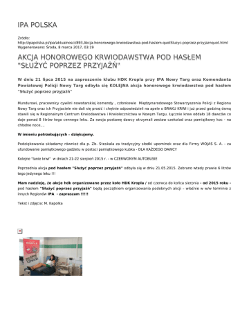 IPA POLSKA Źródło: http://ipapolska.pl/ipa/aktualnosci/893,Akcja-honorowego-krwiodawstwa-pod-haslem-quotSluzyc-poprzez-przyjaznquot.html Wygenerowano: Środa, 8 marca 2017, 03:19 AKCJA HONOROWEGO KRWIODAWSTWA POD HASŁEM "SŁUŻYĆ POPRZEZ PRZYJAŹŃ" W dniu 21 lipca 2015 na zaproszenie klubu HDK Kropla przy IPA Nowy Targ oraz Komendanta Powiatowej Policji Nowy Targ odbyła się KOLEJNA akcja honorowego krwiodawstwa pod hasłem "Służyć poprzez przyjaźń" Mundurowi, pracownicy cywilni nowotarskiej komendy , członkowie Międzynarodowego Stowarzyszenia Policji z Regionu Nowy Targ oraz ich Przyjaciele nie dali się prosić i chętnie odpowiedzieli na apele o BRAKU KRWI i już przed godziną ósmą stawili się w Regionalnym Centrum Krwiodawstwa i Krwiolecznictwa w Nowym Targu. Łącznie krew oddało 18 dawców co daje ponad 8 litrów tego cennego leku. Za swoja postawę dawcy otrzymali zestaw czekolad oraz pamiątkowy koc - na chłodne noce.... W imieniu potrzebujących – dziękujemy. Podziękowania składamy również dla p. Zb. Steskala za tradycyjny słodki upominek oraz dla Firmy WOJAS S. A. - za ufundowanie pamiątkowego gadżetu w postaci pamiątkowego kubka - DLA KAŻDEGO DAWCY Kolejne "lanie krwi" w dniach 21-22 sierpień 2015 r. - w CZERWONYM AUTOBUSIE Poprzednia akcja pod hasłem "Służyć poprzez przyjaźń" odbyła się w dniu 21.05.2015. Zebrano wtedy prawie 6 litrów tego jedynego leku !!! Mam nadzieję, że akcje hdk organizowane przez koło HDK Kropla / od czerwca do końca sierpnia - od 2015 roku pod hasłem "Służyć poprzez przyjaźń" będą początkiem organizowania podobnych akcji – właśnie w w/w terminie z innych Regionów IPA - zapraszam !!!!! Tekst i zdjęcia: M. Kapołka Ocena: 0/5 (0) Tweetnij