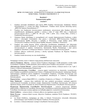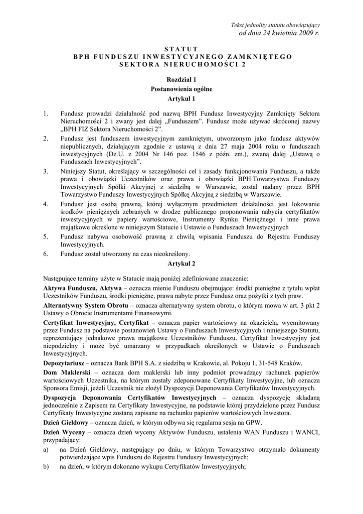 Tekst jednolity statutu obowiązujący od dnia 24 kwietnia 2009 r. STATUT BPH FUNDUSZU INWESTYCYJNEGO ZAMKNIĘTEGO SEKTORA NIERUCHOMOŚCI 2 Rozdział 1 Postanowienia ogólne Artykuł 1 1. 2. 3. 4. 5. 6. Fundusz prowadzi działalność pod nazwą BPH Fundusz Inwestycyjny Zamknięty Sektora Nieruchomości 2 i zwany jest dalej „Funduszem”. Fundusz może używać skróconej nazwy „BPH FIZ Sektora Nieruchomości 2”. Fundusz jest funduszem inwestycyjnym zamkniętym, utworzonym jako fundusz aktywów niepublicznych, działającym zgodnie z ustawą z dnia 27 maja 2004 roku o funduszach inwestycyjnych (Dz.U. z 2004 Nr 146 poz. 1546 z późn. zm.), zwaną dalej „Ustawą o Funduszach Inwestycyjnych”. Niniejszy Statut, określający w szczególności cel i zasady funkcjonowania Funduszu, a także prawa i obowiązki Uczestników oraz prawa i obowiązki BPH Towarzystwa Funduszy Inwestycyjnych Spółki Akcyjnej z siedzibą w Warszawie, został nadany przez BPH Towarzystwo Funduszy Inwestycyjnych Spółkę Akcyjną z siedzibą w Warszawie. Fundusz jest osobą prawną, której wyłącznym przedmiotem działalności jest lokowanie środków pieniężnych zebranych w drodze publicznego proponowania nabycia certyfikatów inwestycyjnych w papiery wartościowe, Instrumenty Rynku Pieniężnego i inne prawa majątkowe określone w niniejszym Statucie i Ustawie o Funduszach Inwestycyjnych Fundusz nabywa osobowość prawną z chwilą wpisania Funduszu do Rejestru Funduszy Inwestycyjnych. Fundusz został utworzony na czas nieokreślony. Artykuł 2 Następujące terminy użyte w Statucie mają poniżej zdefiniowane znaczenie: Aktywa Funduszu, Aktywa – oznacza mienie Funduszu obejmujące: środki pieniężne z tytułu wpłat Uczestników Funduszu, środki pieniężne, prawa nabyte przez Fundusz oraz pożytki z tych praw. Alternatywny System Obrotu – oznacza alternatywny system obrotu, o którym mowa w art. 3 pkt 2 Ustawy o Obrocie Instrumentami Finansowymi. Certyfikat Inwestycyjny, Certyfikat – oznacza papier wartościowy na okaziciela, wyemitowany przez Fundusz na podstawie postanowień Ustawy o Funduszach Inwestycyjnych i niniejszego Statutu, reprezentujący jednakowe prawa majątkowe Uczestników Funduszu. Certyfikat Inwestycyjny jest niepodzielny i może być umarzany w przypadkach określonych w Ustawie o Funduszach Inwestycyjnych. Depozytariusz – oznacza Bank BPH S.A. z siedzibą w Krakowie, al. Pokoju 1, 31-548 Kraków. Dom Maklerski – oznacza dom maklerski lub inny podmiot prowadzący rachunek papierów wartościowych Uczestnika, na którym zostały zdeponowane Certyfikaty Inwestycyjne, lub oznacza Sponsora Emisji, jeżeli Uczestnik nie złożył Dyspozycji Deponowania Certyfikatów Inwestycyjnych. Dyspozycja Deponowania Certyfikatów Inwestycyjnych – oznacza dyspozycję składaną jednocześnie z Zapisem na Certyfikaty Inwestycyjne, na podstawie której przydzielone przez Fundusz Certyfikaty Inwestycyjne zostaną zapisane na rachunku papierów wartościowych Inwestora. Dzień Giełdowy – oznacza dzień, w którym odbywa się regularna sesja na GPW. Dzień Wyceny – oznacza dzień wyceny Aktywów Funduszu, ustalenia WAN Funduszu i WANCI, przypadający: a) na Dzień Giełdowy, następujący po dniu, w którym Towarzystwo otrzymało dokumenty potwierdzające wpis Funduszu do Rejestru Funduszy Inwestycyjnych; b) na dzień, w którym dokonano wykupu Certyfikatów Inwestycyjnych; c) d) na ostatni Dzień Giełdowy w miesiącach: marzec, czerwiec, wrzesień, grudzień; na siedem dni przed rozpoczęciem przyjmowania zapisów na Certyfikaty Inwestycyjne kolejnej emisji; e) na siódmy Dzień Giełdowy poprzedzający dzień rozpoczęcia likwidacji Funduszu, z zastrzeżeniem sytuacji opisanej w art. 42 ust. 2. Fundusz - oznacza BPH Fundusz Inwestycyjny Zamknięty Sektora Nieruchomości 2. GPW – oznacza Giełdę Papierów Wartościowych w Warszawie S.A. z siedzibą w Warszawie. Instrumenty Pochodne – oznaczają prawa majątkowe, których cena rynkowa zależy bezpośrednio lub pośrednio od ceny lub wartości papierów wartościowych, o których mowa w art. 3 pkt 1 lit. a) Ustawy o Obrocie Instrumentami Finansowymi, oraz inne prawa majątkowe, których cena rynkowa bezpośrednio lub pośrednio zależy od kształtowania się ceny rynkowej walut obcych lub od zmiany wysokości stóp procentowych. Instrumenty Rynku Pieniężnego – rozumie się przez to instrumenty rynku pieniężnego w rozumieniu Ustawy o Funduszach Inwestycyjnych. Inwestor – oznacza osobę fizyczną, osobę prawną lub jednostkę organizacyjną nieposiadającą osobowości prawnej, która składa bądź zamierza złożyć Zapis. KDPW – oznacza Krajowy Depozyt Papierów Wartościowych S.A. Komitet Doradczy - oznacza zespół złożony z osób dysponujących kwalifikacjami i doświadczeniem w zakresie rynku finansowego lub rynku nieruchomości, przedstawiający Towarzystwu ocenę planowanych lokat Funduszu oraz opinię co do zrealizowania transakcji lub jej odrzucenia, przy czym niewyrażenie opinii przez Komitet Doradczy nie wstrzymuje procesu inwestycyjnego. Towarzystwo może ponadto występować do Komitetu Doradczego o opinie dotyczące sposobu finansowania lokat Funduszu, a także wyrażenie opinii, której przedmiotem są inne kwestie związane z realizacją polityki inwestycyjnej Funduszu. W skład Komitetu Doradczego wchodzą nie więcej niż 4 (słownie: cztery) osoby wyznaczone samodzielnie przez Towarzystwo, a także osoby wyznaczone przez Uczestnika lub grupę Uczestników posiadających co najmniej 5% (słownie: pięć procent) ogólnej liczby Certyfikatów, przy czym na każde 5% (słownie: pięć procent) ogólnej liczby Certyfikatów Inwestycyjnych może być wyznaczony 1 (słownie: jeden) członek Komitetu Doradczego. Członkami Komitetu Doradczego nie mogą być osoby wyznaczone przez Uczestników prowadzących działalność sprzeczną z interesem Towarzystwa lub Funduszu, w tym działalność konkurencyj