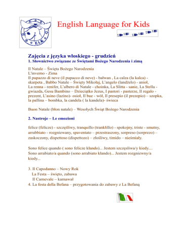 English Language for Kids Zajęcia z języka włoskiego - grudzień 1. Słownictwo związane ze Świętami Bożego Narodzenia i zimą Il Natale – Święta Bożego Narodzenia L'inverno - Zima Il pupazzo di neve (il pupacco di neve) - bałwan , La calza (la kalca) skarpeta , Babbo Natale – Święty Mikołaj, L’angelo (landżelo) - anioł, La renna - renifer, L’albero di Natale - choinka, La Slitta - sanie, La Stella gwiazda, Gesu Bambino – Dzieciątko Jezus, I pastori - pasterze, Il regalo prezent, L’asino (lazino)- osioł, Il bue - wół, Il presepio (il prezepio) – szopka, la pallina – bombka, la candela ( la kandela)- świeca Buon Natale (błon natale) – Wesołych Świąt Bożego Narodzenia 2. Nastroje – Le emozioni felice (felicze) - szczęśliwy, tranquillo (trankłillo) - spokojny, triste - smutny, arrabbiato - rozgniewany, spaventato – przestraszony, sorpreso (sorprezo) – zaskoczony, dispettoso (dispettozo) – złośliwy, timido – nieśmiały. Sono felice quando ( sono felicze kłando)... Jestem szczęsliwa/y kiedy.... Sono arrabiato/a quando (sono arrabiato kłando)... Jestem rozgniewny/a kiedy... 3. Il Capodanno – Nowy Rok La Festa – święto, zabawa Il Carnevale – karnawał 4. La festa della Befana – przygotowania do zabawy z La Befaną
