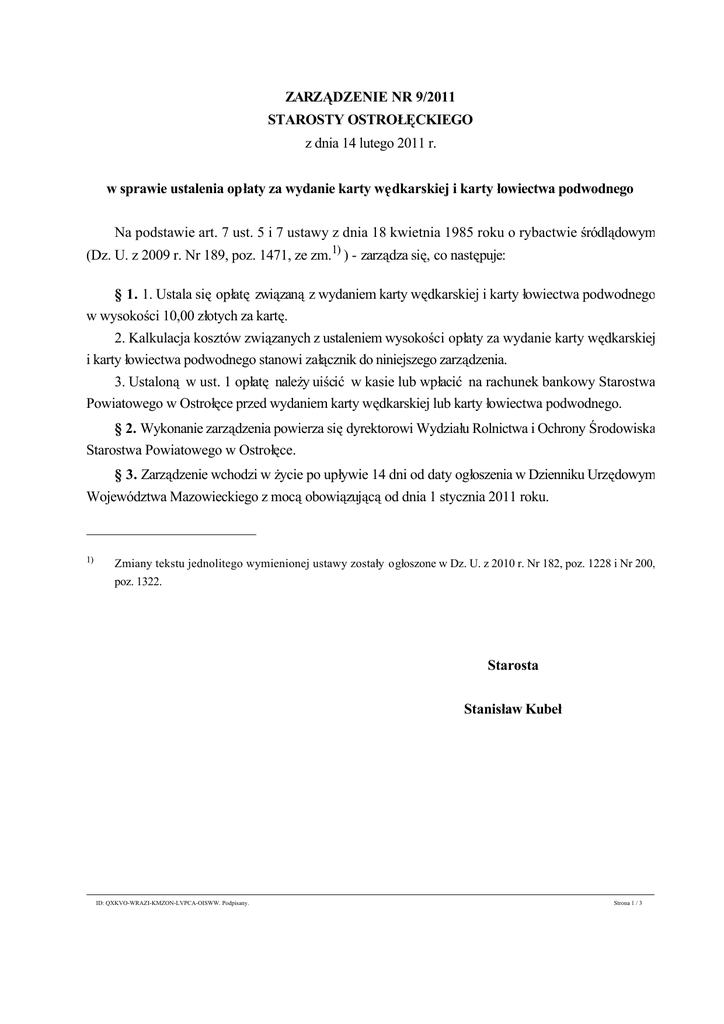 ZARZĄDZENIE NR 9/2011 STAROSTY OSTROŁĘCKIEGO z dnia 14 lutego 2011 r. w sprawie ustalenia opłaty za wydanie karty wędkarskiej i karty łowiectwa podwodnego Na podstawie art. 7 ust. 5 i 7 ustawy z dnia 18 kwietnia 1985 roku o rybactwie śródlądowym (Dz. U. z 2009 r. Nr 189, poz. 1471, ze zm.1) ) - zarządza się, co następuje: § 1. 1. Ustala się opłatę związaną z wydaniem karty wędkarskiej i karty łowiectwa podwodnego w wysokości 10,00 złotych za kartę. 2. Kalkulacja kosztów związanych z ustaleniem wysokości opłaty za wydanie karty wędkarskiej i karty łowiectwa podwodnego stanowi załącznik do niniejszego zarządzenia. 3. Ustaloną w ust. 1 opłatę należy uiścić w kasie lub wpłacić na rachunek bankowy Starostwa Powiatowego w Ostrołęce przed wydaniem karty wędkarskiej lub karty łowiectwa podwodnego. § 2. Wykonanie zarządzenia powierza się dyrektorowi Wydziału Rolnictwa i Ochrony Środowiska Starostwa Powiatowego w Ostrołęce. § 3. Zarządzenie wchodzi w życie po upływie 14 dni od daty ogłoszenia w Dzienniku Urzędowym Województwa Mazowieckiego z mocą obowiązującą od dnia 1 stycznia 2011 roku. 1) Zmiany tekstu jednolitego wymienionej ustawy zostały ogłoszone w Dz. U. z 2010 r. Nr 182, poz. 1228 i Nr 200, poz. 1322. Starosta Stanisław Kubeł Załącznik do Zarządzenia Nr 9/2011 Starosty Ostrołęckiego z dnia 14 lutego 2011 r. KALKULACJA KOSZTÓW DO USTALENIA WYSOKOŚCI OPŁATY ZA CZYNNOŚCI Strona 1 / 3 URZĘDOWE ZWIĄZANE Z ODPŁATNYM WYDAWANIEM PRZEZ STAROSTWO POWIATOWE W OSTROŁĘCE KARTY WĘDKARSKIEJ LUB KARTY ŁOWIECTWA PODWODNEGO ID: QXKVO-WRAZI-KMZON-LVPCA-OISWW. Podpisany. I. Nakład pracy w roboczogodzinach przy wydaniu karty wędkarskiej lub karty łowiectwa podwodnego. Stanisław Kubeł Załącznik do Zarządzenia Nr 9/2011 Starosty Ostrołęckiego z dnia 14 lutego 2011 r. KALKULACJA KOSZTÓW DO USTALENIA WYSOKOŚCI OPŁATY ZA CZYNNOŚCI URZĘDOWE ZWIĄZANE Z ODPŁATNYM WYDAWANIEM PRZEZ STAROSTWO POWIATOWE W OSTROŁĘCE KARTY WĘDKARSKIEJ LUB KARTY ŁOWIECTWA PODWODNEGO I. Nakład pracy w roboczogodzinach przy wydaniu karty wędkarskiej lub karty łowiectwa podwodnego. L.p. Zakres czynności Nakład pracy roboczogodzinach (w minutach) 1. Przyjęcie wniosku o wydanie karty wędkarskiej lub karty łowiectwa 10 podwodnego w tym: weryfikacja wniosku pod względem formalnym i merytorycznym (sprawdzenie prawidłowości wypełnienia formularza, sprawdzenie zaświadczenia o zdaniu egzaminu ze znajomości ochrony i połowu ryb). 2. Wypełnienie i opieczętowanie karty wędkarskiej lub karty łowiectwa 10 podwodnego. 3. Wydanie karty wędkarskiej lub karty łowiectwa podwodnego w tym: przyjęcie dowodu wpłaty, zarejestrowanie karty. 5 Razem 25 II. Stawka za roboczogodzinę. Średnie miesięczne wynagrodzenie brutto wraz z pochodnymi (z trzech miesięcy za okres IV kwartału 2010 r.) przypadające na 1 pracownika wydającego karty: 3 427,20 złotych. III. Wysokość opłaty za czynności urzędowe. koszt 1 roboczogodziny: 3427,20 zł m-c/21 dni roboczych/8 godzin = 20,40 zł, koszt czynności urzędowych: 20,40 zł x 25 min. = 8,50 zł. IV. Kalkulacja opłaty za zakup i wydanie karty wędkarskiej lub karty łowiectwa podwodnego w złotych. Cena zakupu karty wędkarskiej (brutto zł.) Koszt materiałów (toner do drukarki, klej, długopis, nożyczki, papier, itp.) Opłata za czynności urzędowe Razem koszty zakupu Strona 2 / 3 0,45 1,05 8,50 10,00 ID: QXKVO-WRAZI-KMZON-LVPCA-OISWW. Podpisany. i wydania karty wędkarskiej koszt czynności urzędowych: 20,40 zł x 25 min. = 8,50 zł. IV. Kalkulacja opłaty za zakup i wydanie karty wędkarskiej lub karty łowiectwa podwodnego w złotych. Cena zakupu karty wędkarskiej (brutto zł.) Koszt materiałów (toner do drukarki, klej, długopis, nożyczki, papier, itp.) Opłata za czynności urzędowe Razem koszty zakupu 0,45 1,05 8,50 10,00 ID: QXKVO-WRAZI-KMZON-LVPCA-OISWW. Podpisany. i wydania karty wędkarskiej Strona 3 / 3