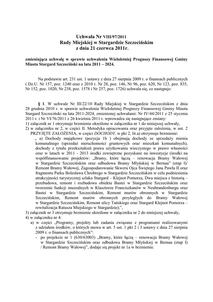 Uchwała Nr VIII/97/2011 Rady Miejskiej w Stargardzie Szczecińskim z dnia 21 czerwca 2011r. zmieniająca uchwałę w sprawie uchwalenia Wieloletniej Prognozy Finansowej Gminy Miasta Stargard Szczeciński na lata 2011 – 2024. Na podstawie art. 231 ust. 1 ustawy z dnia 27 sierpnia 2009 r. o finansach publicznych ( Dz.U. Nr 157, poz. 1240 oraz z 2010 r. Nr 28, poz. 146, Nr 96, poz. 620, Nr 123, poz. 835, Nr 152, poz. 1020, Nr 238, poz. 1578 i Nr 257, poz. 1726) uchwala się, co następuje: § 1. W uchwale Nr III/22/10 Rady Miejskiej w Stargardzie Szczecińskim z dnia 28 grudnia 2010 r. w sprawie uchwalenia Wieloletniej Prognozy Finansowej Gminy Miasta Stargard Szczeciński na lata 2011-2024, zmienionej uchwałami: Nr IV/44/2011 z 25 stycznia 2011 r. i Nr VI/76/2011 z 26 kwietnia 2011 r. wprowadza się następujące zmiany: 1) załącznik nr 1 otrzymuje brzmienie określone w załączniku nr 1 do niniejszej uchwały, 2) w załączniku nr 2, w części II. Metodyka opracowania oraz przyjęte założenia, w ust. 2 PRZYJĘTE ZAŁOŻENIA, w części DOCHODY, w pkt 2, lit.a) otrzymuje brzmienie: „ a) Dochody majątkowe (pozycja 1b ) obejmują dochody ze sprzedaży mienia komunalnego (sprzedaż nieruchomości gruntowych oraz mieszkań komunalnych), dochody z tytułu przekształceń prawa użytkowania wieczystego w prawo własności oraz w latach w 2011 - 2013 środki zewnętrzne pozyskane na inwestycje (środki na współfinansowanie projektów: „Bramy, które łączą – renowacja Bramy Wałowej w Stargardzie Szczecińskim oraz odbudowa Bramy Młyńskiej w Bernau” (etap I)/ Remont Bramy Wałowej, Zagospodarowanie Skweru Ojca Świętego Jana Pawła II oraz fragmentu Parku Bolesława Chrobrego w Stargardzie Szczecińskim w celu podniesienia atrakcyjności turystycznej szlaku Stargard – Klejnot Pomorza, Dwa miejsca z historią – przebudowa, remont i rozbudowa obiektu Bastei w Stargardzie Szczecińskim oraz tworzenie funkcji muzealnych w Klasztorze Franciszkanów w Neubrandenburgu oraz Bastei w Stargardzie Szczecińskim, Remont murów obronnych w Stargardzie Szczecińskim, Remont murów obronnych przyległych do Bramy Wałowej w Stargardzie Szczecińskim, Remont ulicy Tańskiego oraz Stargard Klejnot Pomorza – rewitalizacja Ratusza Miejskiego w Stargardzie);”, 3) załącznik nr 3 otrzymuje brzmienie określone w załączniku nr 2 do niniejszej uchwały, 4) w załączniku nr 4: a) w części „Programy, projekty lub zadania związane z programami realizowanymi z udziałem środków, o których mowa w art. 5 ust. 1 pkt 2 i 3 ustawy z dnia 27 sierpnia 2009 r. o finansach publicznych”: - po projekcie nr 1 (630/63003) „Bramy, które łączą – renowacja Bramy Wałowej w Stargardzie Szczecińskim oraz odbudowa Bramy Młyńskiej w Bernau (etap I) / Remont Bramy Wałowej”, dodaje się projekt nr 1a w brzmieniu: „Projekt nr 1a (750/75023) Stargard Klejnot Pomorza – rewitalizacja Ratusza Miejskiego w Stargardzie Projekt ma na celu budowanie potencjału rozwojowego i turystycznego obszaru kryzysowego poprzez rewitalizację zabytkowego obiektu Ratusza Miejskiego w Stargardzie Szczecińskim. Realizacja projektu wpłynie m.in. na wzrost atrakcyjności turystycznej miasta, walorów historycznych i kulturowych oraz na poprawę jego estetyki. Przeprowadzone działania renowacyjne przywrócą charakter historyczny zabytkowego obiektu, a tym samym przyczynią się do zwiększenia ruchu turystycznego w ramach całego szlaku Stargard Klejnot Pomorza. Projekt zostanie złożony w ramach ogłoszonego w dniu 29 kwietnia 2011 r. przez Instytucję Zarządzającą Regionalnego Programu Operacyjnego Województwa Zachodniopomorskiego na lata 2007-2013 naboru wniosków o dofinansowanie projektów w ramach Osi priorytetowej 6 Rozwój funkcji metropolitalnych; Działanie 6.6 Rewitalizacja na obszarze metropolitalnym; Poddziałanie; 6.6.1 Rewitalizacja obszarów zdegradowanych na obszarze metropolitalnym. W ramach projektu rewitalizacji Ratusza Miejskiego przewidziane jest wykonanie następujących prac: 1) wymiana stolarki okiennej, 2) instalacja sygnału alarmu pożarowego – SAP, 3) instalacje sanitarne oraz elektryczna i komputerowa, 4) zmiana sposobu użytkowania poddasza, 5) zakup i montaż urządzeń ułatwiających poruszanie się po schodach dla osób niepełnosprawnych. Zakres realizacji zadania uzależniony będzie od pozyskania środków zewnętrznych. Czas realizacji projektu: 2012-2013 Łączne nakłady finansowe: 3.300.000”, - opis projektu nr 3 (921/92120) „ Dwa miejsca z historią - przebudowa, remont i rozbudowa obiektu Bastei w Stargardzie Szczecińskim oraz tworzenie funkcji muzealnych w Klasztorze Franciszkanów (840m²) w Neubrandenburgu oraz Bastei (360m²) w Stargardzie Szczecińskim” otrzymuje brzmienie: „Projekt ma na celu zabezpieczenie zabytku przed dalszą degradacją poprzez wykonanie remontu, odtworzenie hurdycji oraz stworzenie ekspozycji muzealnej. W ramach współpracy partnerskiej z niemieckim miastem Neubrandenburg został złożony wniosek o dofinansowanie w ramach Programu Operacyjnego „Europejska Współpraca Terytorialna” – „Współpraca transgraniczna” Krajów Meklemburgia – Pomorze Przednie/Brandenburgia i Rzeczpospolitej Polskiej (Województwo Zachodniopomorskie) 2007-2013. Wniosek został rozpatrzony pozytywnie. Projekt otrzymał dofinansowanie. Czas realizacji projektu: 2008-2012 Łączne nakłady finansowe: 9 637 428 zł.”, - opis projektu nr 5 „Remont murów obronnych przyległych do Bramy Wałowej w Stargardzie Szczecińskim (etap II)” otrzymuje brzmienie: 2 Projekt ma na celu zabezpieczenie zabytku przed dalszą degradacją poprzez wykonanie prac konserwatorskich i budowlanych. W 2011 roku złożony został wniosek o dofinansowanie ze środków Regionalnego Programu Operacyjnego Województwa Zachodniopomorskiego na lata 2007-2013 z Osi priorytetowej 6 – Rozwój funkcji metropolitalnych, Działania 6.2 Wzrost atrakcyjności ku