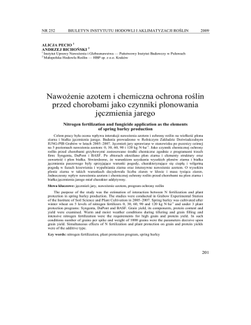 NR 252 BIULETYN INSTYTUTU HODOWLI I AKLIMATYZACJI ROŚLIN 2009 ALICJA PECIO 1 ANDRZEJ BICHOŃSKI 2 1 2 Instytut Uprawy Nawożenia i Gleboznawstwa — Państwowy Instytut Badawczy w Puławach Małopolska Hodowla Roślin — HBP sp. z o.o. Kraków Nawożenie azotem i chemiczna ochrona roślin przed chorobami jako czynniki plonowania jęczmienia jarego Nitrogen fertilization and fungicide application as the elements of spring barley production Celem pracy była ocena wpływu interakcji nawożenia azotem i ochrony roślin na wielkość plonu ziarna i białka jęczmienia jarego. Badania prowadzono w Rolniczym Zakładzie Doświadczalnym IUNG-PIB Grabów w latach 2005–2007. Jęczmień jary uprawiano w stanowisku po pszenicy ozimej na 5 poziomach nawożenia azotem: 0, 30, 60, 90 i 120 kg N·ha-1. Jako czynnik chemicznej ochrony roślin przed chorobami grzybowymi zastosowano środki chemiczne zgodnie z programami trzech firm: Syngenta, DuPont i BASF. Po zbiorach określano plon ziarna i elementy struktury oraz zawartość i plon białka. Stwierdzono, że warunkiem uzyskania wysokich plonów ziarna i białka jęczmienia paszowego były sprzyjające warunki pogody, charakteryzujące się ciepłą i wilgotną pogodą w fazach krzewienia i wypełniania ziarna oraz intensywne nawożenie azotem. O wysokim plonie ziarna w takich warunkach decydowała liczba ziaren w kłosie i masa tysiąca ziaren. Jednoczesny wpływ nawożenia azotem i chemicznej ochrony roślin przed chorobami na plon ziarna i białka jęczmienia jarego miał charakter addytywny. Słowa kluczowe: jęczmień jary, nawożenie azotem, program ochrony roślin The purpose of the study was the estimation of interaction between N fertilization and plant protection in spring barley production. The studies were conducted in Grabow Experimental Station of the Institute of Soil Science and Plant Cultivation in 2005–2007. Spring barley was cultivated after winter wheat on 5 levels of nitrogen fertilizers 0, 30, 60, 90 and 120 kg N·ha-1 and under 3 plant protection programs: Syngenta, DuPont and BASF. Grain yield, its components, protein content and yield were examined. Warm and moist weather conditions during tillering and grain filling and intensive nitrogen fertilization were the requirements for high grain and protein yield. In such conditions number of grains per spike and weight of 1000 grains were the parameters decisive upon grain yield. Simultaneous effects of N fertilization and plant protection on grain and protein yields were of the additive type. Key words: nitrogen fertilization, plant protection program, spring barley 201 Alicja Pecio ... WSTĘP Warunkiem uzyskania dużego plonu jęczmienia jest właściwy dobór czynników wpływających z jednej strony na formowanie składowych plonu ziarna, a z drugiej strony na ich ochronę. Azot jest jednym z najważniejszych czynników kontrolujących wzrost i rozwój, a zatem i końcowy plon ziarna jęczmienia (Noworolnik, 2003). Roślina ta jest jednak atakowana przez wiele patogenów powodujących choroby grzybowe (Fiedorow i in., 2008), powinna być zatem skutecznie chroniona przed stratami potencjalnego plonu (Kaniuczak, 2001). Środki ochrony roślin działają najczęściej zapobiegawczo i proponowane są przez producentów w formie tzw. programów (Dąbrowski, 2001). Zgodnie z panującą powszechnie opinią nawożenie azotem zwiększa podatność roślin na choroby grzybowe (Noworolnik, 2003). Można się zatem spodziewać interakcji pomiędzy dawką nawożenia azotem i sposobem chemicznej ochrony roślin. Plon ziarna jęczmienia powinien także spełniać wymagania jakościowe, aby zapewnić wysoki plon białka. Jakość ziarna, co prawda uwarunkowana genetycznie (Przulj i Momcilovic, 2001 b), nawet w większym stopniu niż wielkość plonu ziarna zależy od wielu czynników zewnętrznych, szczególnie od przebiegu warunków pogody (Bertholdsson, 1998, 1999) i nawożenia azotem (Petterson i Eckersten, 2007). Celem badań była ocena wpływu interakcji nawożenia azotem i ochrony przed chorobami grzybowymi na wielkość plonu ziarna i białka jęczmienia jarego. MATERIAŁ I METODY W opracowaniu przedstawiono wyniki badań prowadzonych w latach 2005–2007 w Rolniczym Zakładzie Doświadczalnym IUNG-PIB Grabów. Przedmiotem badań był jęczmień jary odm. Antek (2005 i 2006) oraz Justina (2007) uprawiany w stanowisku po pszenicy ozimej. Pierwszy czynnik doświadczalny stanowiła dawka nawożenia azotem: 0, 30, 60, 90 i 120 kg N·ha-1 (tab. 1). Tabela 1 Dawki i terminy nawożenia azotem Nitrogen fertilization doses and times Całkowita dawka azotu Total N dose (kg N·ha-1) 0 30 60 90 120 2005 35 2006 10 0 30 30 60 60 Rok i liczba dni po siewie Year and days after sowing 2007 2005 25 50 2006 38 0 0 30 30 60 2007 51 Nawożenie w dawkach 30 i 60 kg N·ha-1 stosowano w fazie krzewienia, a w dawkach większych: 60 kg N·ha-1w fazie krzewienia i 30 lub 60 kg N·ha-1 w fazie strzelania w źdźbło. Jako czynnik chemicznej ochrony roślin przed chorobami zastosowano środki chemiczne zgodnie z programami trzech firm: Syngenta, DuPont i BASF (tab. 2). Na 202 Alicja Pecio ... obiekcie kontrolnym nie stosowano środków chemicznej ochrony roślin przed chorobami. Doświadczenie założono w układzie split-plot w czterech powtórzeniach. Zlokalizowano je na glebie kompleksu żytniego b. dobrego o odczynie pHKCl = 5,7. Powierzchnia poletek do zbioru wynosiła 28,8 m2. Zbiór wykonano w fazie dojrzałości pełnej ziarna. Oznaczono plon ziarna i liczbę kłosów na powierzchni 1 m2 oraz masę 1000 ziaren i liczbę ziaren w kłosie. Po zbiorze określono procentową zawartość białka ogółem w pełnym ziarnie metodą NIR w aparacie Inframatic 9100 firmy Perten oraz plon białka z jednostki powierzchni. Tabela 2 Badane programy fungicydowej ochrony jęczmienia jarego The programs of fungicide protection of spring barley Program ochrony Program Stosowane fungicydy Fungicide DuPont BASF Syngenta 