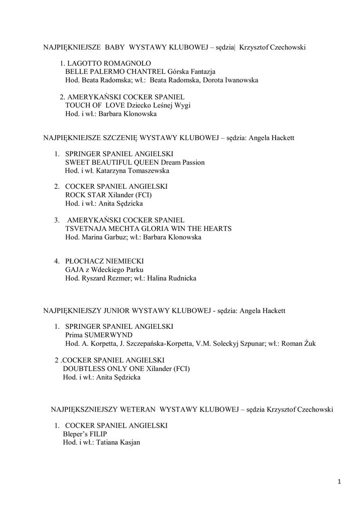 NAJPIĘKNIEJSZE BABY WYSTAWY KLUBOWEJ – sędzia| Krzysztof Czechowski 1. LAGOTTO ROMAGNOLO BELLE PALERMO CHANTREL Górska Fantazja Hod. Beata Radomska; wł.: Beata Radomska, Dorota Iwanowska 2. AMERYKAŃSKI COCKER SPANIEL TOUCH OF LOVE Dziecko Leśnej Wygi Hod. i wł.: Barbara Klonowska NAJPIĘKNIEJSZE SZCZENIĘ WYSTAWY KLUBOWEJ – sędzia: Angela Hackett 1. SPRINGER SPANIEL ANGIELSKI SWEET BEAUTIFUL QUEEN Dream Passion Hod. i wł. Katarzyna Tomaszewska 2. COCKER SPANIEL ANGIELSKI ROCK STAR Xilander (FCI) Hod. i wł.: Anita Sędzicka 3. AMERYKAŃSKI COCKER SPANIEL TSVETNAJA MECHTA GLORIA WIN THE HEARTS Hod. Marina Garbuz; wł.: Barbara Klonowska 4. PŁOCHACZ NIEMIECKI GAJA z Wdeckiego Parku Hod. Ryszard Rezmer; wł.: Halina Rudnicka NAJPIĘKNIEJSZY JUNIOR WYSTAWY KLUBOWEJ - sędzia: Angela Hackett 1. SPRINGER SPANIEL ANGIELSKI Prima SUMERWYND Hod. A. Korpetta, J. Szczepańska-Korpetta, V.M. Soleckyj Szpunar; wł.: Roman Żuk 2 .COCKER SPANIEL ANGIELSKI DOUBTLESS ONLY ONE Xilander (FCI) Hod. i wł.: Anita Sędzicka NAJPIĘKSZNIEJSZY WETERAN WYSTAWY KLUBOWEJ – sędzia Krzysztof Czechowski 1. COCKER SPANIEL ANGIELSKI Bleper’s FILIP Hod. i wł.: Tatiana Kasjan 1 2. SPRINGER SPANIEL ANGIELSKI Spartakas Bingo Tema Hod. Aurelija Tunkuliene; wł.: Maria Tyszewska NAJPIĘKNIEJSZY PIES UŻYTKOWY WYSTAWY KLUBOWEJ sędzia: Krzysztof Czechowski 1. SPRINGER SPANIEL ANGIELSKI NIGHT PRINCE Avendesora Poland (FCI) Hod. i wł.: Justyna Kamińska 2. COCKER SPANIEL ANGIELSKI BLEPER’S PRIME MINISTER Hod. Tatiana Kasjan; wł.: Monika Makowska-Lasoń 3. PŁOCHACZ NIEMIECKI CEDRA z Turzyńskich Stawów Hod. Krzysztof Połczyński; wł.: Zbigniew Onsorge KLUBOWY ZWYCIĘZCA ROKU 1. SPRINGER SPANIEL WALIJSKI MARIUSZ S. Umbra Amabilis Hod. Dorota Janczewska; wł.: Jagoda Samsel 2 SPRINGER SPANIEL ANGIELSKI NIGHT PRINCE Avendesora Poland (FCI) Hod. i wł.: Justyna Kamińska 3. COCKER SPANIEL ANGIELSKI BLEPER’S PRIME MINISTER Hod. Tatiana Kasjan; wł.: Monika Makowska-Lasoń 4 CLUMBER SPANIEL TOTIS VIRBUS KAPRYS REJENTA Hod. Piotr Tram; wł.: Anna Stankiewicz 2 KONKURENCJE HODOWLANE NAJLEPSZA PARA HODOWLANA - sędzia: Angela Hackett SPRINGER SPANIEL ANGIELSKI: GOLD PRINCE TIAMANT Avendesora Poland (FCI) wł. Kamińska Justyna, Anna Woźniakowska GORDIUS GENUINE GOLD TIAMANT Avendesora Poland (FCI) wł. . Kamińska Justyna, Monika Malitka NAJLEPSZY REPRODUKTOR- sędzia: Krzysztof Czechowski COCKER SPANIEL ANGIELSKI DOUBTLESS CONFIDE IN ME wł. Anita Sędzicka NAJLEPSZA GRUPA HODOWLANA - sędzia: Angela Hackett 1. COCKER SPANIEL ANGIELSKI Hodowla BLEPER’S (FCI) wł. Tatiana Kasjan 2. SPRINGER SPANIEL ANGIELSKI Hodowla: AVENDESORA POLAND (FCI) wł. Justyna Kamińska 3.COCKER SPANIEL ANGIELSKI Hodowla: PERFEKT PARTNER wł. Katarzyna Piechocka 4. COCKER SPANIEL ANGIELSKI Hodowla XILANDER (FCI) wł. Anita Sędzicka 3