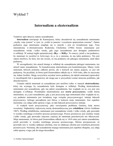 Wykład 7 Internalizm a eksternalizm Tytułowy spór dotyczy natury uzasadniania. Internalizm nawiązuje do Kartezjusza, który doszukiwał się uzasadnienia mniemania „myślę, więc jestem” w tym, że „widzi to jasnym i wyraźnym spojrzeniem rozumu”. Zatem podstawa jego mniemania znajduje się w umyśle i jest on świadomym tego. Teza internalizmu w sformułowaniu Rodericka Chisholma (1966) brzmi: mniemanie jest uzasadnione wtedy i tylko wtedy, gdy jego uzasadnienie jest dostępne podmiotowi w refleksji. W notacji logiki epistemicznej: JBap → BJBap. To znaczy: jeżeli a ma podstawy, by mniemać (is justified in believing), że p, to a mniema, że ma takie podstawy. Nie jest zatem możliwe, by ktoś, kto nie uważa, że ma podstawy do jakiegoś mniemania, miał takie podstawy. W szczególności, kto utracił dostęp w refleksji do uzasadnienia jakiegoś mniemania, ten utracił samo uzasadnienie. Ta konsekwencja internalizmu jest kontrintuicyjna. Mamy wiele mniemań, których jesteśmy całkiem pewni, ale o których nie mamy pojęcia, co jest ich podstawą. Na przykład, że bitwa pod Grunwaldem odbyła się w 1410 roku, albo że nazywam się Adam Grobler. Mogę oczywiście uzyskać nowe podstawy do takich mniemań (sprawdzić w encyklopedii lub w paszporcie), ale mogą one w przyszłości zostać utracone podobnie, jak dotychczasowe. Uznanie takich mniemań za uzasadnione jest możliwe tylko w ramach eksternalizmu, który nie wymaga, by uzasadnienie było dostępne w refleksji. Według eksternalizmu mniemanie jest uzasadnione, gdy ma jakieś uzasadnienie, bez względu na to, czy jest ono dostępne w refleksji. Przykładem eksternalizmu jest teoria przyczynowa, wedle której mniemanie, że p jest uzasadnione, gdy p jest przyczyną tego mniemania (bez względu na to, czy podmiot mniemania jest świadomy tego związku przyczynowego). istnieje łańcuch przyczynowy, którego początkiem jest bitwa, a końcem moje mniemanie. Jest zupełnie nieistotne, czy zdaję sobie sprawę z tego, że taki łańcuch przyczynowy istnieje. O wadach teorii przyczynowej, jako rozwiązaniu problemu Gettiera, była mowa wcześniej. Najbardziej wpływową teorią eksternalistyczną jest reliabilizm (Alvin Goldman 1967). Według reliabilizmu, mniemanie jest uzasadnione wtedy i tylko wtedy, gdy powstało w wyniku rzetelnego (reliable) procesu poznawczego. Proces poznawczy jest rzetelny wtedy i tylko wtedy, gdy prowadzi znacznie częściej do mniemań prawdziwych niż fałszywych. Moje mniemanie, że bitwa pod Grunwaldem odbyła się w 1410 roku jest zatem uzasadnione, jeżeli powstało w wyniku rzetelnego procesu poznawczego. Można przypuszczać, że powstało ono w wyniku edukacji szkolnej, oraz że edukacja szkolna jest rzetelnym procesem poznawczym. Niemniej, dla uzasadnienia mojego mniemania jest zupełnie obojętne, czy zdaję sobie sprawę z tego, jak do niego doszedłem. A. Grobler, Epistemologia5 1/3 Prócz eksternalizmu w sprawie uzasadniania istnieje eksternalizm w sprawie wiedzy. Na przykład według reliabilizmu w sprawie wiedzy, w ujęciu Freda Dretzky’ego, mniemanie jest składnikiem wiedzy wtedy i tylko wtedy, gdy powstało w wyniku rzetelnego procesu poznawczego. Eksternalizm w sprawie wiedzy nie stawia zatem wymagania, by wiedza była uzasadniona. Różnica między tymi dwiema formami eksternalizmu może wydawać się nieistotna, bowiem każde mniemanie będące składnikiem wiedzy jest uzasadnione wedle eksternalizmu w sprawie uzasadnienia. Atrakcją eksternalizmu w sprawie wiedzy jest, że uwzględnia on możliwość posiadania wiedzy przez zwierzęta, unikając przypisywania zwierzętom uzasadnionych mniemań. Eksternalizmowi trudność sprawia przykład jasnowidzenia. Przypuśćmy, że istnieje wyrocznia, która trafnie odpowiada na każde pytanie. Zatem proces poznawczy polegający na zapytywaniu wyroczni jest rzetelny. Jednak ani sama wyrocznia, ani nikt inny, nie wie, ani nawet nie domyśla się, na jakiej zasadzie wyrocznia udziela trafnych odpowiedzi: czy ma jakieś (niekoniecznie dostępne jej w refleksji) podstawy, czy ślepym trafem odgaduje. Trudno zatem uznać jej odpowiedzi za uzasadnione mniemania lub składniki wiedzy, ponieważ nie da się odróżnić jej odpowiedzi od ślepych domysłów. Wobec zalet i wad przeciwstawnych stanowisk powstają stanowiska pośrednie. Jednym z najbardziej wpływowych jest epistemologia cnót (virtue epistemology). Nawiązuje ona do Arystotelesa pojęcia cnoty, rozszerzając je na cnoty epistemiczne, takie jak bystrość wzroku, czy generalnie czułość zmysłów, biegłość rozumowania (sprawność logiczna), zdolność kojarzenia itp. To uogólnienie pojęcia cnoty ma swoje źródło w deontologicznej (gr. deon = obowiązek) koncepcji uzasadniania, wedle której unikanie bezpodstawnych mniemań jest obowiązkiem moralnym podmiotu. Koncepcję deontologiczną zakładał na przykład Kartezjusz, który uważał, że źródłem błędu poznawczego jest niedostatek woli (w starannym stosowaniu metody). Ślad koncepcji deontologicznej występuje również w źródłosłowie angielskiego terminu justification (uzasadnienie): just = sprawiedliwy (od łac. iustus). Wedle epistemologii cnót, w sformułowaniu Lindy Zagrzebski (1996), mniemanie jest uzasadnione wtedy i tylko wtedy, gdy powstało w wyniku pielęgnowania (exercising) cnót poznawczych. Trudnością temu stanowisku (podobnie jak eksternalizmowi) sprawia przykład demona-zwodziciela lub jego współczesnej wersji mózgów na pożywce (wypreparowanych przez szalonego uczonego, który podłączył je do aparatury komputerowej drażniącej odpowiednie rejony mózgów, aby wywoływać w nich złudne wrażenia, równie sugestywne jak wrażenia odbierane w rzeczywistości). W świecie we władzy demona-zwodziciela lub szalonego uczonego podmiot poznający miałby wyłącznie mniemania fałszywe, a zatem nie byłby zdolny do posiadania wiedzy, nawet gdyby pielęgnował cnoty poznawcze. In