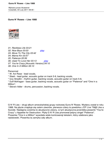 Guns N’ Roses – Lies 1988 Wpisany przez bluesever Czwartek, 03 Luty 2011 09:40 - Guns N’ Roses – Lies 1988 01. Reckless Life 03:21 02. Nice Boys 03:03 play 03. Move To The City 03:42 04. Mama Kin 03:57 05. Patience 05:56 06. Used To Love Her 03:13 play 07. You're Crazy [Acoustic Version] 04:10 08. One In A Million 06:10 Personnel * W. Axl Rose - lead vocals, * Slash - lead guitar, acoustic guitar on track 5-8, backing vocals, * Izzy Stradlin - rhythm guitar, backing vocals, acoustic guitar on track 5-8, * Duff McKagan - bass guitar, backing vocals, acoustic guitar on "Patience" and "One in a Million", * Steven Adler - drums, percussion, backing vocals. G N' R Lies – drugi album amerykańskiej grupy rockowej Guns N' Roses. Wydany został w roku 1988. Na płycie znajduje się osiem utworów, pierwsze cztery to powtórka z EP Live ?!8@ Like a Suicide. Następna czwórka to akustyczne utwory, w tym akustyczna przeróbka piosenki "You're Crazy" z Appetite for Destruction. Płytę G N' R Lies promował jedyny singel "Patience". Piosenka "One in a Million" wywołała wiele kontrowersji tekstem, który odebrano jako rasistowski. Piosenka ta zamyka cały album. 1/2 Guns N’ Roses – Lies 1988 Wpisany przez bluesever Czwartek, 03 Luty 2011 09:40 - G N' R Lies, also known as Lies, is the second album by the band Guns N' Roses, released in 1988. According to the RIAA, the EP has sold over five million copies only in the United States. It was nominated for a grammy. The first four tracks consist of the previously released EP Live ?!*@ Like a Suicide. The last four songs were recorded with acoustic guitars. They were written and recorded in only a few studio sessions (with the exception of "You're Crazy," which appeared in an alternate version on Appetite for Destruction), which producer Mike Clink called "one of those magical rock and roll history moments." In later interviews, Axl Rose stated that while he loved how the band sounded on the last four songs, he hated the sound of his voice. Rose recalled that his voice was husky and scratchy from the band's lengthy touring at the time, and if he could he would have re-recorded his vocal tracks in a separate session. "You're Crazy" had been released previously on the band's debut album, Appetite for Destruction and was now recorded as originally intended. "Mama Kin" is an Aerosmith song, which originally appeared on the band's 1973 debut album. "Nice Boys" is a Rose Tattoo cover from their 1980 album Rose Tattoo. "Used to Love Her" was written as a joke after Izzy Stradlin' disliked a song he heard on the radio featuring "some guy whining about a broad who was treating him bad". Slash stated that "People think it's about one of our old girlfriends, but it's actually about Axl's dog." "Patience" was written by Stradlin. download back 2/2