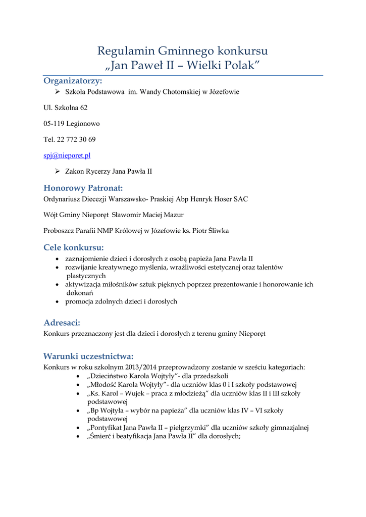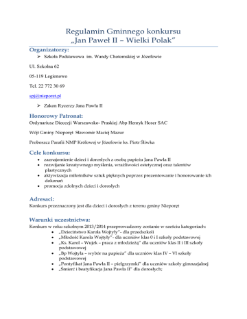 Regulamin Gminnego konkursu „Jan Paweł II – Wielki Polak” Organizatorzy: Szkoła Podstawowa im. Wandy Chotomskiej w Józefowie Ul. Szkolna 62 05-119 Legionowo Tel. 22 772 30 69 [email protected] Zakon Rycerzy Jana Pawła II Honorowy Patronat: Ordynariusz Diecezji Warszawsko- Praskiej Abp Henryk Hoser SAC Wójt Gminy Nieporęt Sławomir Maciej Mazur Proboszcz Parafii NMP Królowej w Józefowie ks. Piotr Śliwka Cele konkursu: zaznajomienie dzieci i dorosłych z osobą papieża Jana Pawła II rozwijanie kreatywnego myślenia, wrażliwości estetycznej oraz talentów plastycznych aktywizacja miłośników sztuk pięknych poprzez prezentowanie i honorowanie ich dokonań promocja zdolnych dzieci i dorosłych Adresaci: Konkurs przeznaczony jest dla dzieci i dorosłych z terenu gminy Nieporęt Warunki uczestnictwa: Konkurs w roku szkolnym 2013/2014 przeprowadzony zostanie w sześciu kategoriach: „Dzieciństwo Karola Wojtyły”- dla przedszkoli „Młodość Karola Wojtyły”- dla uczniów klas 0 i I szkoły podstawowej „Ks. Karol – Wujek – praca z młodzieżą” dla uczniów klas II i III szkoły podstawowej „Bp Wojtyła – wybór na papieża” dla uczniów klas IV – VI szkoły podstawowej „Pontyfikat Jana Pawła II – pielgrzymki” dla uczniów szkoły gimnazjalnej „Śmierć i beatyfikacja Jana Pawła II” dla dorosłych; Forma pracy: Tematem konkursu jest interpretacja w formie plastycznej, wskazanego okresu życia Karola Wojtyły. Prace należy wykonać samodzielnie, w dowolnej technice plastycznej płaskiej na formacie A3 lub A4 (kredka, ołówek, malarstwo, mozaika, witraż, rysunek, grafika, wyklejanka, wydzieranka, kolaż itp.) lub przestrzennej. Na odwrocie każdej pracy należy przykleić wypełnioną kartę zgłoszenia podaną poniżej. Prace należy złożyć w Szkole Podstawowej w Józefowie do 28 marca 2014 r. Prace oceniać będzie komisja powołana przez organizatorów Ogłoszenie listy zwycięzców nastąpi 7 kwietnia 2014 r. Uroczyste wręczenie nagród nastąpi 15 kwietnia 2014 r. w Gimnazjum w Stanisławowie Pierwszym podczas obchodów Dnia Papieskiego godzina 18.00. UWAGA!!! Prace konkursowe nie podlegają zwrotowi. Prawa autorskie przechodzą na organizatora. Uczestnicy konkursu wyrażają zgodę na nieodpłatne promowanie ich prac przez organizatora konkursu oraz podanie ich danych osobowych do publicznej wiadomości. karta zgłoszenia (naklejamy na pracę) Imię……………………………………………………… Nazwisko………………………………………………… Uczeń Telefon kontaktowy……………………………………… Klasa Szkoła- telefon, adres Tytuł pracy