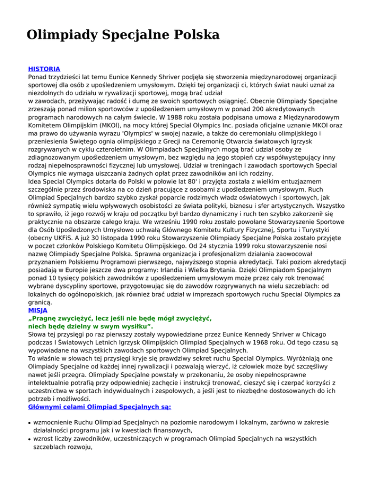 Olimpiady Specjalne Polska HISTORIA Ponad trzydzieści lat temu Eunice Kennedy Shriver podjęła się stworzenia międzynarodowej organizacji sportowej dla osób z upośledzeniem umysłowym. Dzięki tej organizacji ci, których świat nauki uznał za niezdolnych do udziału w rywalizacji sportowej, mogą brać udział w zawodach, przeżywając radość i dumę ze swoich sportowych osiągnięć. Obecnie Olimpiady Specjalne zrzeszają ponad milion sportowców z upośledzeniem umysłowym w ponad 200 akredytowanych programach narodowych na całym świecie. W 1988 roku została podpisana umowa z Międzynarodowym Komitetem Olimpijskim (MKOl), na mocy której Special Olympics Inc. posiada oficjalne uznanie MKOl oraz ma prawo do używania wyrazu 'Olympics' w swojej nazwie, a także do ceremoniału olimpijskiego i przeniesienia Świętego ognia olimpijskiego z Grecji na Ceremonię Otwarcia światowych Igrzysk rozgrywanych w cyklu czteroletnim. W Olimpiadach Specjalnych mogą brać udział osoby ze zdiagnozowanym upośledzeniem umysłowym, bez względu na jego stopień czy współwystępujący inny rodzaj niepełnosprawności fizycznej lub umysłowej. Udział w treningach i zawodach sportowych Special Olympics nie wymaga uiszczania żadnych opłat przez zawodników ani ich rodziny. Idea Special Olympics dotarła do Polski w połowie lat 80' i przyjęta została z wielkim entuzjazmem szczególnie przez środowiska na co dzień pracujące z osobami z upośledzeniem umysłowym. Ruch Olimpiad Specjalnych bardzo szybko zyskał poparcie rodzimych władz oświatowych i sportowych, jak również sympatię wielu wpływowych osobistości ze świata polityki, biznesu i sfer artystycznych. Wszystko to sprawiło, iż jego rozwój w kraju od początku był bardzo dynamiczny i ruch ten szybko zakorzenił się praktycznie na obszarze całego kraju. We wrześniu 1990 roku zostało powołane Stowarzyszenie Sportowe dla Osób Upośledzonych Umysłowo uchwałą Głównego Komitetu Kultury Fizycznej, Sportu i Turystyki (obecny UKFiS. A już 30 listopada 1990 roku Stowarzyszenie Olimpiady Specjalne Polska zostało przyjęte w poczet członków Polskiego Komitetu Olimpijskiego. Od 24 stycznia 1999 roku stowarzyszenie nosi nazwę Olimpiady Specjalne Polska. Sprawna organizacja i profesjonalizm działania zaowocował przyznaniem Polskiemu Programowi pierwszego, najwyższego stopnia akredytacji. Taki poziom akredytacji posiadają w Europie jeszcze dwa programy: Irlandia i Wielka Brytania. Dzięki Olimpiadom Specjalnym ponad 10 tysięcy polskich zawodników z upośledzeniem umysłowym może przez cały rok trenować wybrane dyscypliny sportowe, przygotowując się do zawodów rozgrywanych na wielu szczeblach: od lokalnych do ogólnopolskich, jak również brać udział w imprezach sportowych ruchu Special Olympics za granicą. MISJA „Pragnę zwyciężyć, lecz jeśli nie będę mógł zwyciężyć, niech będę dzielny w swym wysiłku”. Słowa tej przysięgi po raz pierwszy zostały wypowiedziane przez Eunice Kennedy Shriver w Chicago podczas I Światowych Letnich Igrzysk Olimpijskich Olimpiad Specjalnych w 1968 roku. Od tego czasu są wypowiadane na wszystkich zawodach sportowych Olimpiad Specjalnych. To właśnie w słowach tej przysięgi kryje się prawdziwy sekret ruchu Special Olympics. Wyróżniają one Olimpiady Specjalne od każdej innej rywalizacji i pozwalają wierzyć, iż człowiek może być szczęśliwy nawet jeśli przegra. Olimpiady Specjalne powstały w przekonaniu, że osoby niepełnosprawne intelektualnie potrafią przy odpowiedniej zachęcie i instrukcji trenować, cieszyć się i czerpać korzyści z uczestnictwa w sportach indywidualnych i zespołowych, a jeśli jest to niezbędne dostosowanych do ich potrzeb i możliwości. Głównymi celami Olimpiad Specjalnych są: ● ● wzmocnienie Ruchu Olimpiad Specjalnych na poziomie narodowym i lokalnym, zarówno w zakresie działalności programu jak i w kwestiach finansowych, wzrost liczby zawodników, uczestniczących w programach Olimpiad Specjalnych na wszystkich szczeblach rozwoju, ● ● ● ● ● podnoszenie kwalifikacji trenerów poprzez poprawę jakości materiałów szkoleniowych oraz ustalenie systemu szkoleń, oferowanie wielu możliwości szkoleniowych dla zawodników poprzez różnorodne formy tj. sekcje, obozy i inne, podnoszenie jakości zawodów w ramach programów narodowych na szczeblu lokalnym i regionalnym, popularyzacja sportów zunifikowanych, jako nowych możliwości uczestnictwa i współzawodnictwa dla osób z niepełnosprawnością intelektualną, popularyzacja Programu Treningu Aktywności Motorycznej (MATP) jako możliwości uczestnictwa w ruchu Olimpiad Specjalnych osób z najgłębszym stopniem niepełnosprawności intelektualnej oraz ze sprzężonymi uszkodzeniami aparatu ruchu. Głównymi celami zawodów Olimpiad Specjalnych są: ● ● ● ● ● zapewnienie osobom z niepełnosprawnością intelektualną możliwości uczestnictwa we współzawodnictwie sportowym, tworzenie atmosfery olimpijskiej podczas zawodów, zwiększanie świadomości społecznej i wiedzy o możliwościach osób z niepełnosprawnością intelektualną, zapewnienie rodzicom i członkom rodzin osób z niepełnosprawnością intelektualną przeżycia radości i dumy z uczestnictwa ich podopiecznych w zawodach sportowych, poszerzenie wiedzy trenerów i zawodników na temat zakresu konkurencji i dyscyplin sportowych w Olimpiadach Specjalnych. STATYSTYKI NA ŚWIECIE ● ● ● ● ● 1 738 385 sportowców z niepełnosprawnością intelektualną 200 akredytowanych programów w ponad 160 krajach, 358 363 zawodników Olimpiad Specjalnych w Europie, 20 000 zawodów sportowych rocznie, 26 dyscyplin zimowych i letnich. STATYSTYKI W POLSCE: ● ● ● ● 18 Oddziałów Regionalnych Olimpiad Specjalnych, 13.546 zawodników z niepełnosprawnością intelektualną, 561 Sekcji Olimpiad Specjalnych, Około 200 zawodów sportowych rangi ogólnopolskiej i regi