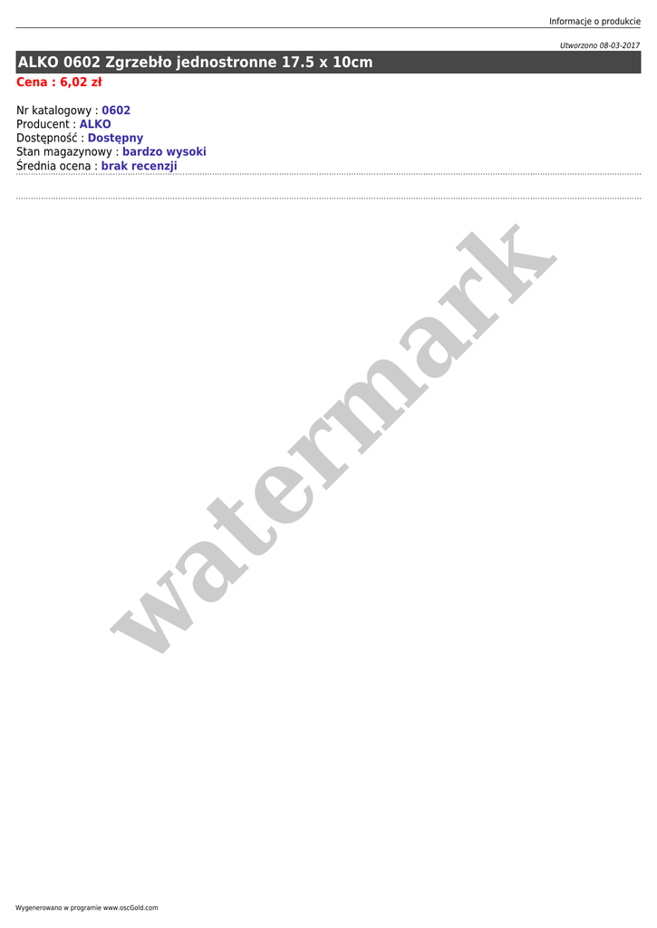 Informacje o produkcie Utworzono 08-03-2017 ALKO 0602 Zgrzebło jednostronne 17.5 x 10cm Cena : 6,02 zł w at er m ar k Nr katalogowy : 0602 Producent : ALKO Dostępność : Dostępny Stan magazynowy : bardzo wysoki Średnia ocena : brak recenzji Wygenerowano w programie www.oscGold.com