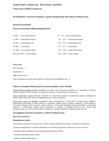 Zespół Szkół w Kołobrzegu Rok szkolny 2015/2016 Nauczyciel: Emilia Lemańczyk Przedmiotowy System Oceniania z języka niemieckiego dla Szkoły Podstawowej: Kryteria oceniania: Oceny są wystawiane według następującej skali: 0-30% - ocena niedostateczna 0 – 1,74 = ocena niedostateczna 31-49% - ocena dopuszczająca 1,75 – 2,74 = ocena dopuszczająca 50-74% - ocena dostateczna 2,75 – 3,74 = ocena dostateczna 75-90% - ocena dobra 3,75 – 4,74 = ocena dobra 91-100% - ocena bardzo dobra 4,75 – 5,49 = ocena bardzo dobra Powyżej 100% - ocena celująca 5,50 – 6,00 = ocena celująca Waga ocen: Praca klasowa - 5 Kartkówka - 3 Odpowiedź ustna - 2 Aktywność/praca na lekcji, praca domowa, ocena za pracę dodatkową, itp. - 1 Zakres wymagań edukacyjnych na poszczególne oceny szkolne: Ocena bieżąca postępów ucznia uwzględnia wszystkie cztery sprawności językowe, tj.: rozumienie ze słuchu, pisanie, czytanie, mówienie oraz tzw. podsystemy języka, czyli gramatykę i słownictwo. Oceny śródroczna i roczna obejmują wszystkie ww. sprawności językowe i podsystemy języka, wymagane na danym etapie nauczania, a także uwzględniają pracę ucznia na lekcjach. Ocena pracy ucznia na lekcjach uwzględnia: pracę indywidualną, tj. aktywność na lekcji, pracę zgodną z poleceniami nauczyciela, wysiłek włożony w wykonanie zadania, pracę w parach i grupach, tj. równy udział w ćwiczeniu każdego ucznia, używanie języka obcego w ćwiczonych dialogach, pomoc koleżeńską w przypadku trudności z wykonaniem zadania, pracę projektową w grupach, tj. produkt końcowy, jak i proces jego przygotowania, np. wykorzystanie źródeł, współpracę w grupie, podział ról, rozplanowanie czasu itp. Szczegółowe kryteria oceniania w Szkole Podstawowej: Sprawności językowe: Rozumienie ze słuchu: W rozwijaniu tej sprawności językowej w klasie 4 szkoły podstawowej kładzie się nacisk na kształcenie u uczniów umiejętności rozumienia globalnego oraz selektywnego tekstu. Sprawność ta jest ćwiczona za pomocą zadań zamkniętych oraz półotwartych, do których należy: • określanie głównego tematu tekstu • zadania wielokrotnego wyboru • zakreślanie właściwej informacji przedstawionej w różnej formie • uzupełnianie luk w zdaniach lub w tekście na podstawie wysłuchanych informacji • przyporządkowanie ilustracji/zdjęć/imion/schematów do wysłuchanych informacji • ustalanie kolejności słyszanych informacji • przyporządkowywanie schematów wypowiedzi/dialogów do wysłuchanych tekstów • uzupełnianie tabeli na podstawie wysłuchanego tekstu • przedstawianie dialogów na podstawie wysłuchanych przykładów • poprawianie informacji na podstawie wysłuchanych tekstów. KRYTERIA OCENY ROZUMIENIA ZE SŁUCHU Ocena celująca Uczeń: • spełnia wszystkie kryteria przewidziane na ocenę bardzo dobrą • bez większego trudu rozumie wypowiedzi w języku niemieckim na podstawie kontekstu sytuacyjnego oraz związków przyczynowo-skutkowych, nawet jeśli zawarte są w nich nowe struktury leksykalno - gramatyczne. Ocena bardzo dobra Uczeń: • bez trudu rozumie wypowiedzi w języku niemieckim, formułowane przez różne osoby i zawierające znane mu słownictwo oraz struktury gramatyczne • rozumie sens sytuacji komunikacyjnych oraz prawidłowo na nie reaguje • sprawnie wyszukuje informacje ogólne i szczegółowe w wypowiedziach, dialogach, komunikatach • w pełni rozumie instrukcje nauczyciela formułowane w języku niemieckim i prawidłowo na nie reaguje. Ocena dobra Uczeń: • w znacznym stopniu rozumie wypowiedzi w języku niemieckim formułowane przez różne osoby i zawierające znane mu słownictwo oraz struktury gramatyczne • rozumie sens większości sytuacji komunikacyjnych oraz prawidłowo na nie reaguje • sprawnie wyszukuje informacje ogólne i szczegółowe w wypowiedziach, dialogach, komunikatach • rozumie instrukcje nauczyciela formułowane w języku niemieckim i prawidłowo na nie reaguje. Ocena dostateczna Uczeń: • rozumie dużą część prostych wypowiedzi w języku niemieckim formułowanych przez różne osoby i zawierających znane mu słownictwo oraz struktury gramatyczne • rozumie ogólny sens większości sytuacji komunikacyjnych oraz przeważnie prawidłowo na nie reaguje • wyszukuje większość szczegółowych informacji w nieskomplikowanych wypowiedziach, dialogach, komunikatach • rozumie większą część prostych instrukcji nauczyciela, formułowanych w języku niemieckim i zazwyczaj prawidłowo na nie reaguje. Ocena dopuszczająca Uczeń: • rozumie niewielką część wypowiedzi w języku niemieckim, zawierających słownictwo i struktury gramatyczne ujęte w programie nauczania • rozumie ogólny sens tylko niektórych sytuacji komunikacyjnych oraz często reaguje na nie nieprawidłowo • wyszukuje jedynie niektóre informacje szczegółowe w nieskomplikowanych wypowiedziach, dialogach, komunikatach • rozumie niektóre proste instrukcje i polecenia nauczyciela formułowane w języku niemieckim oraz nie zawsze prawidłowo na nie reaguje. Ocena niedostateczna Uczeń : • nie rozumie najprostszych wypowiedzi w języku niemieckim • rozumie ogólny sens bardzo nielicznych sytuacji komunikacyjnych lub nie rozumie ich wcale; ma problem z prawidłowym reagowaniem na nie lub nie reaguje wcale • nie potrafi wyszukać szczegółowych informacji w nieskomplikowanych wypowiedziach, dialogach, komunikatach • nie rozumie prostych instrukcji i poleceń nauczyciela formułowanych w języku niemieckim. Mówienie: Podczas lekcji języka niemieckiego sprawność ta jest rozwijana w ramach następujących obszarów: • udzielanie i uzyskiwanie informacji dotyczących sytuacji przewidzianych w programie nauczania • inicjowanie, podtrzymywanie i kończenie rozmowy w typowych sytuacjach komunikacyjnych • opowiadanie o osobach, wydarzeniach dotyczących sytuacji przewidzianych w programie nauczania