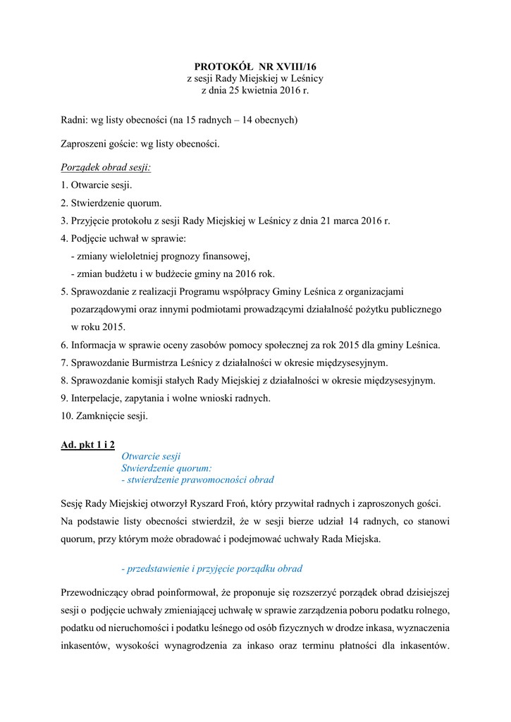 PROTOKÓŁ NR XVIII/16 z sesji Rady Miejskiej w Leśnicy z
