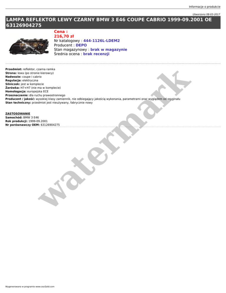 Informacje o produkcie Utworzono 08-03-2017 LAMPA REFLEKTOR LEWY CZARNY BMW 3 E46 COUPE CABRIO 1999-09.2001 OE 63126904275 Cena : 216,70 zł Nr katalogowy : 444-1126L-LDEM2 Producent : DEPO Stan magazynowy : brak w magazynie Średnia ocena : brak recenzji w at ZASTOSOWANIE Samochód: BMW 3 E46 Rok produkcji: 1999-09.2001 Nr porównawczy OEM: 63126904275 er m ar k Przedmiot: reflektor, czarna ramka Strona: lewa (po stronie kierowcy) Nadwozie: coupe i cabrio Regulacja: elektryczna Silniczek: jest w komplecie Żarówka: H7+H7 (nie ma w komplecie) Homologacja: europejska ECE Przeznaczenie: dla ruchu prawostronnego Producent / jakość: wysokiej klasy zamiennik, nie odbiegający jakością wykonania, parametrami oraz wyglądem od oryginału Stan techniczny: przedmiot jest nieużywany, fabrycznie nowy Wygenerowano w programie www.oscGold.com