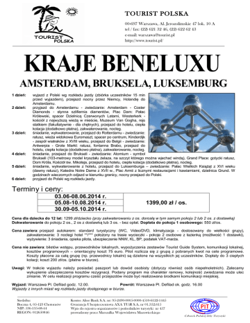 TOURIST POLSKA 00-697 Warszawa, Al. Jerozolimskie 47 lok. 10 A tel / fax: (22) 621 32 46, (22) 622 62 43 e-mail: [email protected] http://www.tourist.pl/ KRAJE BENELUXU AMSTERDAM, BRUKSELA, LUKSEMBURG 1 dzień: 2 dzień: 3 dzień: 4 dzień: 5 dzień: 6 dzień: wyjazd z Polski wg rozkładu jazdy (zbiórka uczestników 15 min przed wyjazdem), przejazd nocny przez Niemcy, Holandię do Amsterdamu. przyjazd do Amsterdamu - zwiedzanie: Amsterdam - Coster Diamonds - słynna szlifiernia diamentów, Plac Dam: Pałac Królewski, spacer Dzielnicą Czerwonych Latarni, Westerkerk kościół z najwyższą wieżą w mieście, Muzeum Van Gogha, rejs statkiem (fakultatywnie - dla chętnych), przejazd do hotelu, ciepła kolacja (dodatkowo płatna), zakwaterowanie, nocleg. śniadanie, wykwaterowanie, przejazd do Rotterdamu - zwiedzanie: ratusz, wieża widokowa Euromaszt, spacer po centrum, Kinderdijk - zespół wiatraków z XVIII wieku, przejazd do Belgii - zwiedzanie: Antwerpia - Grote Markt: ratusz, fontanna Brabo, przejazd do hotelu, ciepła kolacja (dodatkowo płatna), zakwaterowanie, nocleg. śniadanie, przejazd do Brukseli - zwiedzanie: Atomium - symbol Brukseli (103-metrowy model kryształu żelaza, na szczyt którego można wjechać windą), Grand Place: gotycki ratusz, Dom Króla, Kościół św. Mikołaja, przejazd do hotelu, ciepła kolacja (dodatkowo płatna), nocleg. śniadanie, wykwaterowanie z hotelu, przejazd do Luksemburga – zwiedzanie: Pałac Wielkich Książąt z XVI wieku (dawny ratusz), Katedra Notre Dame z XVII w., Plac Armii z licznymi restauracjami i kawiarniami, dzielnica Grund. W godzinach wieczornych odjazd w kierunku granicy, nocny przejazd do Polski. przyjazd do Polski wg rozkładu jazdy. Terminy i ceny: 03.06-08.06.2014 r. 05.08-10.08.2014 r. 30.09-05.10.2014 r. 1399,00 zł / os. Cena dla dziecka do 12 lat: 1299 zł/dziecko (przy zakwaterowaniu z os. dorosłą w tym samym pokoju 2 lub 2 os. z dostawką) Dokwaterowanie do pokoju 2 os., 2 os z dostawką lub 3 os. - bez opłat. Dopłata do pokoju 1 osobowego: 550 zł/os. Cena zawiera: przejazd autokarem: standard turystyczny (WC, Video/DVD, klimatyzacja - dostosowany do wielkości grupy), zakwaterowanie: 3 noclegi hotel **/*** położony na trasie wycieczki - pokoje 2 osobowe z łazienką (możliwość 1 dostawki), wyżywienie: 3 śniadania, opieka pilota, ubezpieczenie NNW, KL, BP, podatek VAT-marża. Cena nie zawiera: biletów wstępu, przewodników lokalnych, wypożyczenia zestawów Tourist Guide System, komunikacji lokalnej, kosztów programowych – orientacyjny koszt 75 euro. Pilot rozlicza się z grupą z pobranych kwot na cele programowe. Koszty płacone za całą grupę (np. przewodnicy lokalni) są dzielone na wszystkich jej uczestników. Dopłaty do 3 ciepłych kolacji; koszt 200 zł/os. (płatne w biurze). Uwagi: W trakcie wyjazdu należy posiadać paszport lub dowód osobisty (dotyczy również osób niepełnoletnich). Zalecamy wykupienie ubezpieczenia kosztów rezygnacji. Podany program ma charakter ramowy, kolejność zwiedzania może ulec zmianie. W celu realizacji programu cześć przejazdów może być realizowana środkami komunikacji miejskiej. Wyjazd: Warszawa Pl. Defilad godz. 12.00. Powrót: Warszawa Pl. Defilad ok. godz. 16.00 Wyjazdy z innych miast wg rozkładu jazdy dostępnego w biurze. Siedziba: Boczna 4, 05-123 Chotomów NIP: 536-135-68-44 REGON: 012650846 Konto: Alior Bank S.A. nr: 95-2490-0005-0000-4510-6122-1445 Gwarancja Ubezpieczeniowa AXA TUiR S.A. nr 01.352.615 Wpis do rejestru organizatorów i pośredników turystyki nr 457 prowadzony przez Marszałka Województwa Mazowieckiego Cz ł onek Polskiej Izby Turystyki