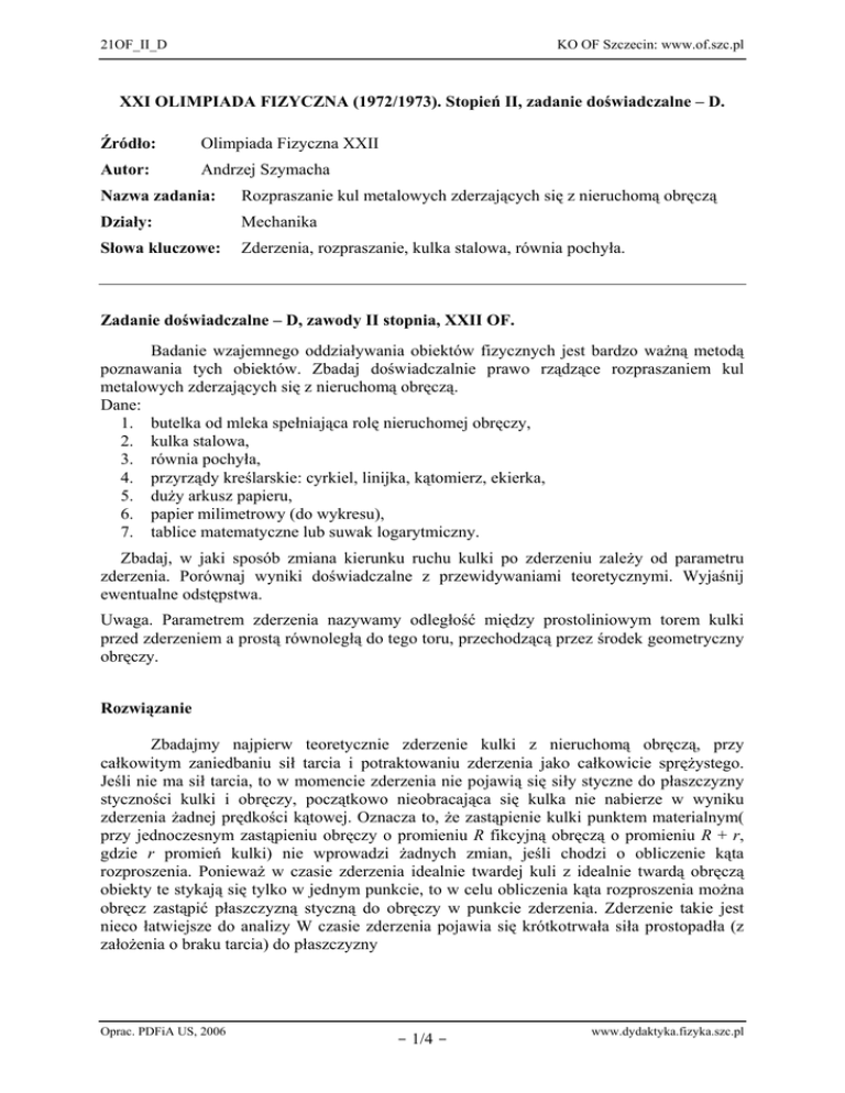 21OF_II_D KO OF Szczecin: www.of.szc.pl XXI OLIMPIADA FIZYCZNA (1972/1973). Stopień II, zadanie doświadczalne – D. Źródło: Olimpiada Fizyczna XXII Autor: Andrzej Szymacha Nazwa zadania: Rozpraszanie kul metalowych zderzających się z nieruchomą obręczą Działy: Mechanika Słowa kluczowe: Zderzenia, rozpraszanie, kulka stalowa, równia pochyła. Zadanie doświadczalne – D, zawody II stopnia, XXII OF. Badanie wzajemnego oddziaływania obiektów fizycznych jest bardzo ważną metodą poznawania tych obiektów. Zbadaj doświadczalnie prawo rządzące rozpraszaniem kul metalowych zderzających się z nieruchomą obręczą. Dane: 1. butelka od mleka spełniająca rolę nieruchomej obręczy, 2. kulka stalowa, 3. równia pochyła, 4. przyrządy kreślarskie: cyrkiel, linijka, kątomierz, ekierka, 5. duży arkusz papieru, 6. papier milimetrowy (do wykresu), 7. tablice matematyczne lub suwak logarytmiczny. Zbadaj, w jaki sposób zmiana kierunku ruchu kulki po zderzeniu zależy od parametru zderzenia. Porównaj wyniki doświadczalne z przewidywaniami teoretycznymi. Wyjaśnij ewentualne odstępstwa. Uwaga. Parametrem zderzenia nazywamy odległość między prostoliniowym torem kulki przed zderzeniem a prostą równoległą do tego toru, przechodzącą przez środek geometryczny obręczy. Rozwiązanie Zbadajmy najpierw teoretycznie zderzenie kulki z nieruchomą obręczą, przy całkowitym zaniedbaniu sił tarcia i potraktowaniu zderzenia jako całkowicie sprężystego. Jeśli nie ma sił tarcia, to w momencie zderzenia nie pojawią się siły styczne do płaszczyzny styczności kulki i obręczy, początkowo nieobracająca się kulka nie nabierze w wyniku zderzenia żadnej prędkości kątowej. Oznacza to, że zastąpienie kulki punktem materialnym( przy jednoczesnym zastąpieniu obręczy o promieniu R fikcyjną obręczą o promieniu R + r, gdzie r promień kulki) nie wprowadzi żadnych zmian, jeśli chodzi o obliczenie kąta rozproszenia. Ponieważ w czasie zderzenia idealnie twardej kuli z idealnie twardą obręczą obiekty te stykają się tylko w jednym punkcie, to w celu obliczenia kąta rozproszenia można obręcz zastąpić płaszczyzną styczną do obręczy w punkcie zderzenia. Zderzenie takie jest nieco łatwiejsze do analizy W czasie zderzenia pojawia się krótkotrwała siła prostopadła (z założenia o braku tarcia) do płaszczyzny Oprac. PDFiA US, 2006 - 1/4 - www.dydaktyka.fizyka.szc.pl 21OF_II_D KO OF Szczecin: www.of.szc.pl Rys. 1. zderzenia. Siła ta zmienia pęd kulki prostopadły do płaszczyzny zderzenia, ale nie zmienia pędu równoległego. Przed zderzeniem mamy: p II = p sin α , p ⊥ = p cos α . Ponieważ w wyniku zderzenia nie zmienia się energia kinetyczna (sprężystość zderzenia), nie może też zmieniać się bezwzględna wartość pędu związana jednoznacznie z energią kinetyczną wzorem Ek = p2 . 2m Po zderzeniu mamy, więc p C = p sin β = p sin α , z czego wnioskujemy, że α =β a) b) Rys. 2. Jest to podstawowa własność zderzenia sprężystego, identyczna z prawem odbicia dla promieni świetlnych. Skoro już ustaliliśmy równość tych kątów, to dalej bardzo łatwo obliczamy Oprac. PDFiA US, 2006 - 2/4 - www.dydaktyka.fizyka.szc.pl 21OF_II_D KO OF Szczecin: www.of.szc.pl θ = 180 0 − α − β = 180 0 − 2α , sin α = b . R+r Eliminując z tych wzorów kąt l, dostaniemy poszukiwany związek kąta rozproszenia z parametrem zderzenia. Najwygodniej zapisać go w postaci: 1 + cos θ = 2 cos 2 θ 2 = 2 sin 2 α = 2 b2 ( R + r )2 . (1) Porównanie związku teoretycznego z doświadczeniem staje się najbardziej przejrzyste, jeżeli w wyniku właściwego wyboru mierzonych wielkości, zależność między nimi staje się zależnością liniową. Zawsze, o ile to możliwe, staramy się to osiągnąć. Dlatego w tym wypadku zapisaliśmy związek między θ i b w postaci wzoru (1), w którym funkcja jednej tylko wielkości (1 + cos θ ) jest proporcjonalna do funkcji drugiej wielkości (b2). Odkładając na osiach te właśnie wielkości powinniśmy uzyskać układanie się wyznaczonych doświadczalnie punktów na linii prostej. Powtarzając kilkakrotnie dla danej wartości parametru zderzenia pomiar wielkości kąta rozproszenia możemy zmierzyć wartość tego kąta z większą dokładnością, niż gdybyśmy pomiaru dokonali tylko jeden raz. Możemy też z rozrzutu mierzonego kąta oszacować błąd pojedynczego pomiaru. A oto wykres uzyskany w wyniku jednego z takich doświadczeń. Rys. 3. Zgodnie z tym, co powiedzieliśmy, na osiach odłożone zostały b2 i (1 + cos θ ). Linia ciągła odpowiada przewidywaniom teoretycznym zawartym we wzorze (1). Środki pionowych odcinków oznaczają zmierzone wartości średnie wielkości (1 + cos θ ), długości odcinków opisują przedziały błędów dla pomiaru przy ustalonej wartości parametru zderzenia. Ściśle rzecz biorąc cały wykres powinien zmieścić się w jednej tylko ćwiartce. Dla większej poglądowości umieszczono na tym wykresie (po lewej stronie) wyniki pomiarów dla rozpraszań na przeciwnej stronie obręczy. Wprawdzie można powiedzieć, że przy osiągniętej dokładności żaden z poszczególnych punktów pomiarowych nie jest w sprzeczności z teorią, to jednak jest mało prawdopodobne, by środki wszystkich odcinków leżały przypadkowo akurat ponad prostą. Oprac. PDFiA US, 2006 - 3/4 - www.dydaktyka.fizyka.szc.pl 21OF_II_D KO OF Szczecin: www.of.szc.pl Jeśli założyć pewien stopień niesprężystości i jednocześnie brak tarcia, to można stwierdzić, że styczna składowa pędu nie ulegnie zmianie po odbiciu, ale długość całego wektora ulegnie zmniejszeniu (rys. 2b.). Jasne jest, że po takim zderzeniu β > α , a zatem kąt θ jest mniejszy i jego cosinus większy od wartości, jaką by miał, gdyby β = α. Zgadza się to z obserwowanym systematycznym podniesieniem punktów doświadczalnych ponad wykres teoretyczny. Jeszcze większe komplikacje w opisie zjawisk