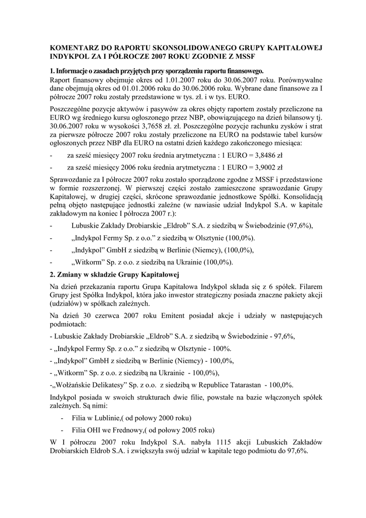 KOMENTARZ DO RAPORTU SKONSOLIDOWANEGO GRUPY KAPITAŁOWEJ INDYKPOL ZA I PÓŁROCZE 2007 ROKU ZGODNIE Z MSSF 1. Informacje o zasadach przyjętych przy sporządzeniu raportu finansowego. Raport finansowy obejmuje okres od 1.01.2007 roku do 30.06.2007 roku. Porównywalne dane obejmują okres od 01.01.2006 roku do 30.06.2006 roku. Wybrane dane finansowe za I półrocze 2007 roku zostały przedstawione w tys. zł. i w tys. EURO. Poszczególne pozycje aktywów i pasywów za okres objęty raportem zostały przeliczone na EURO wg średniego kursu ogłoszonego przez NBP, obowiązującego na dzień bilansowy tj. 30.06.2007 roku w wysokości 3,7658 zł. zł. Poszczególne pozycje rachunku zysków i strat za pierwsze półrocze 2007 roku zostały przeliczone na EURO na podstawie tabel kursów ogłoszonych przez NBP dla EURO na ostatni dzień kaŜdego zakończonego miesiąca: - za sześć miesięcy 2007 roku średnia arytmetyczna : 1 EURO = 3,8486 zł - za sześć miesięcy 2006 roku średnia arytmetyczna : 1 EURO = 3,9002 zł Sprawozdanie za I półrocze 2007 roku zostało sporządzone zgodne z MSSF i przedstawione w formie rozszerzonej. W pierwszej części zostało zamieszczone sprawozdanie Grupy Kapitałowej, w drugiej części, skrócone sprawozdanie jednostkowe Spółki. Konsolidacją pełną objęto następujące jednostki zaleŜne (w nawiasie udział Indykpol S.A. w kapitale zakładowym na koniec I półrocza 2007 r.): - Lubuskie Zakłady Drobiarskie „Eldrob” S.A. z siedzibą w Świebodzinie (97,6%), - „Indykpol Fermy Sp. z o.o.” z siedzibą w Olsztynie (100,0%). - „Indykpol” GmbH z siedzibą w Berlinie (Niemcy), (100,0%), - „Witkorm” Sp. z o.o. z siedzibą na Ukrainie (100,0%). 2. Zmiany w składzie Grupy Kapitałowej Na dzień przekazania raportu Grupa Kapitałowa Indykpol składa się z 6 spółek. Filarem Grupy jest Spółka Indykpol, która jako inwestor strategiczny posiada znaczne pakiety akcji (udziałów) w spółkach zaleŜnych. Na dzień 30 czerwca 2007 roku Emitent posiadał akcje i udziały w następujących podmiotach: - Lubuskie Zakłady Drobiarskie „Eldrob” S.A. z siedzibą w Świebodzinie - 97,6%, - „Indykpol Fermy Sp. z o.o.” z siedzibą w Olsztynie - 100%. - „Indykpol” GmbH z siedzibą w Berlinie (Niemcy) - 100,0%, - „Witkorm” Sp. z o.o. z siedzibą na Ukrainie - 100,0%), -„WołŜańskie Delikatesy” Sp. z o.o. z siedzibą w Republice Tatarastan - 100,0%. Indykpol posiada w swoich strukturach dwie filie, powstałe na bazie włączonych spółek zaleŜnych. Są nimi: - Filia w Lublinie,( od połowy 2000 roku) - Filia OHI we Frednowy,( od połowy 2005 roku) W I półroczu 2007 roku Indykpol S.A. nabyła 1115 akcji Lubuskich Zakładów Drobiarskich Eldrob S.A. i zwiększyła swój udział w kapitale tego podmiotu do 97,6%. Uwzględniając zmianę lokalizacji inwestycji zagranicznej Spółka zbyła za cenę 30 000 USD udział (100% kapitału) o wartości nominalnej 270 000 UAH w spółce zaleŜnej „Indykprodukt” Sp. z o.o. z siedzibą na Ukrainie oraz zawiązała spółkę pod firmą „WołŜańskie Delikatesy” Spółka z ograniczona odpowiedzialnością - z siedzibą w Wierchniem Usłonie w Republice Tatarstan (Federacja Rosyjska). Kapitał zakładowy spółki wynosił 350 tys. rubli. 100% udziałów objęła Indykpol Spółka Akcyjna z siedzibą w Olsztynie (Polska). W lipcu br. kapitał zakładowy Spółki został podwyŜszony do kwoty 10 mln rubli. Spółka została utworzona na czas nieokreślony. Przedmiotem działalności utworzonej spółki będzie produkcja pasz, produkcja piskląt, chów indyków, ubój indyków oraz produkcja mięsa i wyrobów drobiowych. Na realizację inwestycji Indykpol zamierza przeznaczyć 25 mln euro. ZaangaŜowanie kapitałowe Spółki nie jest na razie duŜe ale w najbliŜszych miesiącach powinno wzrosnąć. Spółka planuje uruchomienie w Republice Tatarstan produkcji fermowej, produkcji pasz, wylęgarni piskląt oraz zbudowanie zakładu ubojowoprzetwórczego. Rosja to duŜy rynek zbytu o duŜym potencjale, niedostępny obecnie dla polskich producentów drobiu. SpoŜycie drobiu w Rosji chociaŜ stale rośnie wciąŜ znacznie odbiega od średniej europejskiej. 3. Zwięzły opis istotnych dokonań lub niepowodzeń Emitenta w I półroczu 2007 roku. W okresie obejmującym pierwsze sześć miesięcy 2007 roku Grupa Kapitałowa wypracowała przychody ze sprzedaŜy w kwocie 339 984 tys. zł, zysk na działalności operacyjnej 12 370 tys. zł, zysk brutto 12 651 tys. zł i zysk netto 9 866 tys. zł. W porównaniu do wyników roku poprzedniego przychody ze sprzedaŜy wzrosły o 19,5 %, zysk na działalności operacyjnej o 58,5 %, zysk brutto o 132,6% i zysk netto o 119,3 %. I półrocze 2007 roku Spółka zamknęła przychodami w kwocie 346 106 tys. zł o 18,7% wyŜszymi niŜ w roku ubiegłym. Wypracowała zysk na działalności operacyjnej w kwocie 10 602 tys. zł, zysk brutto w wysokości 11 002 tys. zł, a zysk netto w kwocie 8 683 tys. zł. W porównaniu do wyników ubiegłego roku zysk na działalności operacyjnej wzrósł o 9,5%, zysk brutto o 39,9% a zysk netto o 27,5%. Indykpol to producent wysokiej jakości, zdrowych i dietetycznych mięs drobiowych, w głównej mierze indyczych oraz bardzo smacznych przetworów. Produkty Indykpolu produkowane są zgodnie z najlepszymi standardami sanitarno-weterynaryjnymi. Wszystkie jego zakłady od lat stosują procedury systemu bezpieczeństwa zdrowotnego HACCP i systemu zapewnienia jakości ISO 9001. Nowoczesne linie produkcyjne nie tylko gwarantują bezpieczeństwo zdrowotne wyrobów, ale umoŜliwiają równieŜ śledzenie wyrobów na kaŜdym etapie procesu produkcyjnego. Proces obróbki i przetwórstwa drobiu odbywa się pod stałym nadzorem państwowych słuŜb sanitarno-weterynaryjnych. Funkcjonujący w Grupie Kapitałowej system dystrybucji umoŜliwia dostarczenie wyrobów z trzech zakładów produkcyjnych (Olsztyn, Lublin, Świebodzin) do odbiorców na te