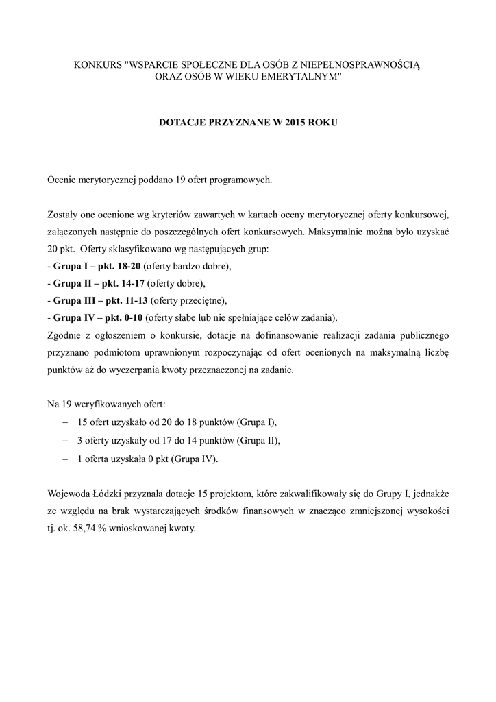 KONKURS "WSPARCIE SPOŁECZNE DLA OSÓB Z NIEPEŁNOSPRAWNOŚCIĄ ORAZ OSÓB W WIEKU EMERYTALNYM" DOTACJE PRZYZNANE W 2015 ROKU Ocenie merytorycznej poddano 19 ofert programowych. Zostały one ocenione wg kryteriów zawartych w kartach oceny merytorycznej oferty konkursowej, załączonych następnie do poszczególnych ofert konkursowych. Maksymalnie można było uzyskać 20 pkt. Oferty sklasyfikowano wg następujących grup: - Grupa I – pkt. 18-20 (oferty bardzo dobre), - Grupa II – pkt. 14-17 (oferty dobre), - Grupa III – pkt. 11-13 (oferty przeciętne), - Grupa IV – pkt. 0-10 (oferty słabe lub nie spełniające celów zadania). Zgodnie z ogłoszeniem o konkursie, dotacje na dofinansowanie realizacji zadania publicznego przyznano podmiotom uprawnionym rozpoczynając od ofert ocenionych na maksymalną liczbę punktów aż do wyczerpania kwoty przeznaczonej na zadanie. Na 19 weryfikowanych ofert: 15 ofert uzyskało od 20 do 18 punktów (Grupa I), 3 oferty uzyskały od 17 do 14 punktów (Grupa II), 1 oferta uzyskała 0 pkt (Grupa IV). Wojewoda Łódzki przyznała dotacje 15 projektom, które zakwalifikowały się do Grupy I, jednakże ze względu na brak wystarczających środków finansowych w znacząco zmniejszonej wysokości tj. ok. 58,74 % wnioskowanej kwoty. L.p. Nazwa oferenta 1 Fundacja „Dom w Łodzi” Łódź, ul. Wierzbowa 13 Fundacja del Cielo Zgierz, ul. Chełmska 16/18 Fundacja „Ostoja” im. Siostry Klaryski Stanisławy z Opoczna, Opoczno, ul. Westerplatte 2 Drzewickie Centrum Wolontariatu "Ofiarna Dłoń" Drzewica, ul. St. Staszica 5 Polskie Stowarzyszenie Na Rzecz Osób z Upośledzeniem Umysłowym Koło w Aleksandrowie Łódzkim Aleksandrów Łódzki, ul. 1-go Maja 43/47 Polskie Stowarzyszenie Na Rzecz Osób z Upośledzeniem Umysłowym Koło w Zgierzu, Zgierz, ul. Chełmska 42/42a Polskie Towarzystwo Stwardnienia Rozsianego O/Łódź Łódź, ul. Przybyszewskiego 255/267 Stowarzyszenie Rodzin Dzieci i Osób Niepełnosprawnych Tomaszów Maz., ul. Farbiarska 20 Związek Harcerstwa Polskiego Chorągiew Łódzka Hufiec Inowłódz Inowłódz, ul. Spalska 5 Stowarzyszenie Działające Na Rzecz Osób Niepełnosprawnych „Budzimy Nadzieje”, Drzewica, ul. Słowackiego 4 Stowarzyszenie „Nasza Galeria” Łódź, ul. Piotrkowska 17 Stowarzyszenie Na Rzecz Osób Niepełnosprawnych „Pokój”, Łódź, ul. Sędziowska 8/10 Towarzystwo Przyjaciół Niepełnosprawnych Łódź, ul. Zawiszy Czarnego 22 Caritas Archidiecezji Łódzkiej Łódź, ul. Gdańska 111 Spółdzielnia Socjalna „Ksero Zawisza” Łódź, ul. Krawiecka 10 abc 2 3 4 5 6 7 8 9 10 11 12 13 14 15 Ogółem Liczba punktów 20 Kwota dotacji 3.130,00 18 5.874,00 18 3.550,00 19 4.288,00 20 5.169,00 18 1.740,00 20 5.404,00 19 5.521,00 20 3.994,00 20 4.229,00 20 5.874,00 20 4.816,00 19 4.699,00 20 5.838,00 18 5.874,00 70.000,00