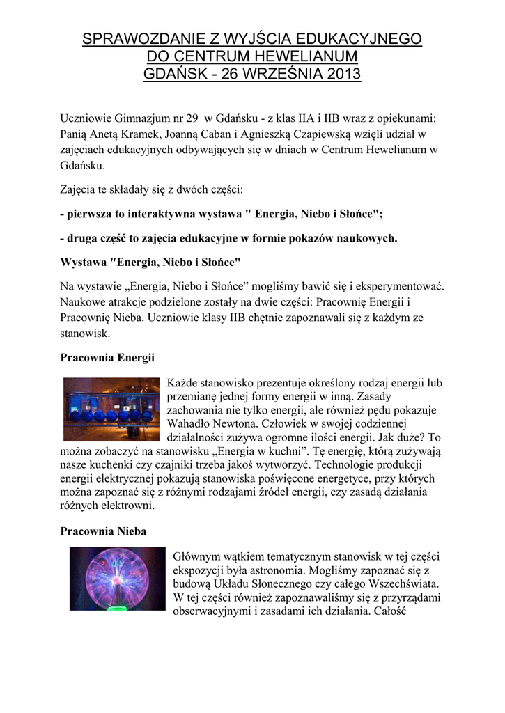 SPRAWOZDANIE Z WYJŚCIA EDUKACYJNEGO DO CENTRUM HEWELIANUM GDAŃSK - 26 WRZEŚNIA 2013 Uczniowie Gimnazjum nr 29 w Gdańsku - z klas IIA i IIB wraz z opiekunami: Panią Anetą Kramek, Joanną Caban i Agnieszką Czapiewską wzięli udział w zajęciach edukacyjnych odbywających się w dniach w Centrum Hewelianum w Gdańsku. Zajęcia te składały się z dwóch części: - pierwsza to interaktywna wystawa " Energia, Niebo i Słońce"; - druga część to zajęcia edukacyjne w formie pokazów naukowych. Wystawa "Energia, Niebo i Słońce" Na wystawie „Energia, Niebo i Słońce” mogliśmy bawić się i eksperymentować. Naukowe atrakcje podzielone zostały na dwie części: Pracownię Energii i Pracownię Nieba. Uczniowie klasy IIB chętnie zapoznawali się z każdym ze stanowisk. Pracownia Energii Każde stanowisko prezentuje określony rodzaj energii lub przemianę jednej formy energii w inną. Zasady zachowania nie tylko energii, ale również pędu pokazuje Wahadło Newtona. Człowiek w swojej codziennej działalności zużywa ogromne ilości energii. Jak duże? To można zobaczyć na stanowisku „Energia w kuchni”. Tę energię, którą zużywają nasze kuchenki czy czajniki trzeba jakoś wytworzyć. Technologie produkcji energii elektrycznej pokazują stanowiska poświęcone energetyce, przy których można zapoznać się z różnymi rodzajami źródeł energii, czy zasadą działania różnych elektrowni. Pracownia Nieba Głównym wątkiem tematycznym stanowisk w tej części ekspozycji była astronomia. Mogliśmy zapoznać się z budową Układu Słonecznego czy całego Wszechświata. W tej części również zapoznawaliśmy się z przyrządami obserwacyjnymi i zasadami ich działania. Całość SPRAWOZDANIE Z WYJŚCIA EDUKACYJNEGO DO CENTRUM HEWELIANUM GDAŃSK - 26 WRZEŚNIA 2013 uzupełniona została galerią niezwykłych zdjęć z kosmosu, które można było oglądać w nieziemskiej wręcz scenerii stworzonej grą świateł i efektami dźwiękowymi. Pokazy naukowe pt: "Żywiołowe powietrze" W czasie tych zajęć uczniowie zapoznali się z serią doświadczeń, w których dominujące znaczenie ma powietrze oraz ciśnienie. Eksplozja puszki czy chmura wytworzona w butelce to tylko niektóre z eksperymentów, których tajniki poznaliśmy uczestnicząc w pokazach. Uczniowie z wielkim przejęciem i zainteresowaniem brali udział w doświadczeniach. Centrum Hewelianum stanowi ważny element edukacji młodego pokolenia – nauka poprzez zabawę i samodzielne eksperymentowanie przybliża uczniom niekiedy trudne i niezrozumiałe dla nich zagadnienia z fizyki. Aneta Kramek