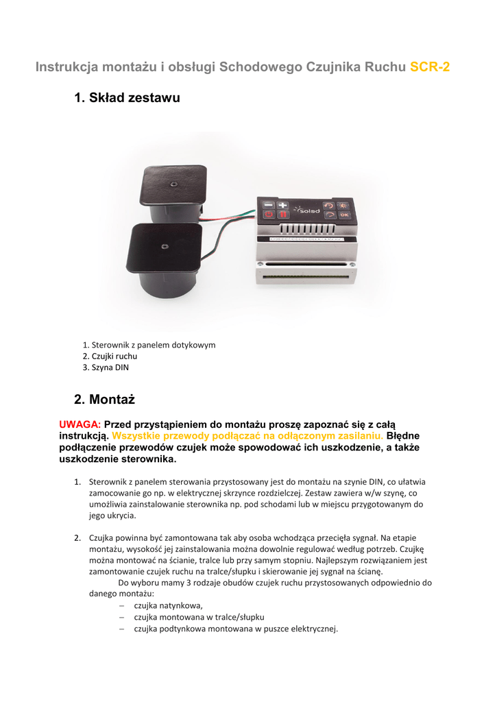 Instrukcja montażu i obsługi Schodowego Czujnika Ruchu SCR-2 1. Skład zestawu 1. Sterownik z panelem dotykowym 2. Czujki ruchu 3. Szyna DIN 2. Montaż UWAGA: Przed przystąpieniem do montażu proszę zapoznać się z całą instrukcją. Wszystkie przewody podłączać na odłączonym zasilaniu. Błędne podłączenie przewodów czujek może spowodować ich uszkodzenie, a także uszkodzenie sterownika. 1. Sterownik z panelem sterowania przystosowany jest do montażu na szynie DIN, co ułatwia zamocowanie go np. w elektrycznej skrzynce rozdzielczej. Zestaw zawiera w/w szynę, co umożliwia zainstalowanie sterownika np. pod schodami lub w miejscu przygotowanym do jego ukrycia. 2. Czujka powinna być zamontowana tak aby osoba wchodząca przecięła sygnał. Na etapie montażu, wysokość jej zainstalowania można dowolnie regulować według potrzeb. Czujkę można montować na ścianie, tralce lub przy samym stopniu. Najlepszym rozwiązaniem jest zamontowanie czujek ruchu na tralce/słupku i skierowanie jej sygnał na ścianę. Do wyboru mamy 3 rodzaje obudów czujek ruchu przystosowanych odpowiednio do danego montażu: czujka natynkowa, czujka montowana w tralce/słupku czujka podtynkowa montowana w puszce elektrycznej. 3. Nie ma znaczenia, która czujka zostanie zamontowana na dole, a która na górze schodów. Ważne, aby obie czujki podłączyć w odpowiednie miejsce na sterowniku. 4. Po zamontowaniu czujek można przystąpić do podłączenia ich do sterownika. W tym celu należy podłączyć je w oznaczonym kolorami miejscu na sterowniku: Czerwony, Czarny, Zielony. 5. Do sterownika należy podłączyć tylko jedną czujkę przewodem sygnałowym 3-żyłowym (3x0,3mm) (może być, także skrętka UTP) do złączek sterownika oznaczonych kolorowymi kropkami. Czujka powinna być podłączana na odłączonym zasilaniu. Każdy z trzech kolorów przewodów wychodzących z czujek ma przyporządkowaną łączówkę w sterowniku oznaczoną kropką o tym samym kolorze. 6. Po zamontowaniu pierwszej czujki możemy podpiąć zasilacz DC 12V do złączek na sterowniku oznaczonych – i + i podłączyć zasilanie. Aby przetestować prawidłowe działanie czujki, konieczne jest podłączenie przynajmniej jednej oprawy oświetleniowej. Dwie pierwsze diody od lewej strony informują o podłączeniu czujek (górna i dolna). Gdy sterownik wykryje ruch, w którejś z czujek dioda na panelu poinformuje o tym poprzez zaświecenie. Po prawidłowym zamontowaniu pierwszej czujki możemy przejść do montażu drugiej. Ważne jest, aby ponownie odłączyć zasilanie. 7. Do podłączenia oświetlenia LED zarezerwowane są w sterowniku 22 złączki (możliwość podłączenia 21 stopni). Numeracja od 1 do 21 odpowiada stopniom licząc od dołu schodów. Do tych numerów podłączamy MINUS od każdego ze stopnia. Złączka A oznacza wspólny PLUS dla wszystkich stopni. Do tego celu najlepiej użyć przewodu linka 2x0,3mm2 lub 2x0,75mm2 (możliwość zakupu w naszym sklepie). 8. W przypadku wystąpienia przepięcia w sieci energetycznej, może wystąpić efekt zawieszenia się procesora w sterowniku (przypadek bardzo mało prawdopodobny). Istnieje, także metoda na zresetowanie całego sterownika i przywrócenia mu pełnej sprawności. W takim przypadku należy: - Odłączyć zasilanie sterownika, - Wcisnąć i przytrzymać jednocześnie przycisk funkcji „+” oraz „-”, - Wciskając przyciski podłączyć zasilanie sterownika. Oznaką poprawnego resetu jest zaświecenie się po kolei każdej diody informującej, które znajdują się w prawym górnym rogu sterownika. 3. Obsługa panelu sterownika 1. Przeznaczenie przycisków oraz wprowadzanie zmian w regulacji: - Po wciśnięciu przycisku z daną funkcją (czas, jasność lub prędkość – tylko w przypadku sterownika SCR-2), należy ustawić konkretną wartość za pomocą przycisków regulujących „+” oraz „-”. Następnie zatwierdzamy zmiany przyciskając OK. 2. Ustawienie ILOŚCI STOPNI/RESET STEROWNIKA DO FUNKCJI PODSTAWOWYCH Ustawienie ilości stopni/reset sterownika należy przeprowadzić w następujący sposób: Należy odłączyć sterownik od zasilania Kolejnym krokiem jest naciśnięcie i przytrzymanie przycisku „PAUZA” Przytrzymując przycisk „PAUZA” jednocześnie załączamy zasilanie Oznaką prawidłowego zresetowania sterownika jest przejście kolejno w prawo diod informacyjnych znajdujących się w prawym górnym rogu obudowy Po skończeniu resetowania sterownika, powinny świecić dwie diody informacyjne (23 patrząc od prawej). Diody te informują, że aktualnie jest zaprogramowana minimalna ilość stopni (6 sztuk) Aby zwiększyć ilość wymaganych stopni należy nacisnąć przycisk „+”, każde naciśnięcie zwiększy wartość o 1 stopień (jednocześnie zmieni nam się ustawienie diod informacyjnych), przyciskiem „-” zmniejszamy wartość stopni. Po ustawieniu konkretnej ilości stopni, należy wcisnąć przycisk „OK”, który kończy całą operację. Oznaczenie DIOD informacyjnych na sterowniku przy określonej ilości stopni: 6 STOPNI 7 STOPNI 8 STOPNI 9 STOPNI 10 STOPNI 11 STOPNI 12 STOPNI 13 STOPNI 14 STOPNI 15 STOPNI 16 STOPNI ` 17 STOPNI 18 STOPNI 19 STOPNI 20 STOPNI 21 STOPNI 3. Oznaczenie diod informujących Diody oznaczone 3,2,1 wskazują, w którym miejscu zakresu jest obecnie ustawiony sterownik. Poniżej znajdują się położenia uszeregowane od najmniejszego do największego: REGULACJA JASNOŚCIĄ SZYBKOŚĆ ZAPALANIA SIĘ STOPNI 20% Najwolniej CZAS ŚWIECENIA PO ZAPALENIU SIĘ WSZYSTKICH STOPNI 100% JASNOŚCI 20% JASNOŚCI 0 sek. 0 sek. 30% 10 sek. 10 sek. 40% 20 sek. 20 sek. 50% 35 sek. 35 sek. 60% 60 sek. 60 sek. 70% 120 sek. 120 sek. 85% 180 sek. 300 sek. 300 sek. 420 sek. 100% Najszybciej SZYBKOŚĆ ZAPALANIA SIĘ STOPNI: - Szybkość zapalania się stopni jeden po drugim, jest zależne także od ustawienia jasności oświetlenia. W przypadku jasności na poziomie 20% stopnie będą zapala