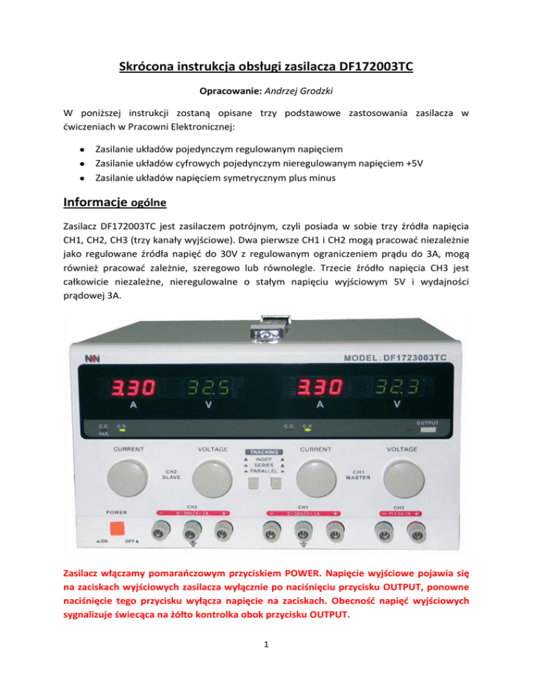 Skrócona instrukcja obsługi zasilacza DF172003TC Opracowanie: Andrzej Grodzki W poniższej instrukcji zostaną opisane trzy podstawowe zastosowania zasilacza w ćwiczeniach w Pracowni Elektronicznej: Zasilanie układów pojedynczym regulowanym napięciem Zasilanie układów cyfrowych pojedynczym nieregulowanym napięciem +5V Zasilanie układów napięciem symetrycznym plus minus Informacje ogólne Zasilacz DF172003TC jest zasilaczem potrójnym, czyli posiada w sobie trzy źródła napięcia CH1, CH2, CH3 (trzy kanały wyjściowe). Dwa pierwsze CH1 i CH2 mogą pracować niezależnie jako regulowane źródła napięć do 30V z regulowanym ograniczeniem prądu do 3A, mogą również pracować zależnie, szeregowo lub równolegle. Trzecie źródło napięcia CH3 jest całkowicie niezależne, nieregulowalne o stałym napięciu wyjściowym 5V i wydajności prądowej 3A. Zasilacz włączamy pomarańczowym przyciskiem POWER. Napięcie wyjściowe pojawia się na zaciskach wyjściowych zasilacza wyłącznie po naciśnięciu przycisku OUTPUT, ponowne naciśnięcie tego przycisku wyłącza napięcie na zaciskach. Obecność napięć wyjściowych sygnalizuje świecąca na żółto kontrolka obok przycisku OUTPUT. 1 Zasilanie układów pojedynczym regulowanym napięciem Tryb ten jest najczęściej używany w ćwiczeniach. Do wyboru mamy dwa kanały wyjściowe CH1 lub CH2, napięcie ustawiamy pokrętłami VOLTAGE. Wartość ustawionego napięcia jest zawsze widoczna na cyfrowych zielonych wyświetlaczach V. Napięcie na zaciskach wyjściowych pojawia się po naciśnięciu przycisku OUTPUT i jest sygnalizowane świeceniem żółtej kontrolki obok przycisku. Ponowne naciśniecie przycisku wyłącza napięcie. Napięcie wyjściowe pobieramy z zacisków skrajnych CH1+ CH1- lub CH2+ CH2-, środkowy zacisk to uziemienie nie jest on wykorzystany w żadnym z ćwiczeń, zawsze pozostaje niepodłączony. Zielone kontrolki C.V. sygnalizują stabilizację napięcia wyjściowego (Constans Voltage), jeżeli zgasną a jednocześnie zaświecą się kontrolki C.C. oznacza to ograniczenie prądu wyjściowego zasilacza. Zasilacz przestaje stabilizować napięcie wyjściowe, a zaczyna stabilizować prąd wyjściowy. We wszystkich ćwiczeniach pracujemy wyłącznie ze stabilizacją napięcia, dlatego zawsze powinny świecić się kontrolki C.V. Należy zwrócić uwagę, aby w tym zastosowaniu zasilacz nie miał wciśniętego żadnego z przycisków TRACING, odpowiada to niezależnemu modowi pracy INDEPendent. Pokrętła CURRENT służą do ustawiania ogranicznika prądu. Ustawiona wartość prądu ograniczenia jest widoczna na czerwonych wyświetlaczach A, tylko w czasie wyłączonego napięcia. Po włączeniu napięcia przyciskiem OUTPUT czerwone wyświetlacze wskazują aktualną wartość pobieranego prądu z zasilacza. Zasilanie układów cyfrowych pojedynczym napięciem nieregulowanym napięciem +5V Tryb ten jest wykorzystywany w ćwiczeniach cyfrowych do zasilania makiety cyfrowej i jest najprostszym ze wszystkich, wystarczy podłączyć makietę cyfrową do zacisków trzeciego źródła CH3, pamiętając o odpowiedniej polaryzacji plus minus, po czym włączyć napięcie na zaciskach wyjściowych przyciskiem OUTPUT. Nie trzeba ustawiać napięcia wyjściowego. Z tego wyjścia możemy bez problemu zasilać trzy makiety cyfrowe. Zasilanie układów napięciem symetrycznym plus minus np.+-15V Tryb ten jest stosowany tylko w ćwiczeniu ze wzmacniaczami operacyjnymi, które do prawidłowej pracy wymagają symetrycznego napięcia +- 15V. Do prawidłowego zasilania wzmacniacza operacyjnego przełączamy zasilacz lewym przyciskiem TRACING do pracy szeregowej SERIES. Zasilacz automatycznie połączy wewnątrz zaciski CH1- i CH2+. Dodatnie napięcie pojawiać się będzie na zacisku CH1+, ujemne na zacisku CH2-. Wspólne napięcie środkowe, umownej masy możemy pobierać dowolnie albo z CH1-, albo CH2+. W tym trybie pracy zasilacza, napięcie wyjściowe jest jednakowe dla obu kanałów CH1 i CH2 i ustawiamy je za pomocą pokrętła VOLTAGE CH1 MASTER, w ćwiczeniu ze wzmacniaczem operacyjnym ustawiamy wartość 15V. Drugie pokrętło VOLTAGE CH2 SLAVE w trybie SERIES nie działa. 2