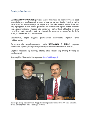 Drodzy słuchacze, Cykl ROZMOWY O BIBLII powstał jako odpowiedź na potrzeby wielu osób poszukujących praktycznej strony wiary w swoim życiu. Istnieje wiele katechizmów, ale trudno je się czyta a w dodatku często niemożliwe jest aby wyciągnąć z nich lekcje pomocne w codziennym życiu. Wraz z moimi współpracownikami staram się omawiać najbardziej aktualne pytania i problemy wierzących – tak by odpowiedzi dane przez rozmówców były praktyczne i łatwe do zrozumienia. Dodatkowo, część i odżywiania. nagrań poświęcono zdrowemu stylowi życia Zachęcam do współtworzenia cyklu ROZMOWY O BIBLII poprzez zadawanie pytań i przesyłanie propozycji tematów które Was nurtują. Chętnie widziani są mówcy, którzy chcą dzielić się Dobrą Nowiną ze słuchaczami. Autor cyklu: Sławomir Szczepaniec, [email protected] Autor (po lewej) z Jarosławem Dzięgielewskim podczas obchodów 100 lecia istnienia zboru Adwentystów Dnia Siódmego w Opolu Lista rozmówców: Mariusz Nachtman - pastor zbór BETEZDA, kościół zielonoświątkowy, Kędzierzyn-Koźle Sławomir Wcisło – pastor zboru w Opolu, Kościół Adwentystów Dnia Siódmego Adam Paletta - lider zbór BETEZDA, kościół zielonoświątkowy, Kędzierzyn-Koźle Adam Małkiewicz – kolor nieznany ale zielonkawy, Liga Biblijna w Polsce Wolfgang Schweder – pastor z USA, Kościół Zielonoświątkowy Tomek Wojszczyk – pastor zbór Nadzieja, kościół zielonoświątkowy, Zdzieszowice Jarosław Dzięgielewski - naczelny prezbiter Kościoła Adwentystów Dnia Siódmego Michał Hydzik - naczelny prezbiter KZ (PRL - RP), pastor senior Marek Kamiński – naczelny prezbiter KZ (obecna kadencja) Leszek Mocha – członek Naczelnej Rady Kościoła, KZ, pastor zboru w Jastrzębiu Lidia Szłowieniec – mgr inż. technologii żywienia, Kościół Adwentystów Dnia Siódmego Bogdan Czarnecki, Jan Ryl, Józef Ryl, Marek i Adam Urban, Andrzej Kaliszczyk, Dawid Stopiński – starsi zborowi, stowarzyszeni w ruchu Badaczy Pisma Świętego Bardzo dziękuję wszystkim którzy uczestniczą w nagraniach i wypełniają zarządzenia pańskie zapisane w Biblii, a odnoszące się do głoszenia Dobrej Nowiny innym: Wielki nakaz misyjny 16 Natomiast jedenastu uczniów, zgodnie z poleceniem Jezusa, udało się do Galilei, na górę. 17 Gdy Go zobaczyli, oddali Mu pokłon, ale niektórzy z nich wciąż jeszcze wątpili. 18 Jezus zbliżył się do nich i powiedział: – Otrzymałem wszelką władzę w niebie i na ziemi. 19 Idźcie więc i pozyskujcie uczniów ze wszystkich narodów, chrzcząc ich w imię Ojca i Syna, i Ducha Świętego. 20 Uczcie ich przestrzegać wszystkiego, co wam poleciłem. Ja zaś będę z wami przez wszystkie dni – aż do końca czasów.