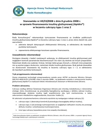 Agencja Oceny Technologii Medycznych Rada Konsultacyjna Stanowisko nr 69/19/2008 z dnia 8 grudnia 2008 r. w sprawie finansowania insuliny glulizynowej (Apidra®) w leczeniu cukrzycy typu 1 oraz 2 Rekomendacja Rada Konsultacyjna1 rekomenduje tymczasowe finansowanie ze środków publicznych insuliny glulizynowej (Apidra®) w leczeniu cukrzycy typu 1 oraz 2, przez okres dwóch lat, pod warunkami: • zebrania danych dotyczących efektywności klinicznej, w odniesieniu do twardych punktów końcowych; • zapewnienia efektywnego kosztowo sposobu finansowania. Uzasadnienie rekomendacji Dostępne dowody z badań naukowych wskazują, że efektywność insuliny glulizynowej pod względem kontroli parametrów biochemicznych nie różni się istotnie od innych preparatów. Natomiast działa ona szybciej i krócej. Istnieje także grupa chorych, u których inne preparaty nie są wystarczająco skuteczne, natomiast działa insulina glulizynowa. Brak jednak dowodów na skuteczność stosowania tej insuliny w leczeniu cukrzycy typu 1 i 2, w odniesieniu do twardych punktów końcowych. Tryb przygotowania rekomendacji Ocena omawianej technologii przeprowadzona została przez AOTM na zlecenie Ministra Zdrowia (MZ-PLE-4650-6132-1/CK/08) z dnia 3 stycznia 2008r., na podstawie wniosku o umieszczenie insuliny glulizynowej (Apidra®) w wykazach leków refundowanych złożonym w Ministerstwie Zdrowia. Problem zdrowotny Cukrzyca według definicji Światowej Organizacji Zdrowia jest chorobą metaboliczną o różnorodnej etiologii, która charakteryzuje się przewlekłą hiperglikemią wynikającą z defektu sekrecji insuliny, nieprawidłowego działania insuliny bądź współistnienia obu tych mechanizmów, a także zaburzeniami metabolizmu węglowodanów, tłuszczów i białka [1]. W zależności od patomechanizmu schorzenia wyróżnia się następujące rodzaje cukrzycy [2]: • cukrzyca typu 1 (destrukcja komórek β powodująca bezwzględny deficyt insuliny), • cukrzyca typu 2 (od przewagi isulinooporności ze względnym deficytem insuliny do przewagi deficytu insuliny i umiarkowanej insulinooporności), • inne typy cukrzycy (wywołane przez inne zespoły chorobowe), 1 Rada Konsultacyjna działa na podstawie zarządzenia Ministra Zdrowia z dnia 30 czerwca 2006 r. w sprawie Agencji Oceny Technologii Medycznych z późniejszymi zmianami. Agencja Oceny Technologii Medycznych Al. Lotników 22, 02-668 Warszawa tel. +48 22 56 67 200 fax +48 22 56 67 202 e-mail: [email protected] www.aotm.gov.pl Stanowisko Rady Konsultacyjnej AOTM nr 69/19/2008 z dnia 8 grudnia 2008 r. • cukrzyca ciężarnych (GDM). Obecnie w Polsce żyje ponad 2 miliony ludzi chorych na cukrzycę. Szacowany współczynnik chorobowości wynosi 9% w populacji osób powyżej 20 r. ż. Dane wskazują, że ok. 30-40% nie jest wciąż zdiagnozowanych, natomiast u ponad 4 milionów ludzi mogą występować stany przedcukrzycowe. 90% przypadków stanowi cukrzyca typu 2 [3]. Według danych GUS w populacji powyżej 14. r. ż. cukrzycę ma 4,1% kobiet i 3,4% mężczyzn, co daje około 1,3 mln chorych. Obecna standardowa terapia Preparaty konwencjonalnej insuliny krótko działającej oraz analogi szybko działające – NovoRapid® i Humalog®. [4,5] Proponowana terapia Insulina glulizynowa jest rekombinowanym analogiem insuliny ludzkiej, który charakteryzuje się taką samą mocą działania, jak zwykła insulina ludzka. Insulina glulizynowa charakteryzuje się wcześniejszym początkiem i krótszym czasem działania niż zwykła insulina ludzka. Podstawowe działanie insulin i ich analogów, w tym także insuliny glulizynowej, polega na regulacji metabolizmu glukozy. Insulina obniża poziom glukozy we krwi poprzez pobudzanie obwodowego wychwytu glukozy, szczególnie w obrębie mięśni szkieletowych i tkanki tłuszczowej oraz poprzez hamowanie wytwarzania glukozy w wątrobie. Insulina hamuje lipolizę w komórkach tłuszczowych, hamuje proteolizę i zwiększa syntezę białek [6]. Skuteczność proponowanej terapii Insulina glulizynowa w analizie skuteczności klinicznej przedstawionej przez wnioskodawcę miała podobną skuteczność w zakresie średniej zmiany hemoglobiny glikowanej A1c (HbA1c) w odniesieniu do wartości wyjściowej, w porównaniu z innymi krótkodziałającymi analogami insuliny w cukrzycy typu 1 (insulina lisrpro [7]oraz insulina ludzka [8]). Wykazano, że stosowanie insuliny glulizynowej w cukrzycy typu 2, wiąże się ze statystycznie istotnym obniżeniem HbA1c w okresie 26 tygodni [9], w porównaniu do insuliny ludzkiej (RHI), a także że mają one porównywalną skuteczność pod względem kontroli glikemii [10]. Bezpieczeństwo terapii W oparciu o analizę bezpieczeństwa przedstawioną przez wnioskodawcę nie stwierdzono statystycznie istotnych różnic pomiędzy insuliną glulizynowa, a analizowanymi opcjami terapeutycznymi odnośnie ryzyka wystąpienia zarówno hipoglikemii objawowej, ciężkiej, jak i nocnej. W jednym z badań przeprowadzonym na grupie 890 pacjentów z cukrzycą typu 2 wykazano znamienną różnicę pomiędzy analizowanymi opcjami terapeutycznymi na korzyść insuliny glulizynowej, względem krótkodziałającej insuliny ludzkiej, w zakresie występowania epizodów nocnych hipoglikemii [10]. Koszty terapii i wpływ na budżet płatnika Wnioskodawca w analizie ekonomicznej wykazał, że przy limicie refundacji ustalonym na poziomie 100,49 zł stosowanie insuliny glulizynowej wiąże się w analizie podstawowej dla płatnika publicznego z takim samym kosztem, jak stosowanie neutralnej insuliny ludzkiej oraz innych szybkodziałających analogów insuliny. W analizie podstawowej stosowanie insuliny glulizynowej jest rozwiązaniem droższym dla pacjenta w stosunku do stosowania insuliny ludzkiej (xxx zł), zaś tańszym w stosunku do szybkodziałających analogów insuliny (NovoRapid®, Humalog® - odpowiednio xxx zł i xxx zł). Wnioskodawca przedstawił analizę wrażliwości ustalając limit refundacji