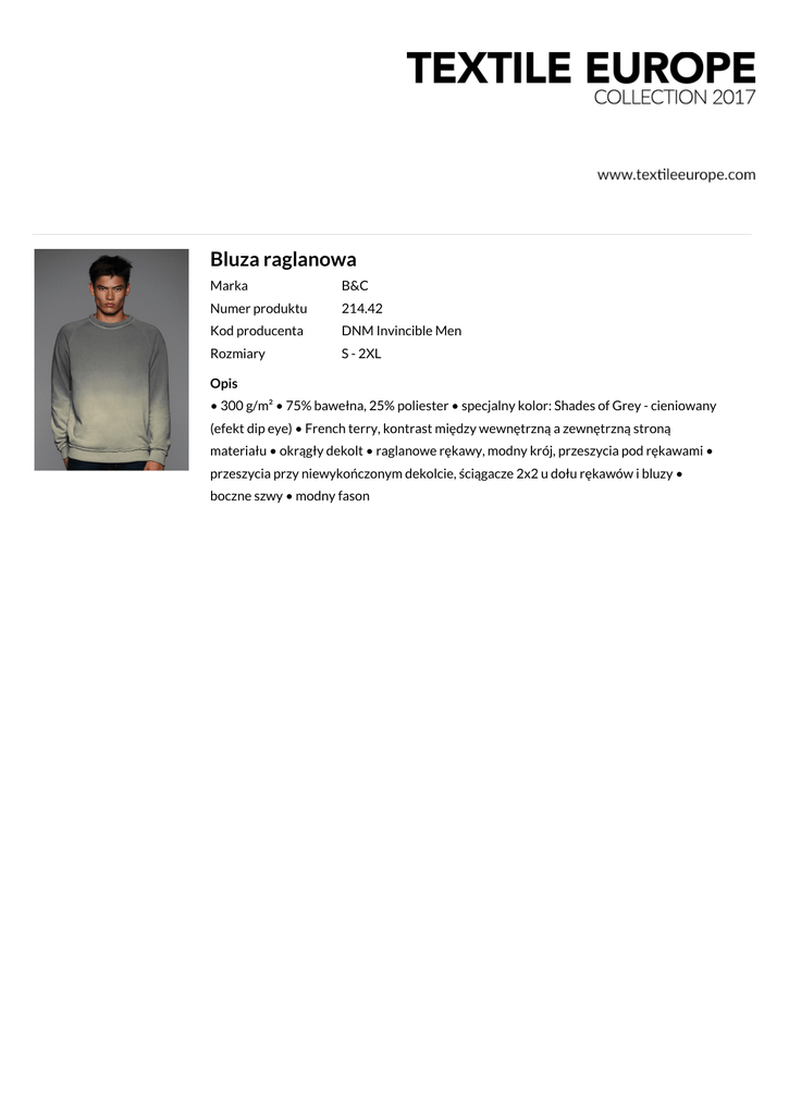 Bluza raglanowa Marka B&C Numer produktu 214.42 Kod producenta DNM Invincible Men Rozmiary S - 2XL Opis • 300 g/m² • 75% bawełna, 25% poliester • specjalny kolor: Shades of Grey - cieniowany (efekt dip eye) • French terry, kontrast między wewnętrzną a zewnętrzną stroną materiału • okrągły dekolt • raglanowe rękawy, modny krój, przeszycia pod rękawami • przeszycia przy niewykończonym dekolcie, ściągacze 2x2 u dołu rękawów i bluzy • boczne szwy • modny fason
