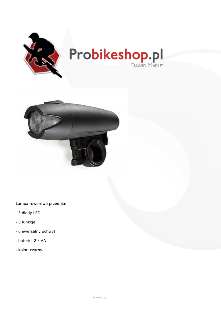 Lampa rowerowa przednia: - 3 diody LED - 3 funkcje - uniwersalny uchwyt - baterie: 2 x AA - kolor: czarny Strona 1 z 1