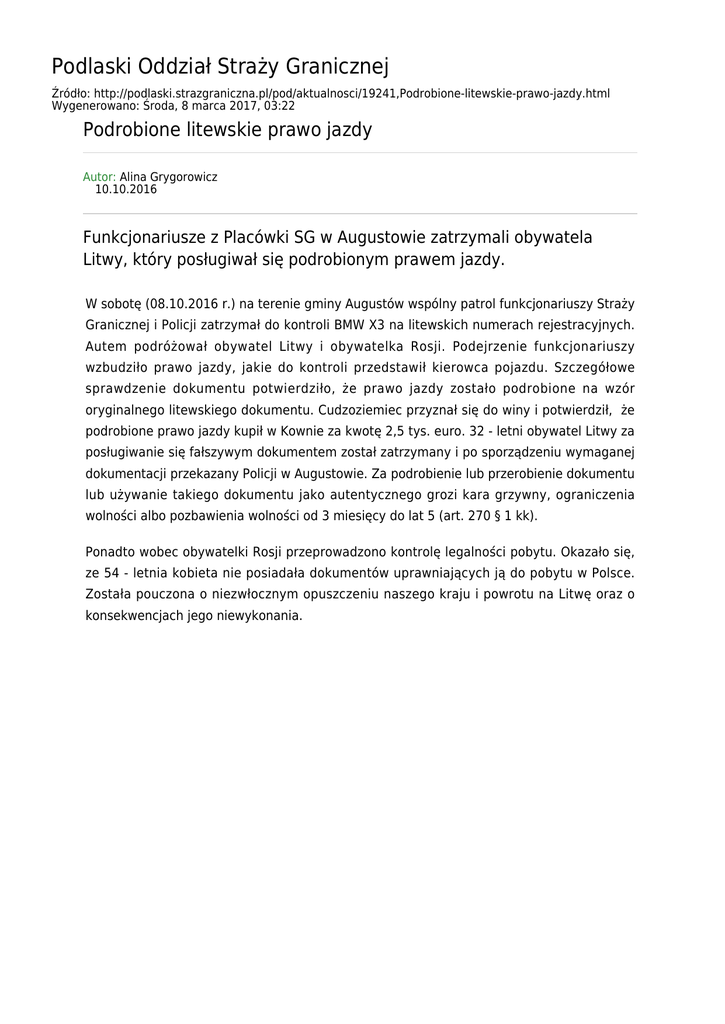 Podlaski Oddział Straży Granicznej Źródło: http://podlaski.strazgraniczna.pl/pod/aktualnosci/19241,Podrobione-litewskie-prawo-jazdy.html Wygenerowano: Środa, 8 marca 2017, 03:22 Podrobione litewskie prawo jazdy Autor: Alina Grygorowicz 10.10.2016 Funkcjonariusze z Placówki SG w Augustowie zatrzymali obywatela Litwy, który posługiwał się podrobionym prawem jazdy. W sobotę (08.10.2016 r.) na terenie gminy Augustów wspólny patrol funkcjonariuszy Straży Granicznej i Policji zatrzymał do kontroli BMW X3 na litewskich numerach rejestracyjnych. Autem podróżował obywatel Litwy i obywatelka Rosji. Podejrzenie funkcjonariuszy wzbudziło prawo jazdy, jakie do kontroli przedstawił kierowca pojazdu. Szczegółowe sprawdzenie dokumentu potwierdziło, że prawo jazdy zostało podrobione na wzór oryginalnego litewskiego dokumentu. Cudzoziemiec przyznał się do winy i potwierdził, że podrobione prawo jazdy kupił w Kownie za kwotę 2,5 tys. euro. 32 - letni obywatel Litwy za posługiwanie się fałszywym dokumentem został zatrzymany i po sporządzeniu wymaganej dokumentacji przekazany Policji w Augustowie. Za podrobienie lub przerobienie dokumentu lub używanie takiego dokumentu jako autentycznego grozi kara grzywny, ograniczenia wolności albo pozbawienia wolności od 3 miesięcy do lat 5 (art. 270 § 1 kk). Ponadto wobec obywatelki Rosji przeprowadzono kontrolę legalności pobytu. Okazało się, ze 54 - letnia kobieta nie posiadała dokumentów uprawniających ją do pobytu w Polsce. Została pouczona o niezwłocznym opuszczeniu naszego kraju i powrotu na Litwę oraz o konsekwencjach jego niewykonania.